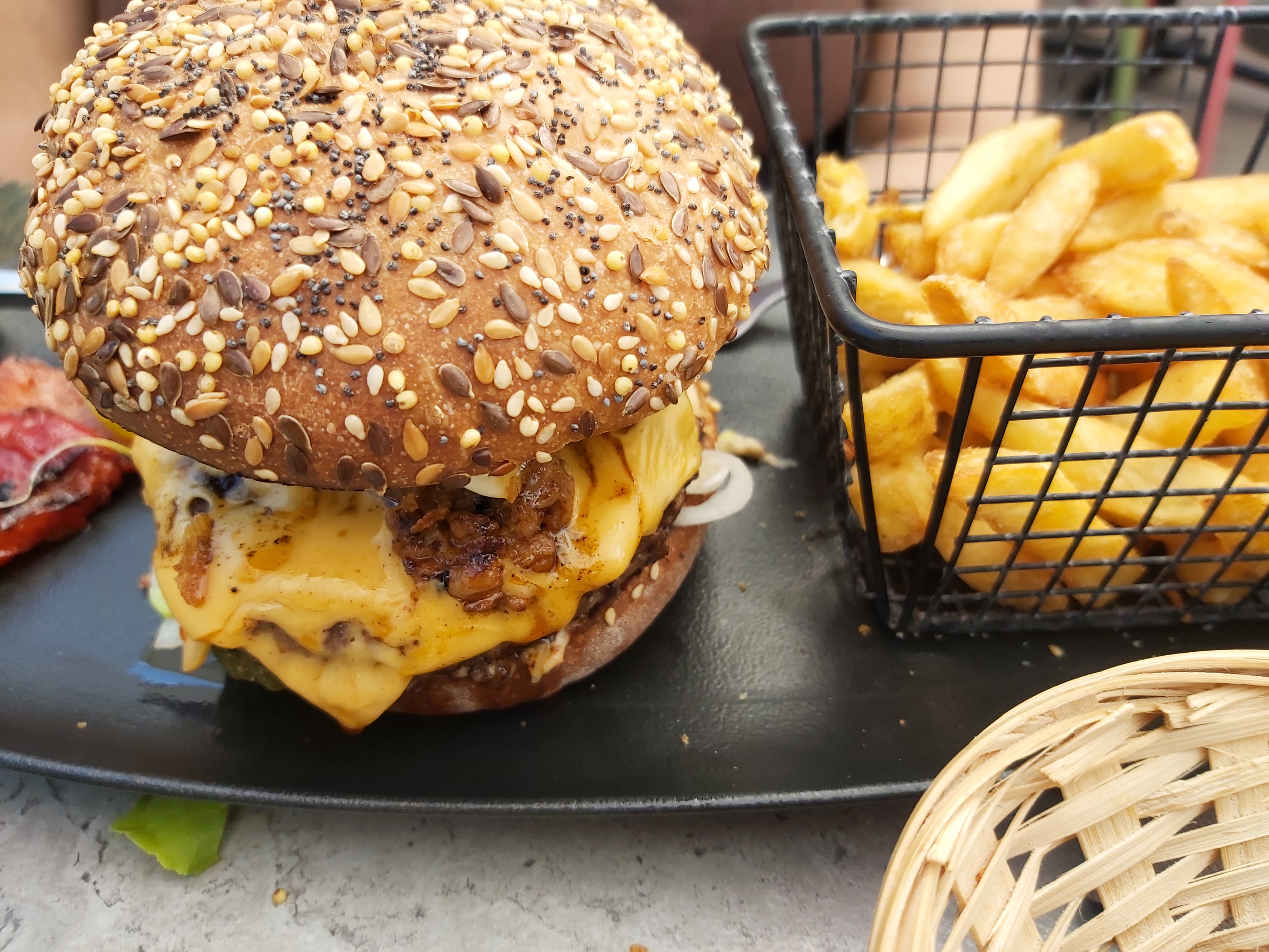 Burger très bon, on a plus faim après. Par contre, très peu de frites. Photo prise avant d’en manger une. Le remplissage des frites dans les barquettes était très variable entre les personnes autour de moi. Certaines étaient remplies à ras bord, et d’autres comme moi. (Note au propriétaire : utilisez peut-être des barquettes plus petites et remplissez-les jusqu’en haut, sinon l’effet ressenti d’avoir une grande barquette avec un faible remplissage de frites n’est pas très bon. On a l’impression que vous grattez sur les frites. Je pense quand même qu’il en manquait un peu quand même pour en avoir suffisamment 😁) Mais cela ne nous empêchera pas de revenir 👍🏼 c’était très bon, juste plus de frites la prochaine fois !