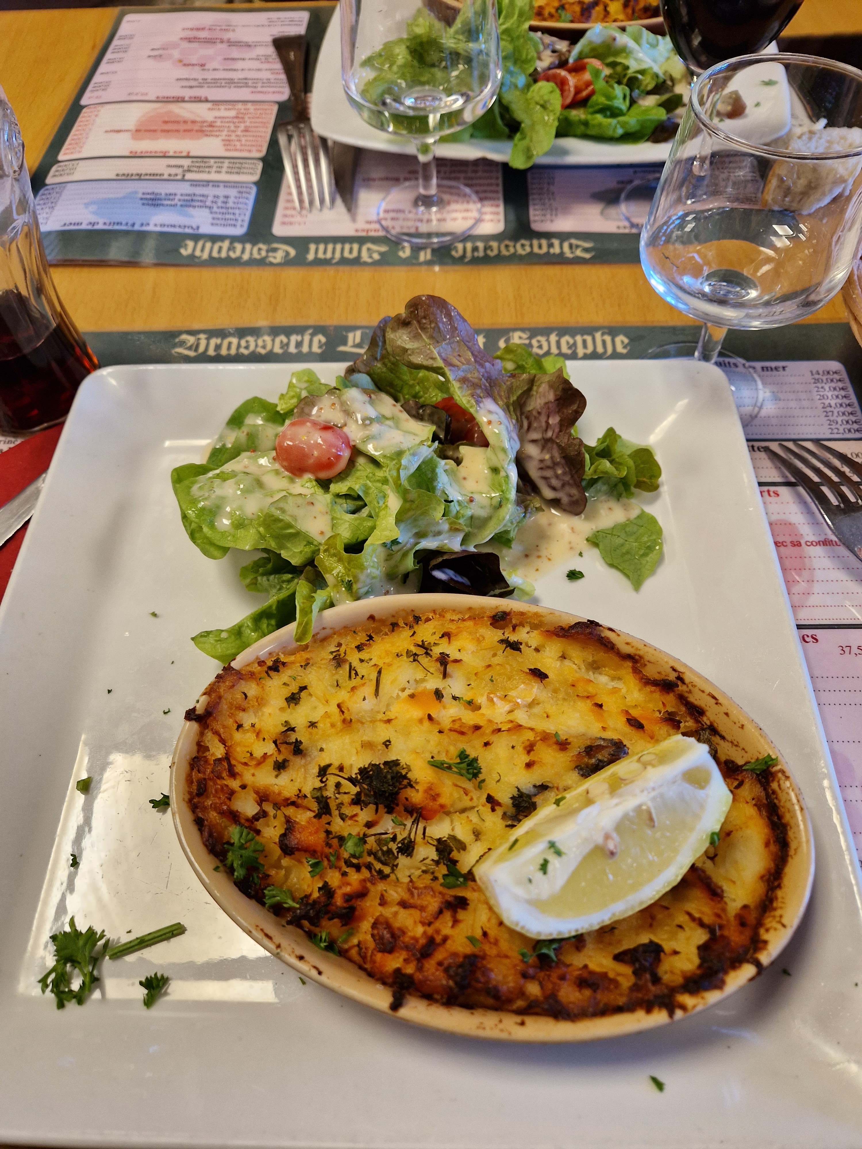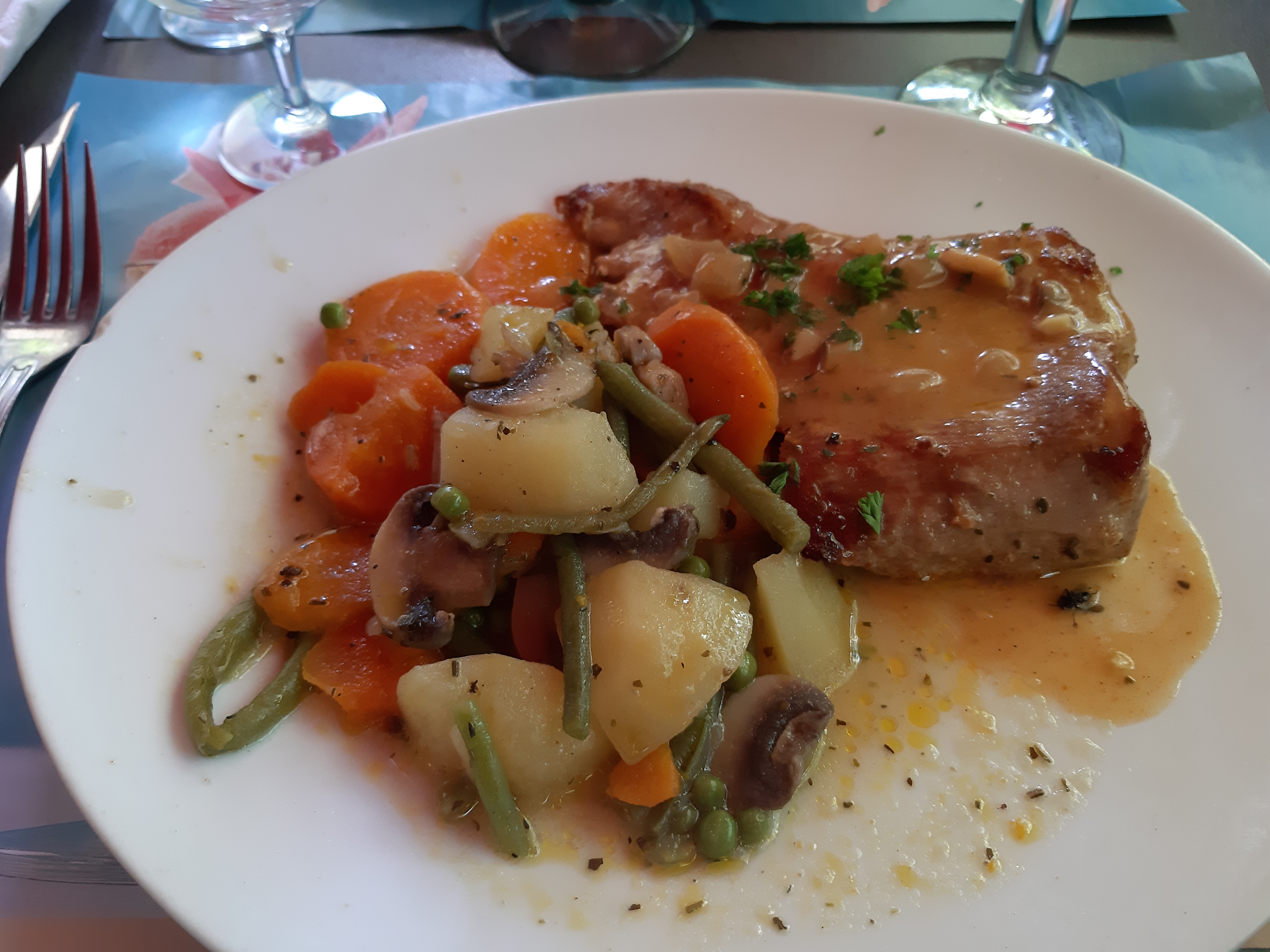 Repas du soir excellent, escalope st estephe très bonne, surtout la sauce, puis la tarte tatin fond dans la bouche. Ambiance conviviale.