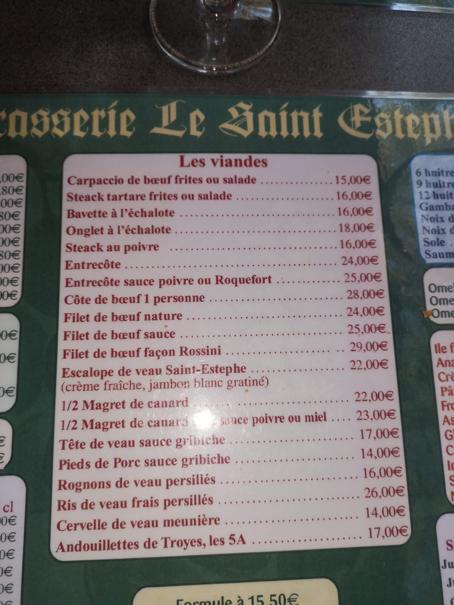 Excellent restaurant, prix très correct avec également de nombreux plat de tripiers rognons, riz de veau, cervelle, pieds de porc. Plus le menu du jour est à 15,50 Euros pour deux plats.