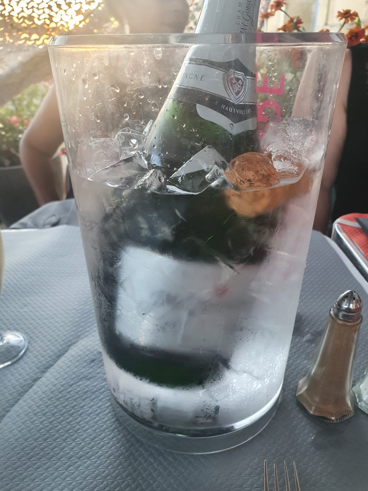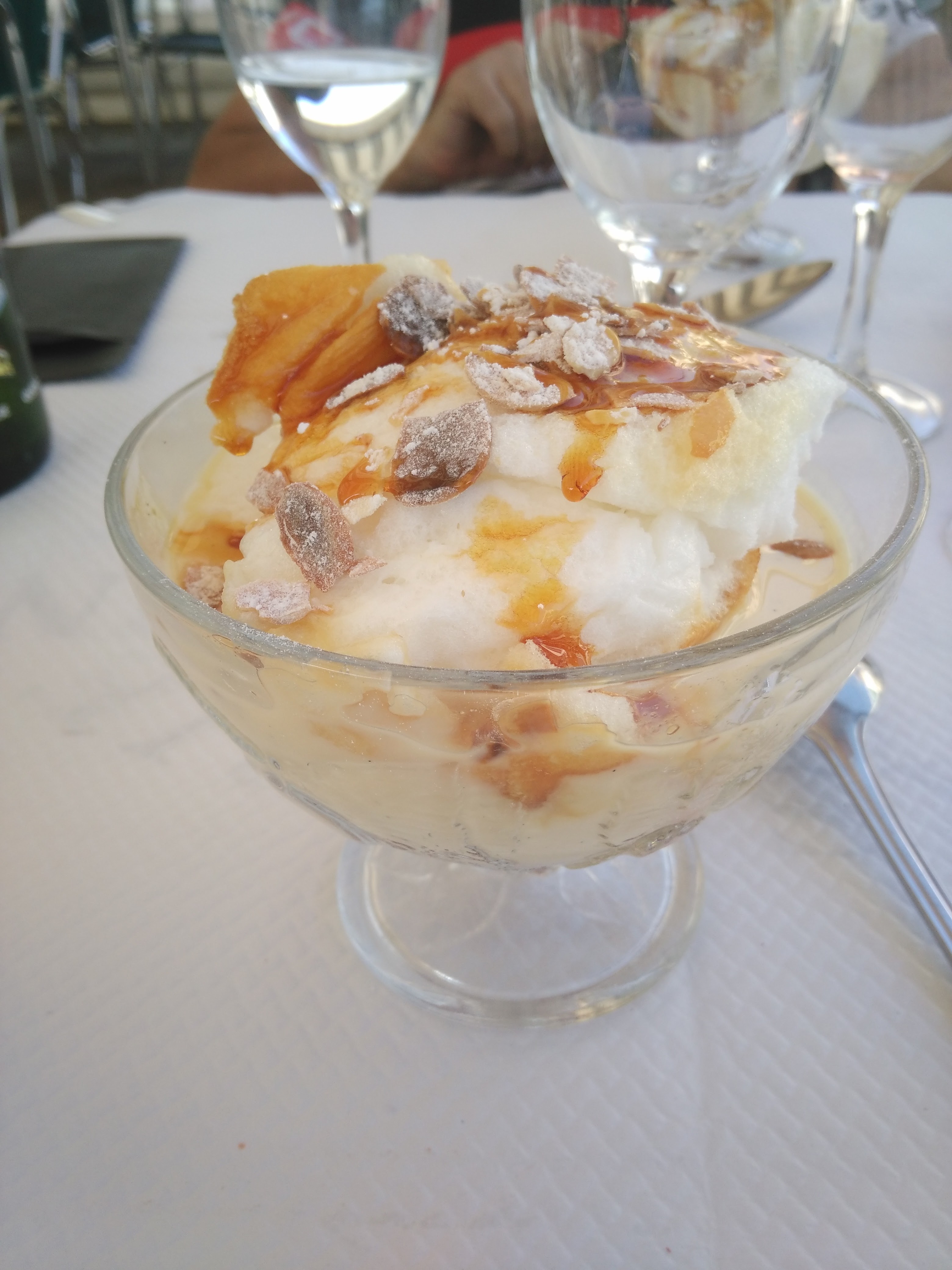 Oui. J’avais bien vu les prix des entrées à 15€. Plus cher qu’une entrée à Paris. Innocemment je me suis dit : les produits doivent être excellents. En juin, on n’est pas dans la haute saison de la tomate. Donc doublement maso, je prends des tomates avec buffala. Et une autre entrée tataki de bœuf. Les 2 plats avaient le même goût : assaisonnement identique. Une vinaigrette sur les tomates (pourquoi pas) et une buffala sans goût. Le point positif c’est que les profiteroles étaient nappées de chocolat chaud. Bref. Un prix élevé, pourquoi pas. On est prévenu. C’est écrit. Mais en général c’est justifié par un lieu exceptionnel, des produits d’une qualité exceptionnel, un tour de main exceptionnel, un prix du loyer élevé. Mais là, je m’interroge encore.