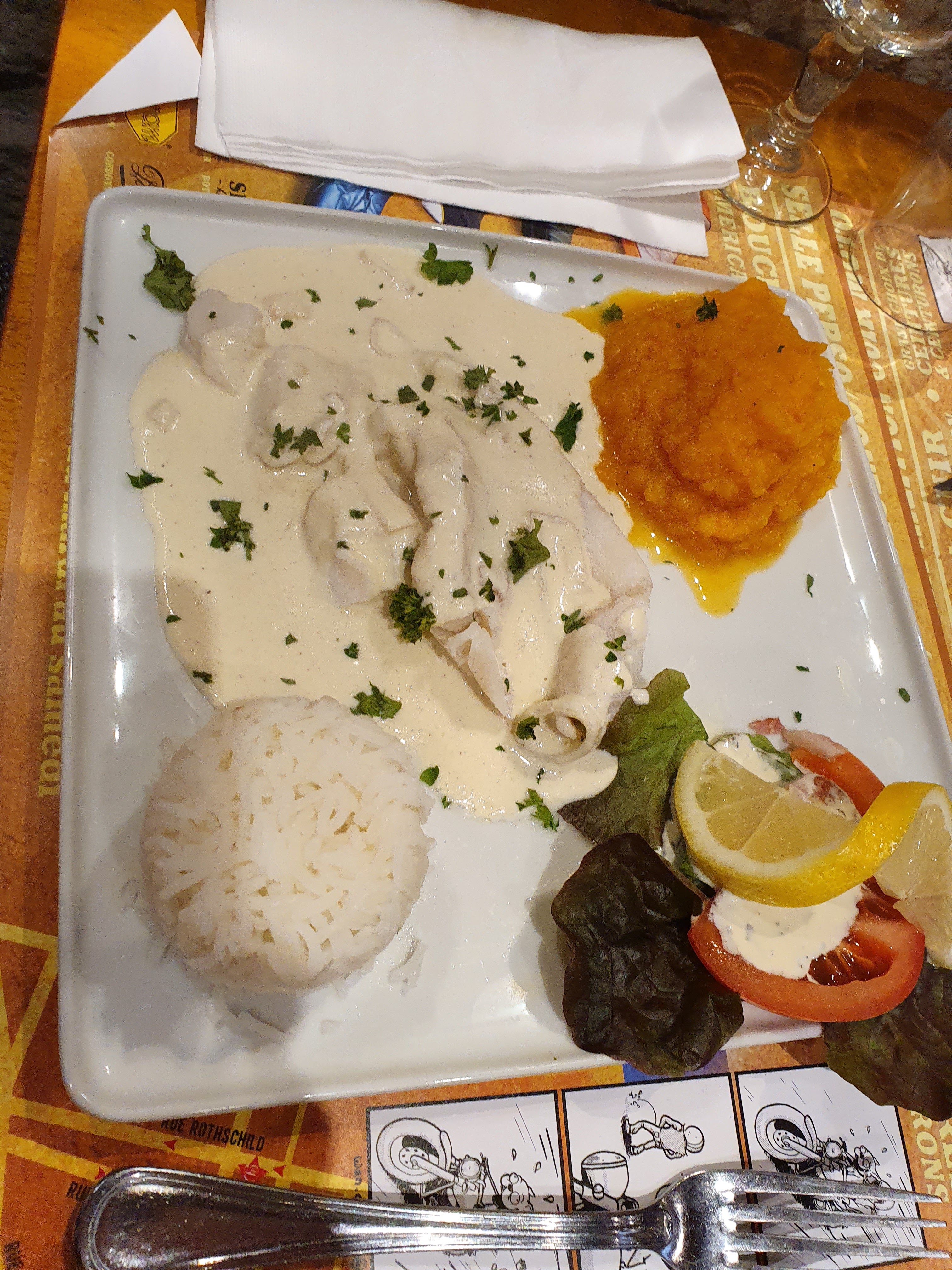 La carte annonçait un beau menu choix fait pour un filet de dorade sauce comlombo gratin de choux fleur gratiné. La surprise a été de découvrir un gratin rechauffé sûrement du midi vu la couleur sans forme dans l assiette. Heureusement le poisson était correct. Ensuite prix des boissons et dessert relativement chers. Déçue