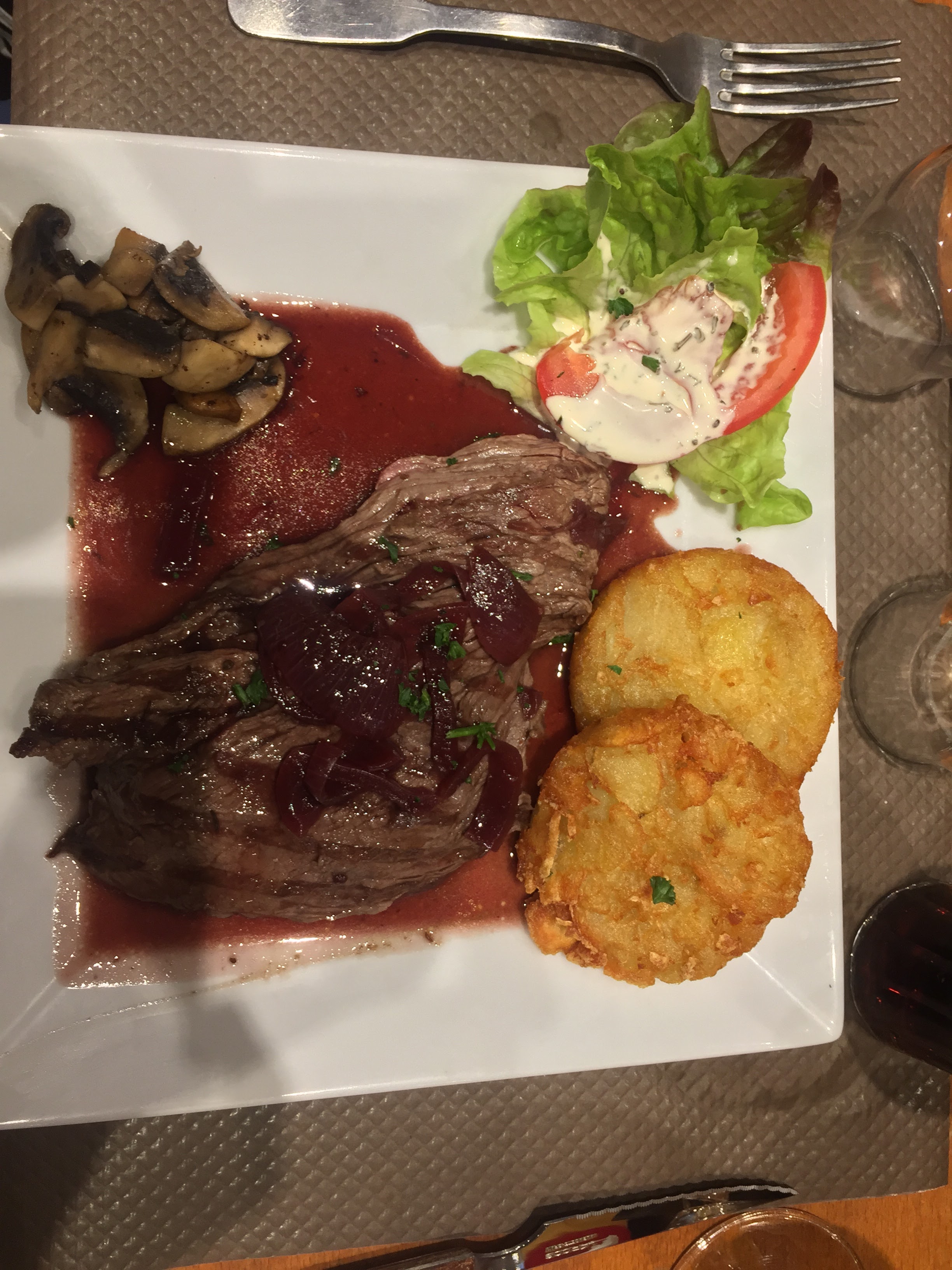 Quelle déception! Le bourguignon était franchement pas bon ,avec une sauce très particulière en tout cas pas une sauce au vin. Des frites pas bonnes du tout pour un prix très cher...noys avons signifié notre mécontentement pas sûre que cela est fait quelque chose . Vraiment dommage ...