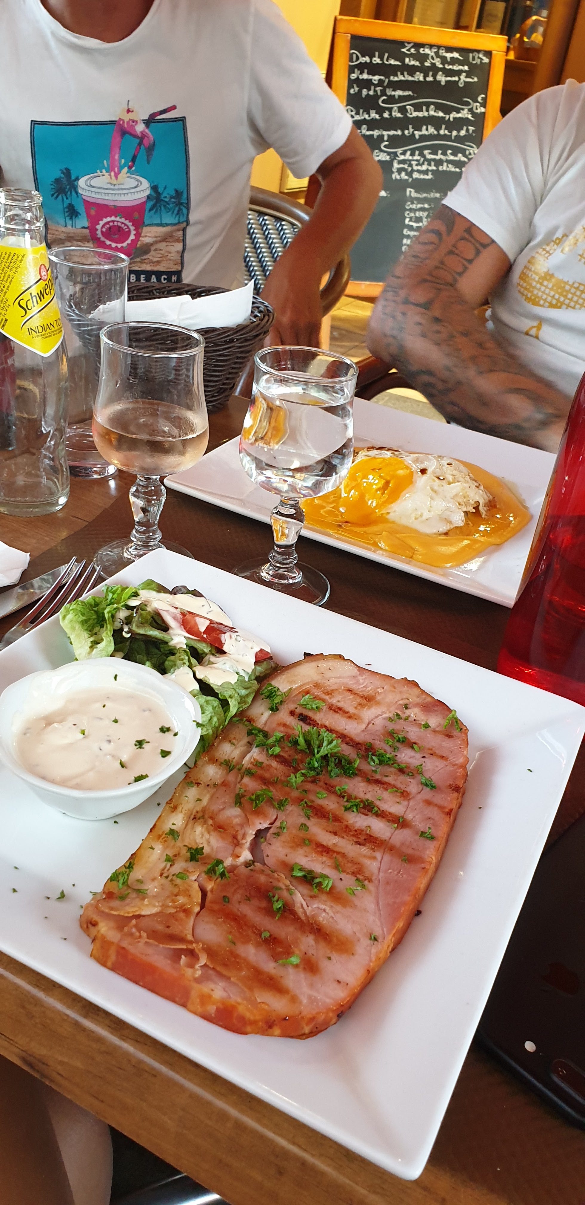 Nous avons mangé moi et mon épouse, un plat du jour poisson et moi des moules,ce n'était vraiment pas terribles Les moules n'étaient pas bien cuites et le poisson très fade. Je n'y retournerai plus