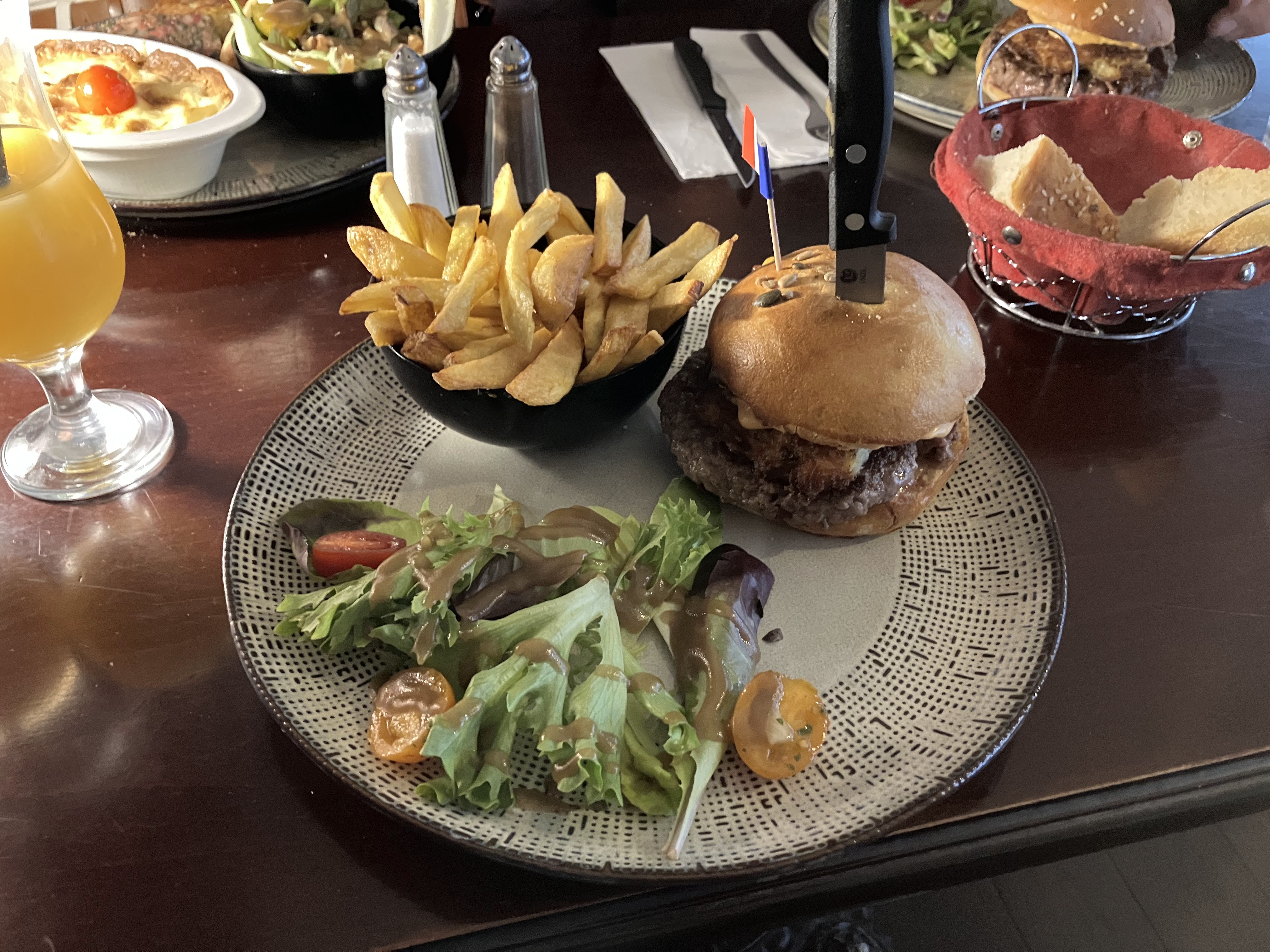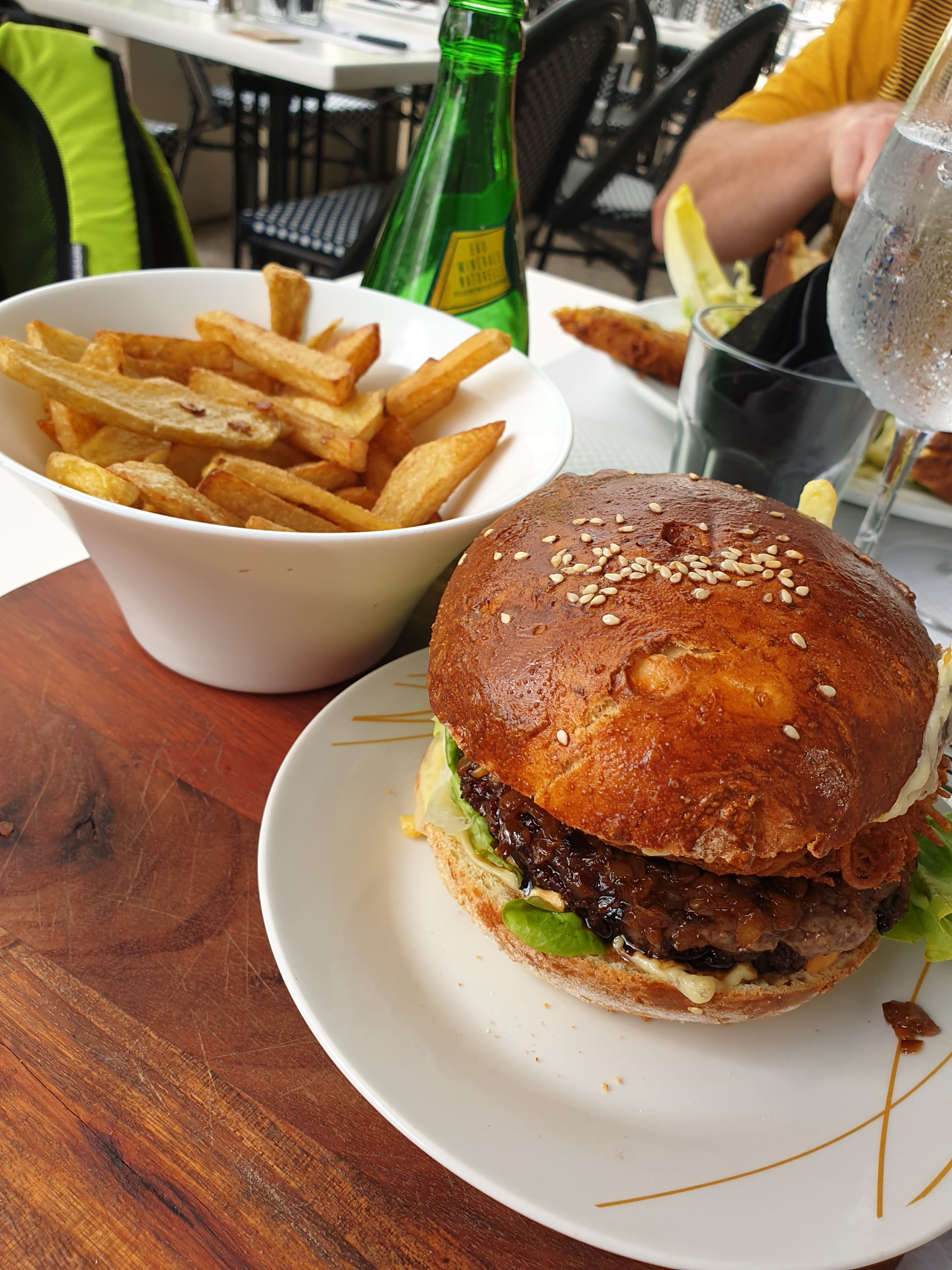 La bavette était dure comme du caoutchouc (de la mauvaise viande sans aucun doute) et la sauce au poivre dans laquelle elle baignait était aussi insipide qu’écœurante… Le burger avait l’air bien meilleur — et j’entendis même une dame dire que son plat était très bon… Je n’ai sûrement pas eu de chance. Je mets 5 étoiles pour le service, impeccable. La limite de la carte à 6€ n’était cependant pas une bonne surprise.