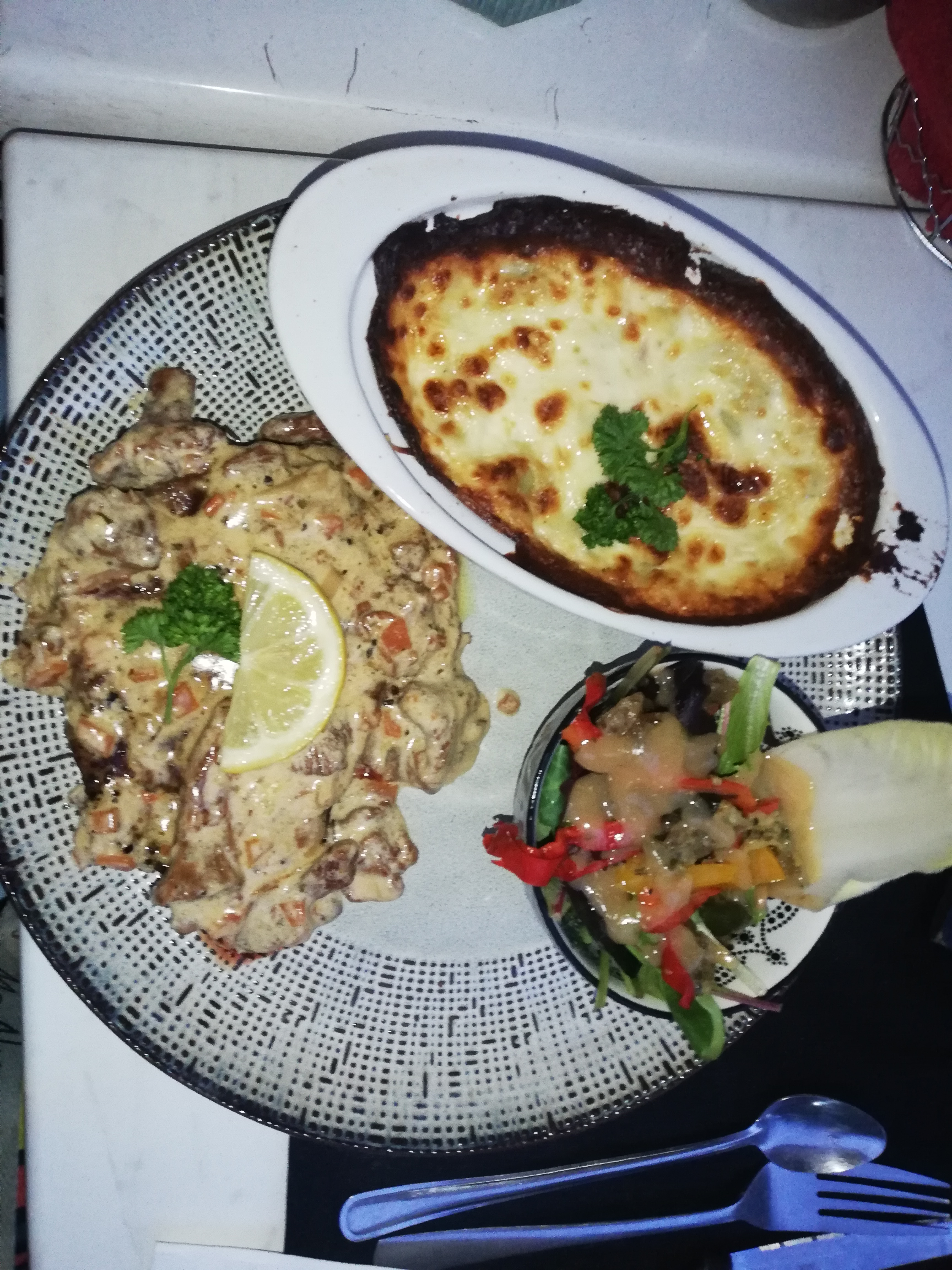 Très bon restaurant ; prix convenable assiette très généreuse peut être un peu trop pour les profiteroles ; seul bémol la sauce au chocolat des profiteroles qui était trop trop liquide mais sinon parfait on reviendra !