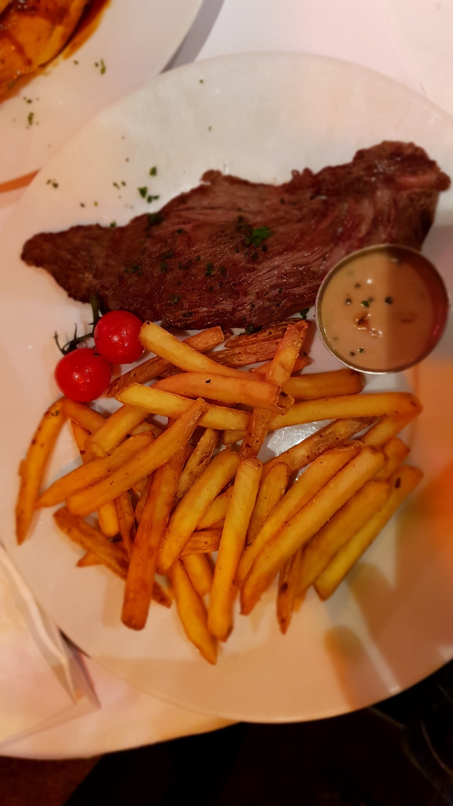 L’endroit est bien situé, table assez petite, mais cela reste correct, très propre, le serveur un peu speed, mais sympa. Je n’ai pas eu à attendre longtemps pour être servi. Mais s’il vous plaît, parlons de la quantité un mini steak, des frites au début très bonne, mais ce n’est que la surface, entre les frites noire, je ne parle pas de frite cramée. Et les prix sont aberrants, une assiette à 17 euros. j’ai encore faim. Bref, je ne pense pas revenir pour avoir presque 25 euros entre bière et assiette et repartir sur ma faim.