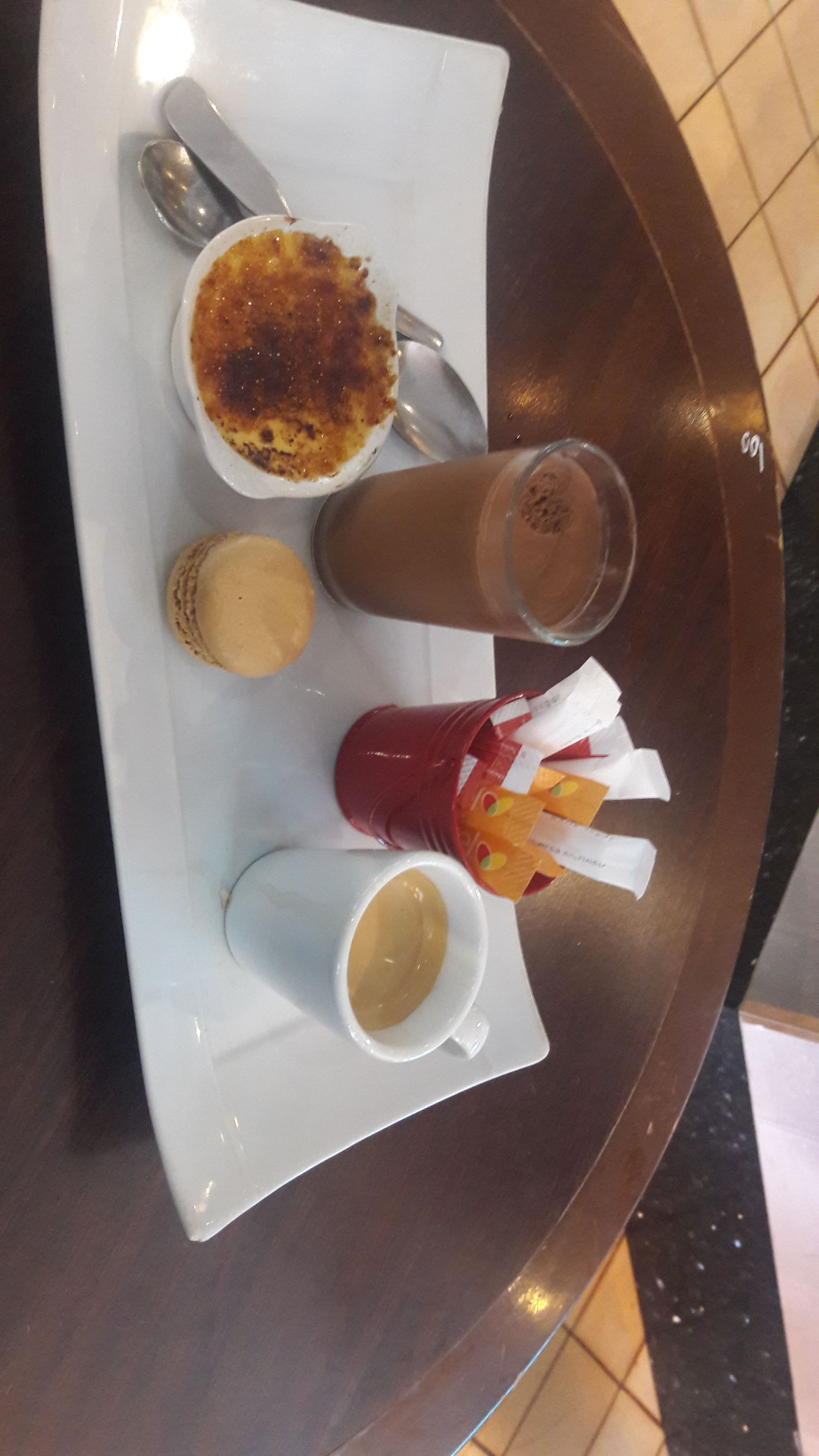 Je témoin suite à la dégustation d'un café dit gourmand qui coute presque 11e. Ce dernier, comme montre l'image, contient un pauvre macaron qui semble être un produit congelé, une mousse au chocolat pas bonne et un verre plein de sucre :( Pour résumé, je suis déçue et je ne recommande pas cette adresse pour un cafe gourmand.
