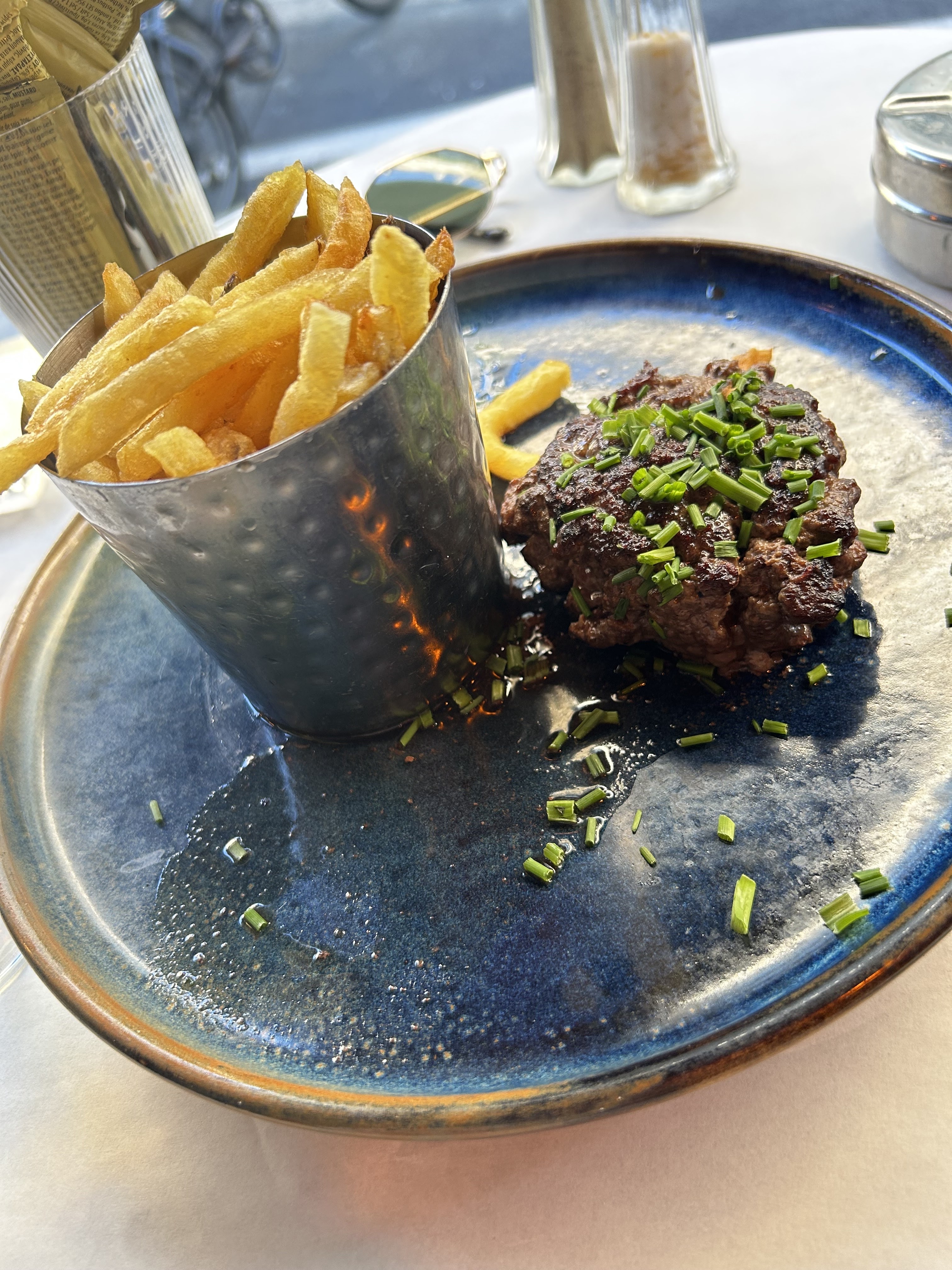 Bonne adresse pour la pause déjeuner. Steak savoureux. Petite brasserie en face du métro Solférino, boulevard saint Germain.