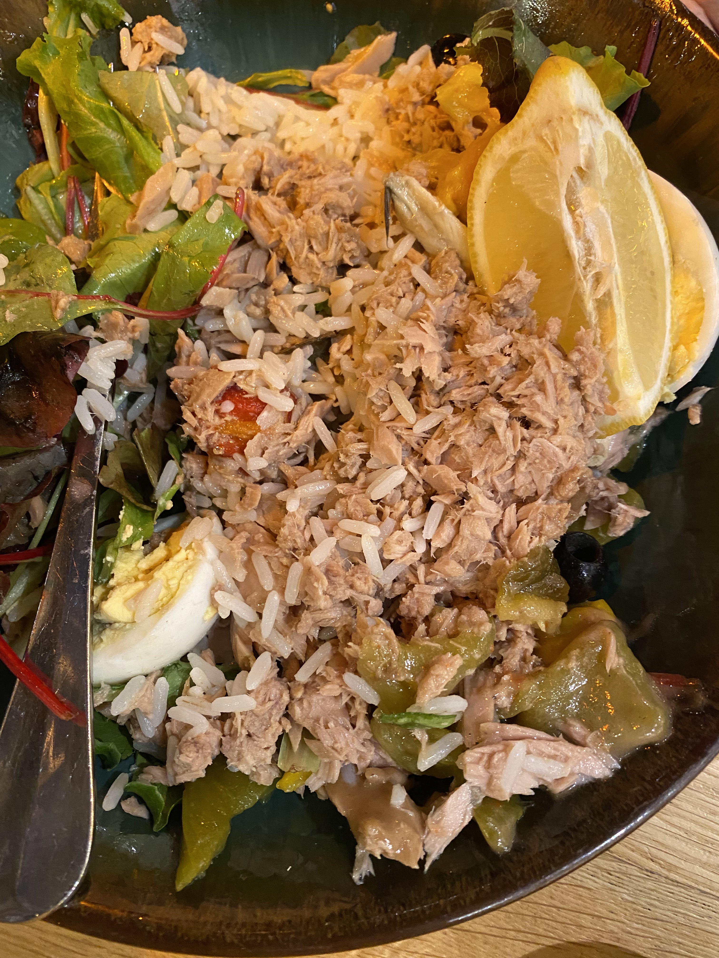 J’ai commandé une salade avec des haricots verts et des tomates que j’ai faite renvoyer : on aurait dit les derniers restes du frigo. Le saumon était froid et cru à l’intérieur bien que j’ai demandé à ce qu’il soit bien cuit.