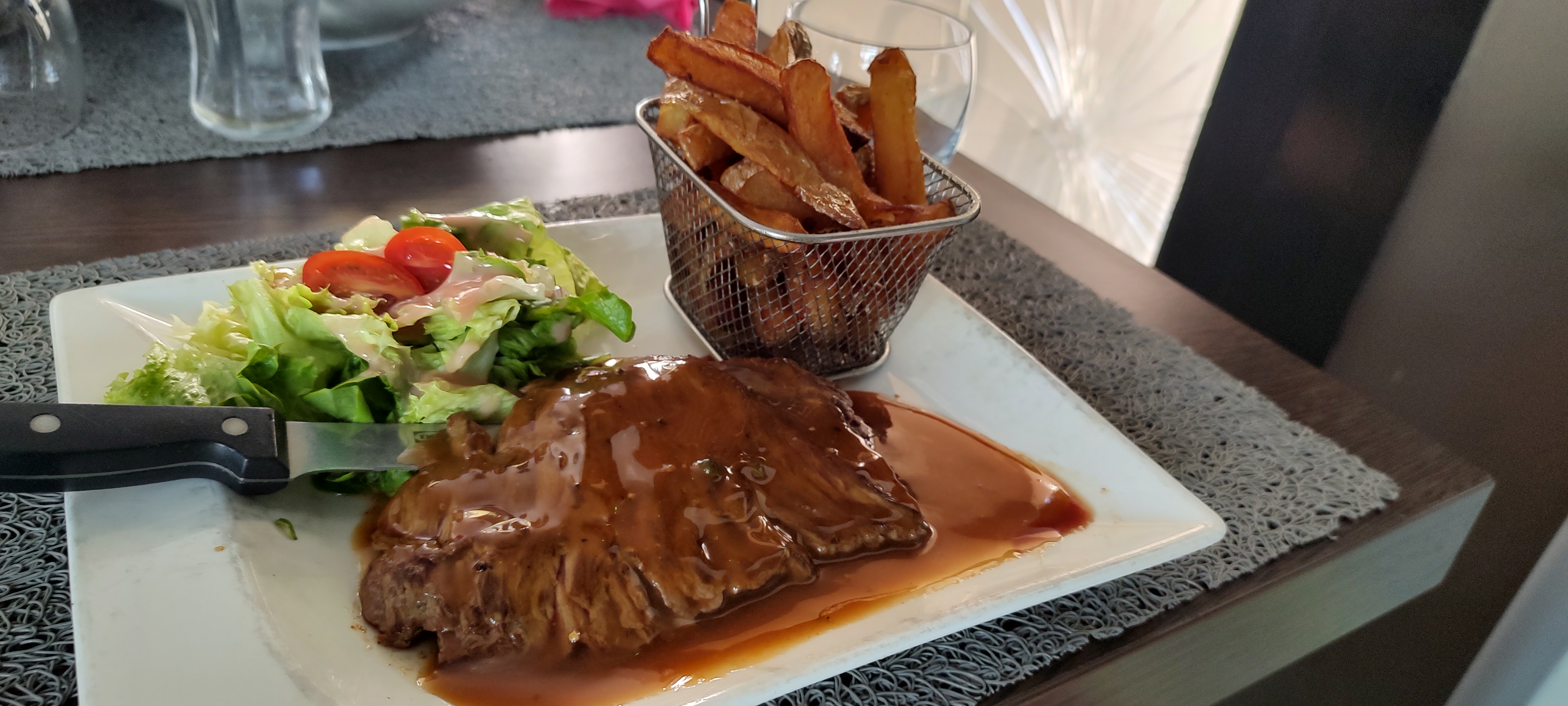 Vraiment pas bien. Temps d'attente pour être servi terriblement long. La serveuse avait oublié la commande de l'apéritif. Une fois rappelé, encore 1/4 d'heure d'attente! Frites maison, oui mais bronzées au point de ne pas être mangeables. Comment un cuisinier peut'il laisser partir des frites comme cela!Bière sans bulles donc fond de cuve. Dessert: 3 boules de glace sans aucune préparation à 5,50€! Dommage, avec un peu de soins et d'attention, ça changerait tout!
