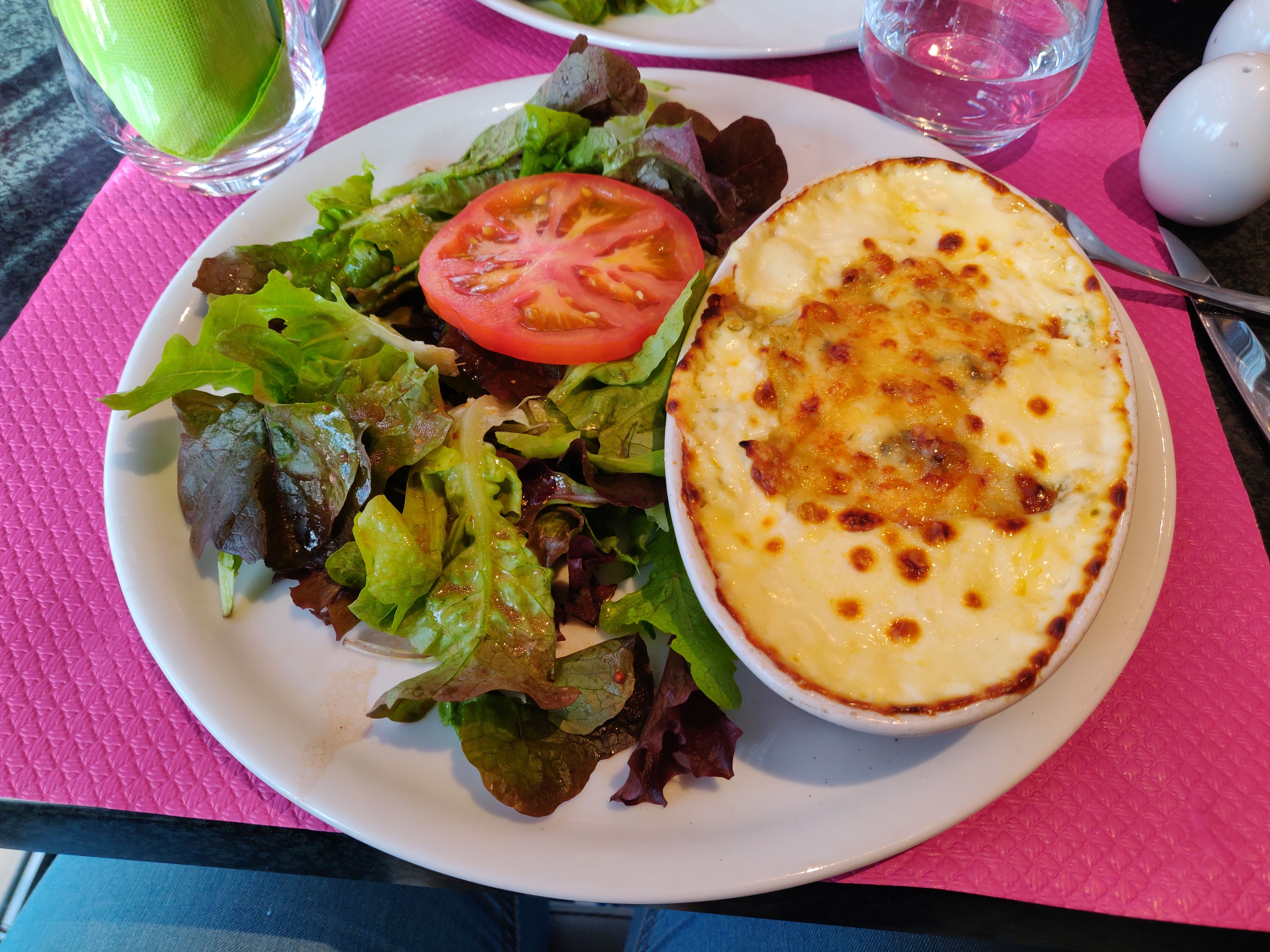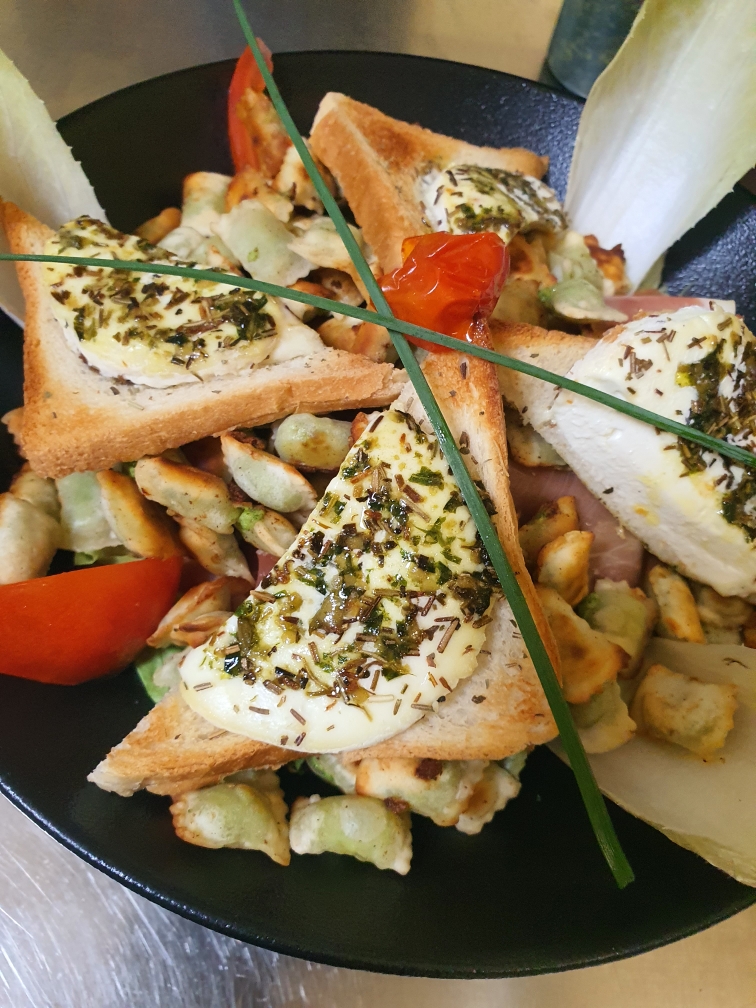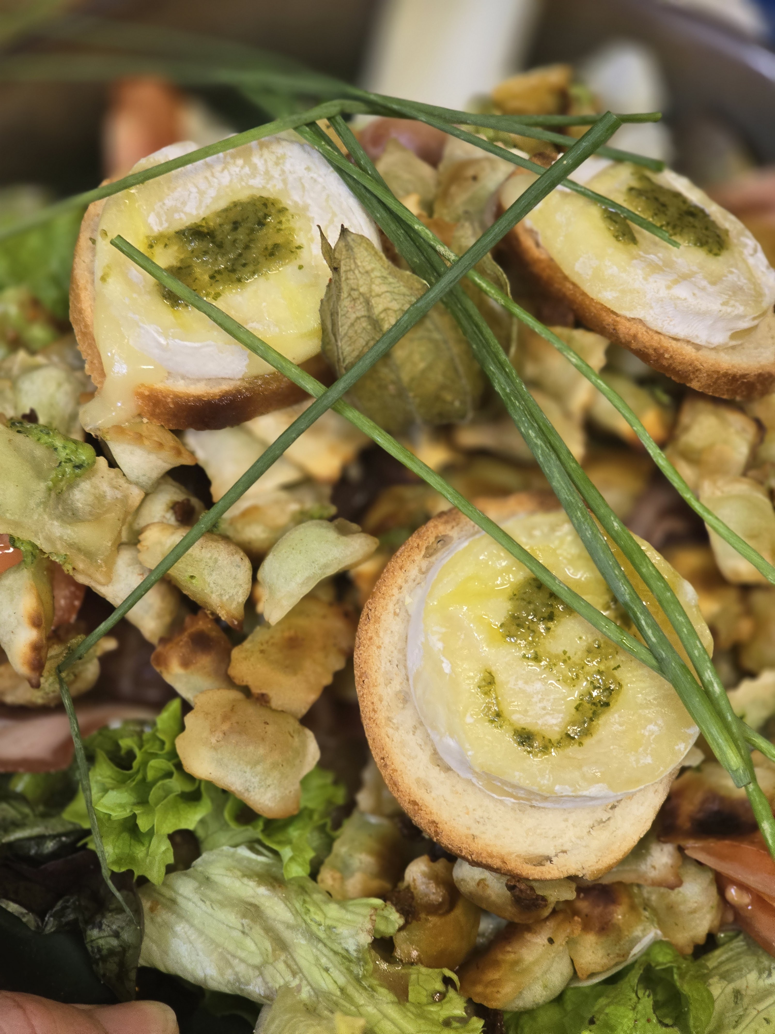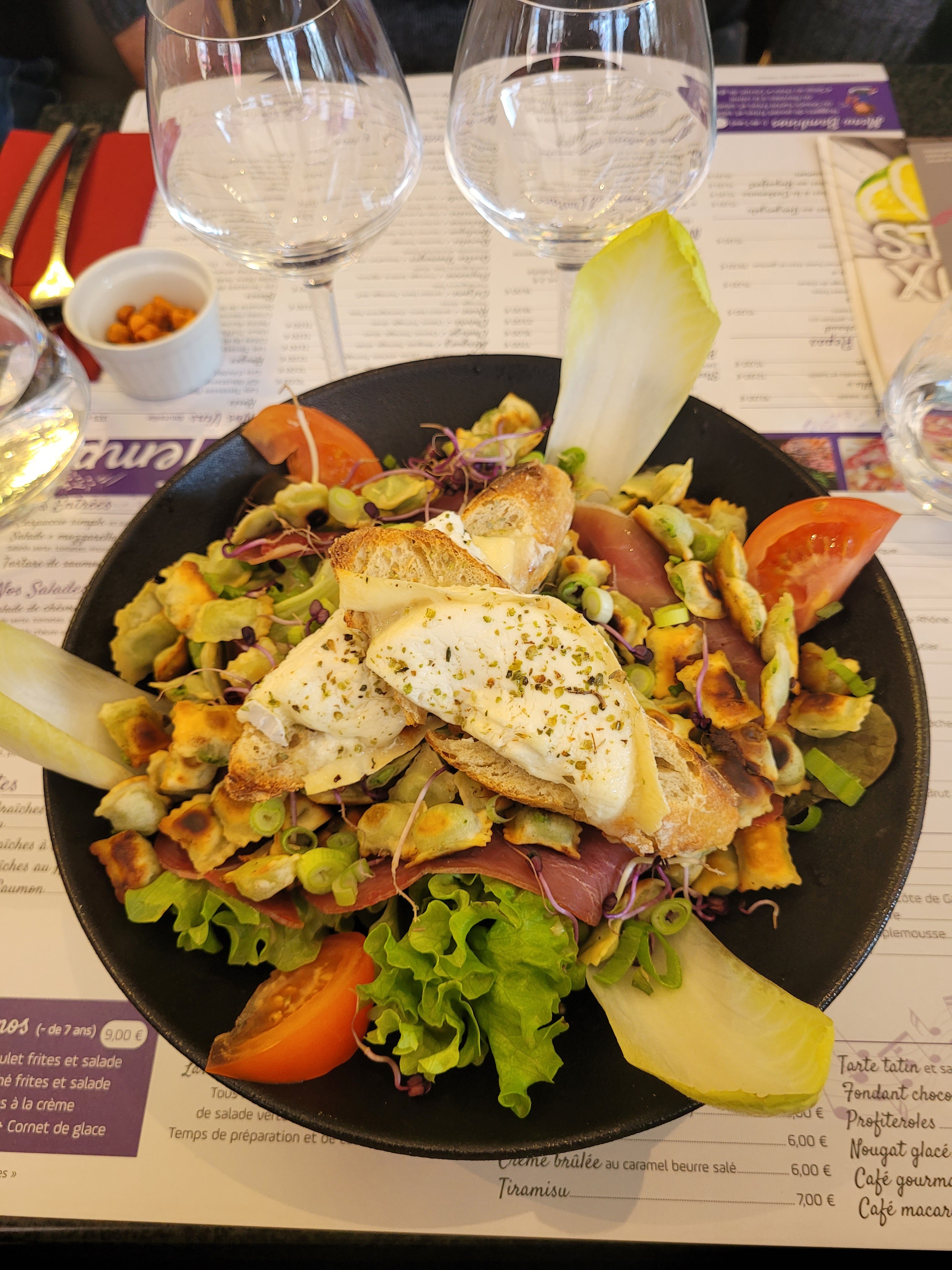 Les ravioles au roquefort étaient très bonnes. Beaucoup de salade dans l'assiette ! Desserts un peu cher..