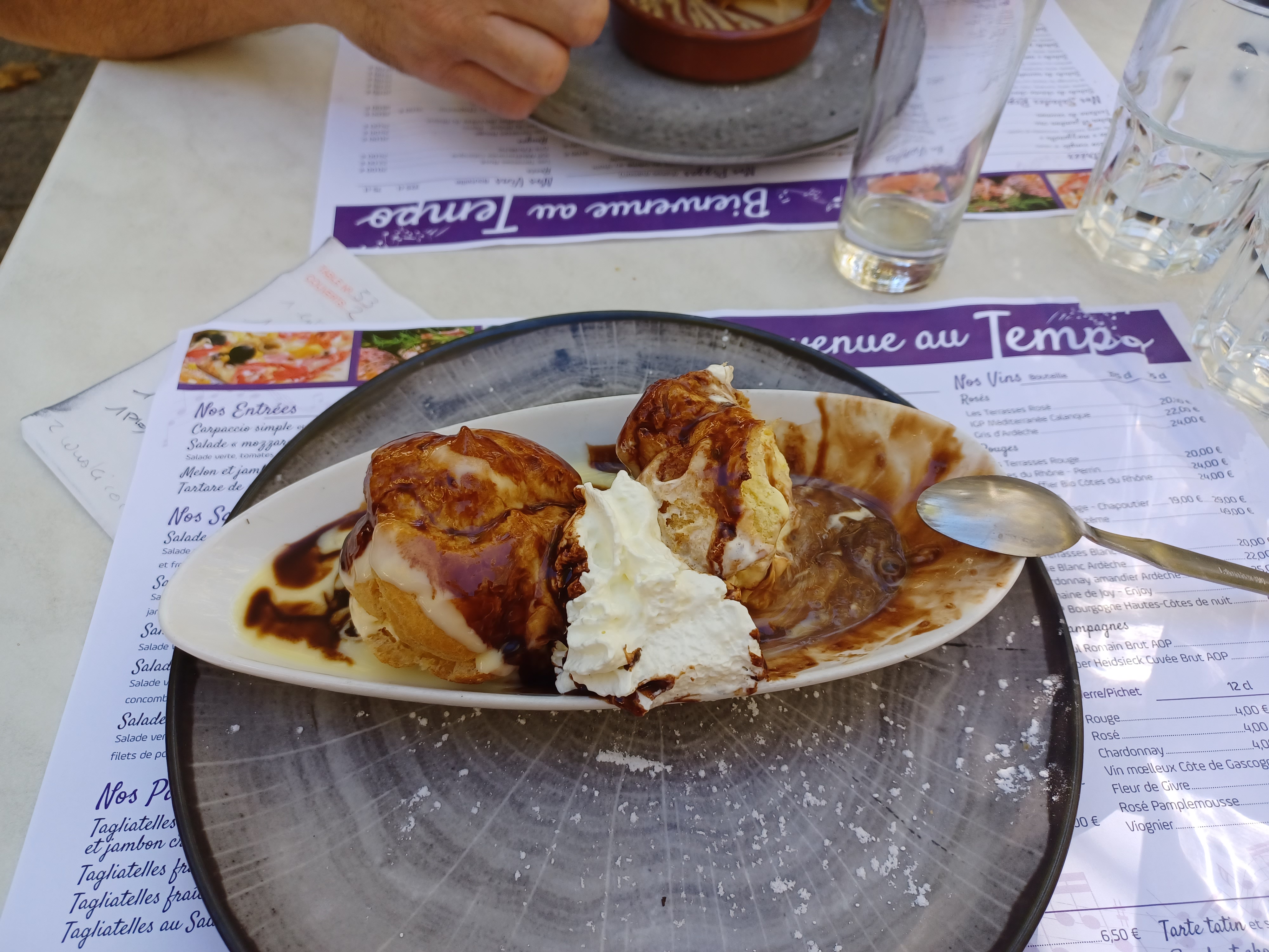 Après 5 refus d’autres restaurants car complet, le Tempo nous « accueil ». Malheureusement service extrêmement long et moyennement agréable. 1h avant de passer commande. Et quand on demande gentiment un parasol parce que nous sommes la seule table en plein soleil alors que d’autres en on 2, on nous dit d’aller en acheter un chez Brico Dépôt !! Heureusement nous sommes tombés sur une serveuse sympathique qui nous a changé de place ayant pitié ... bref si possible allez ailleurs.