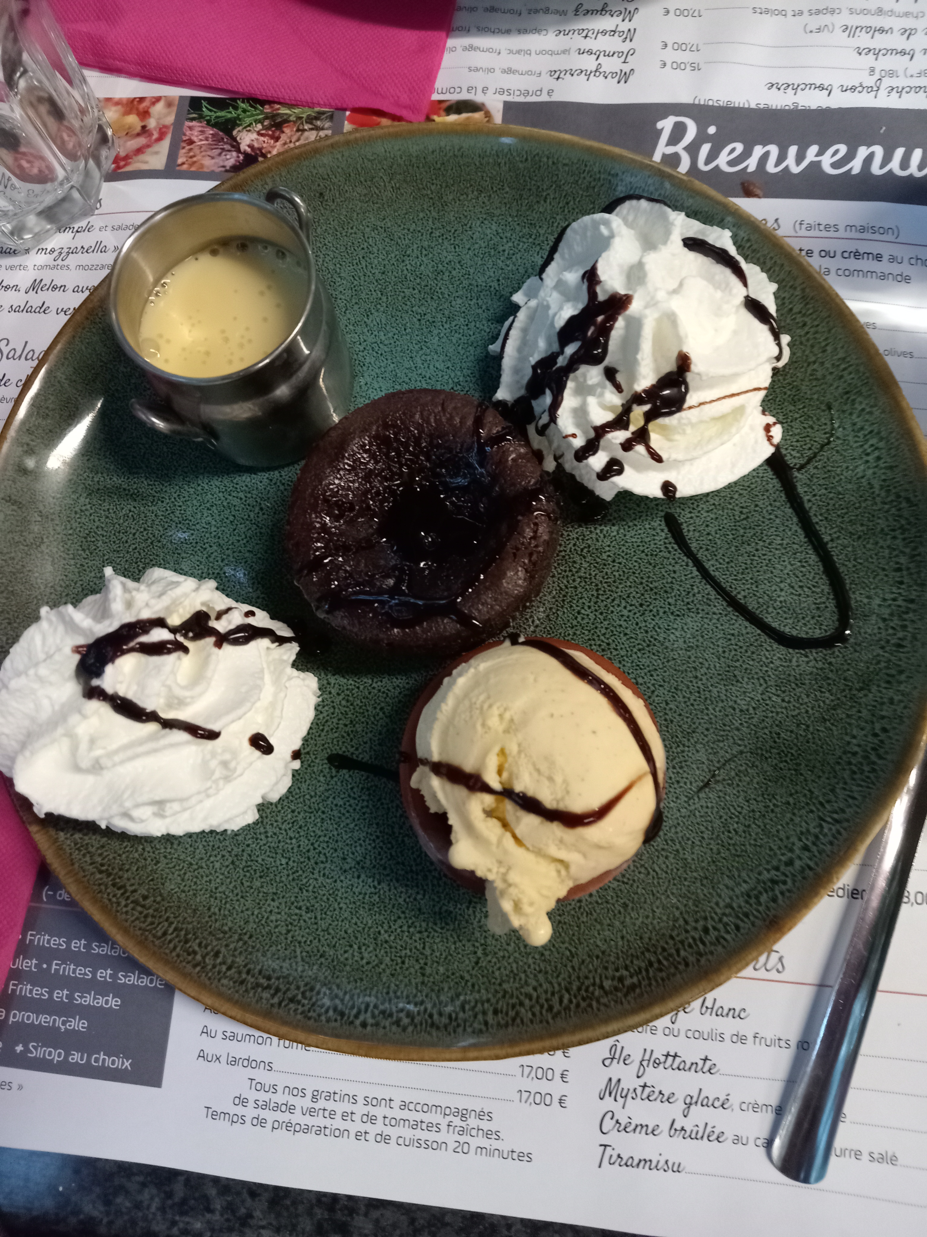Accueil sympa cadre agréable conquis par leur cuisine fine et copieuse j'ai pris le menu à 15 € je suis un bon mangeur ça m'a suffit je vous le conseille