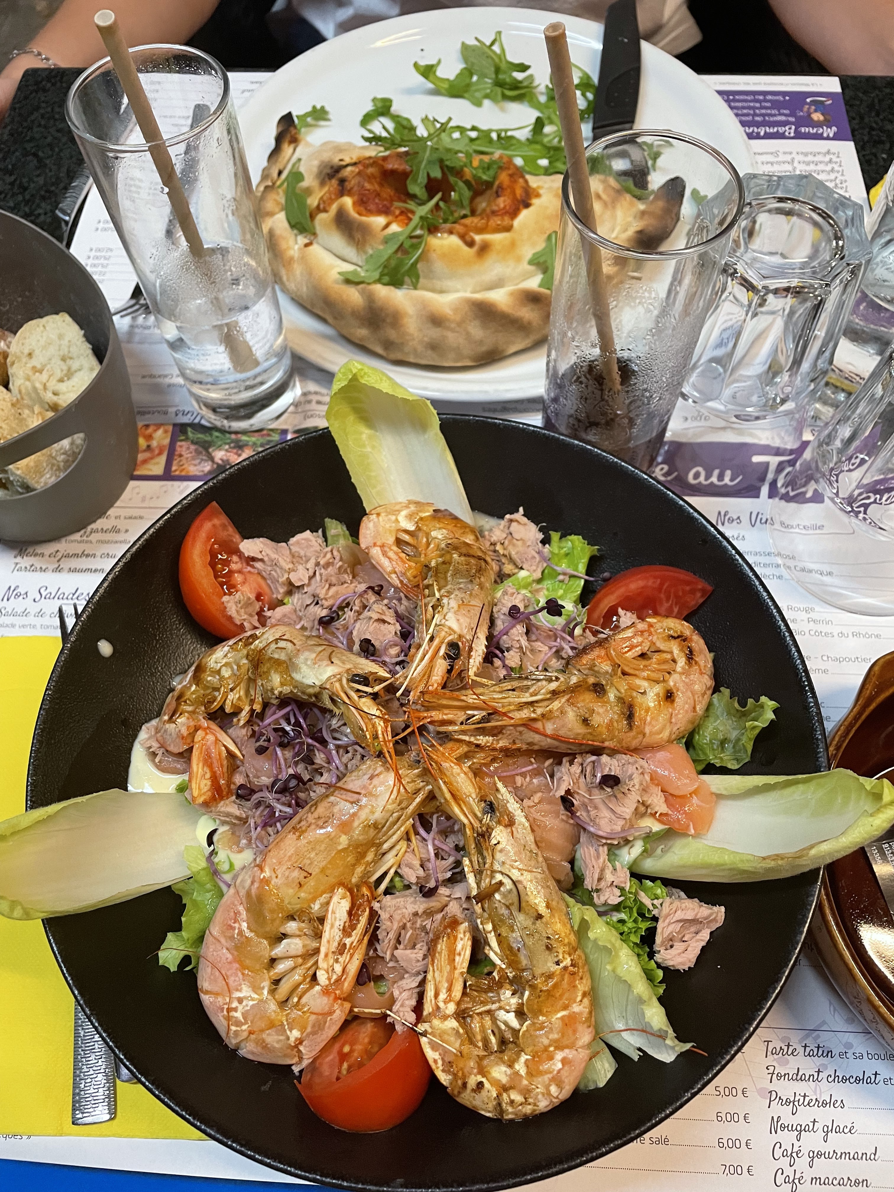 Nous avons pris 2 salades repas très copieuse serveur très sympathiques on a était pris en charge toute suite pour nous installer pas de temps d’attente au plaisir de revenir