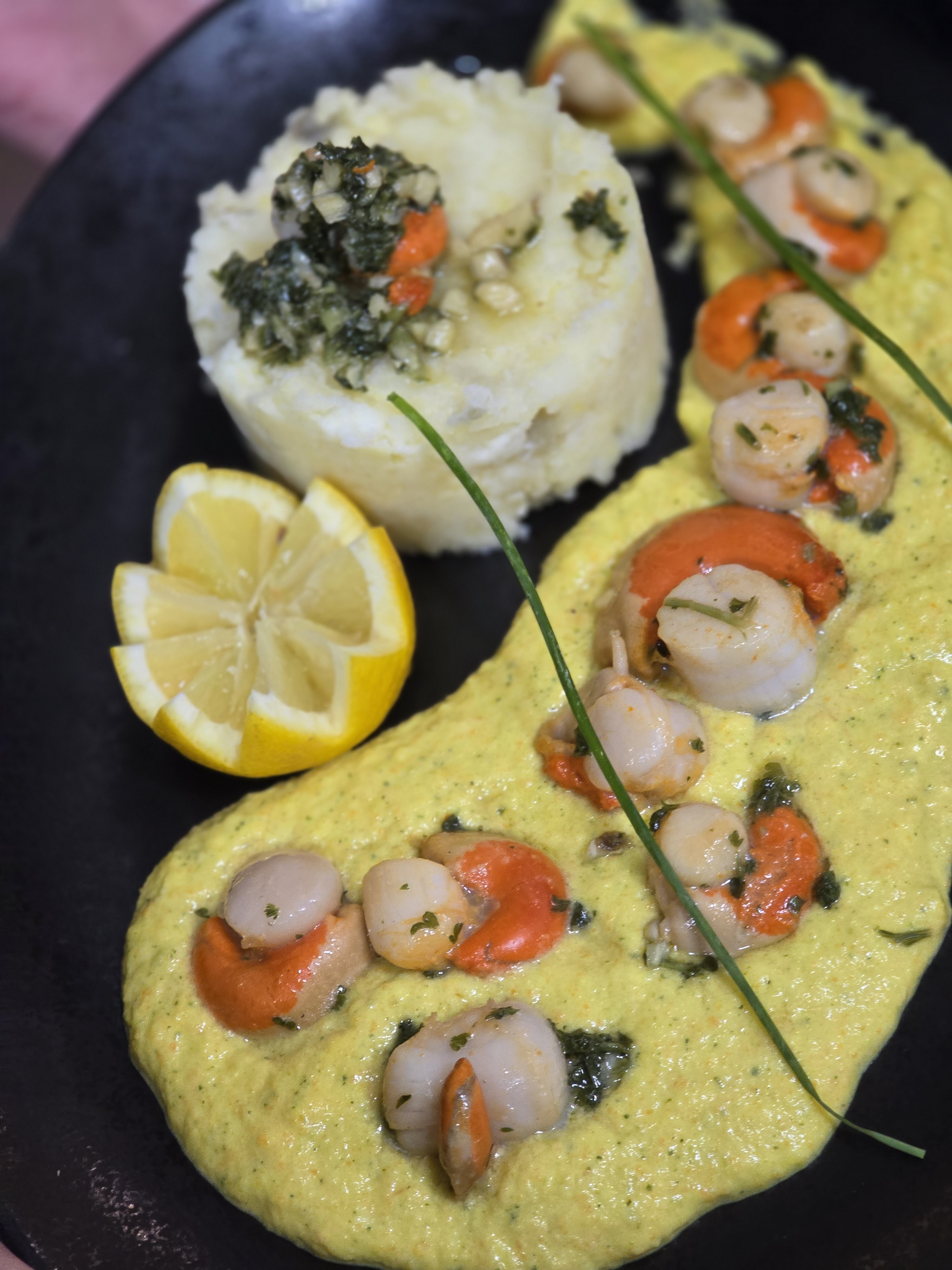 Cocktail très sucré.. Très bon service. Bon repas.Belle présentation Dommage pour le cheveux dans le dessert, merci pour le café qui nous a étais offert.
