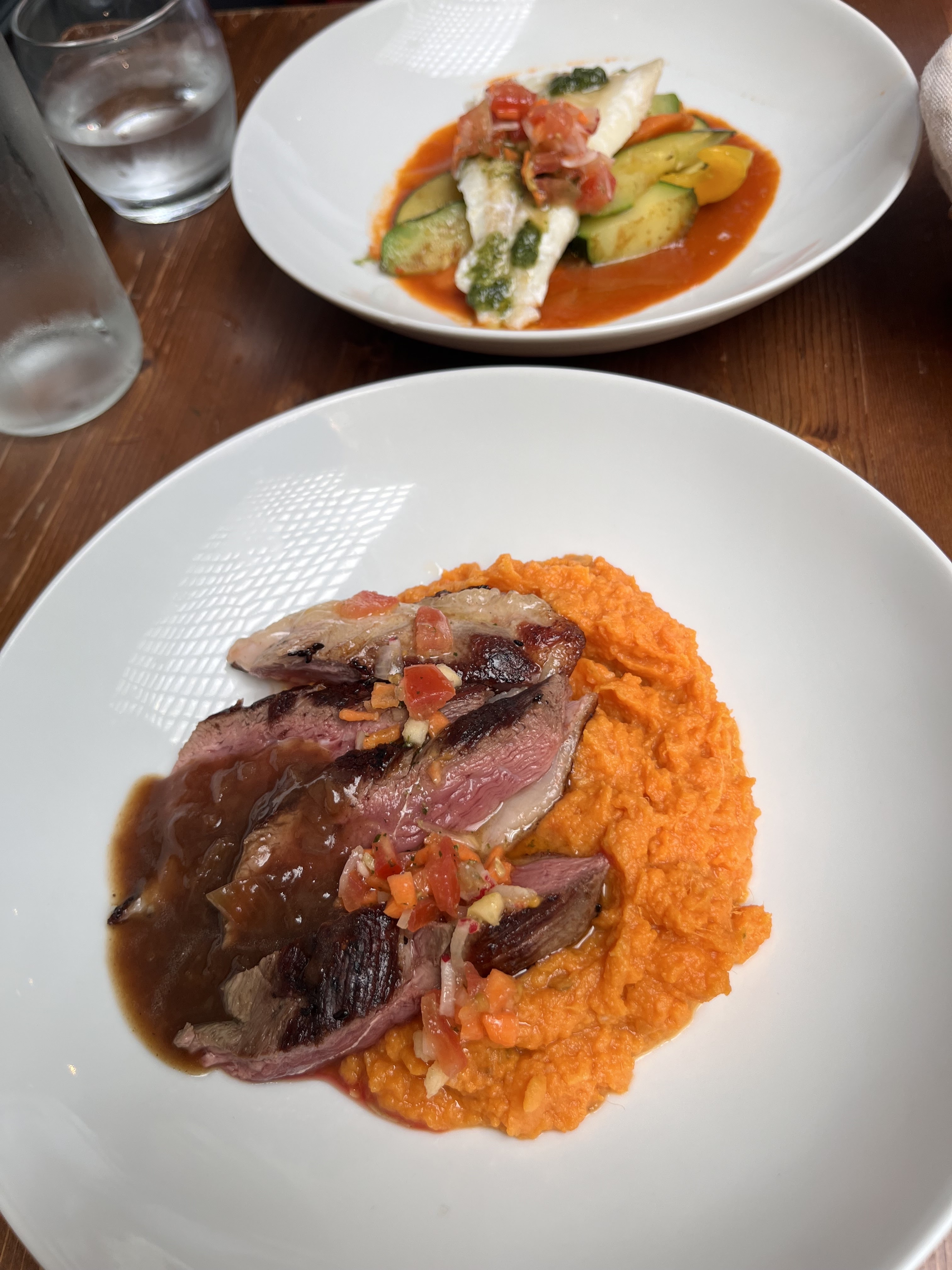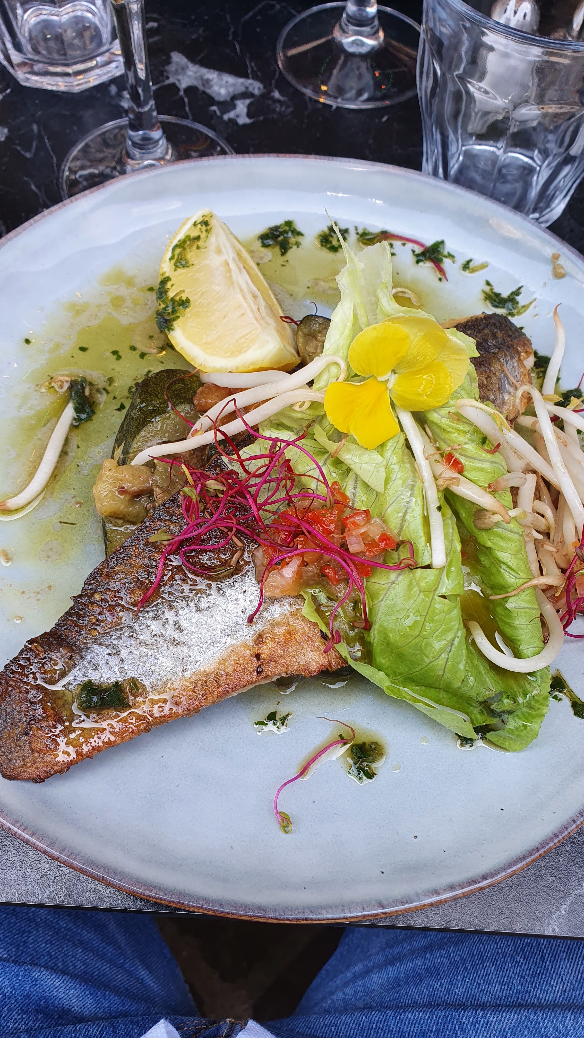 Personnel agréable et efficace, belle déco intérieure, terrasse agréable, mais les plats c'est pas ça, ça ne m'a pas plus du tout... légumes pas cuits (dommage pour une aubergine, ça ne se mange pas cru), sauce très salée, crumble un peu cramé... dommage avec ce cadre !