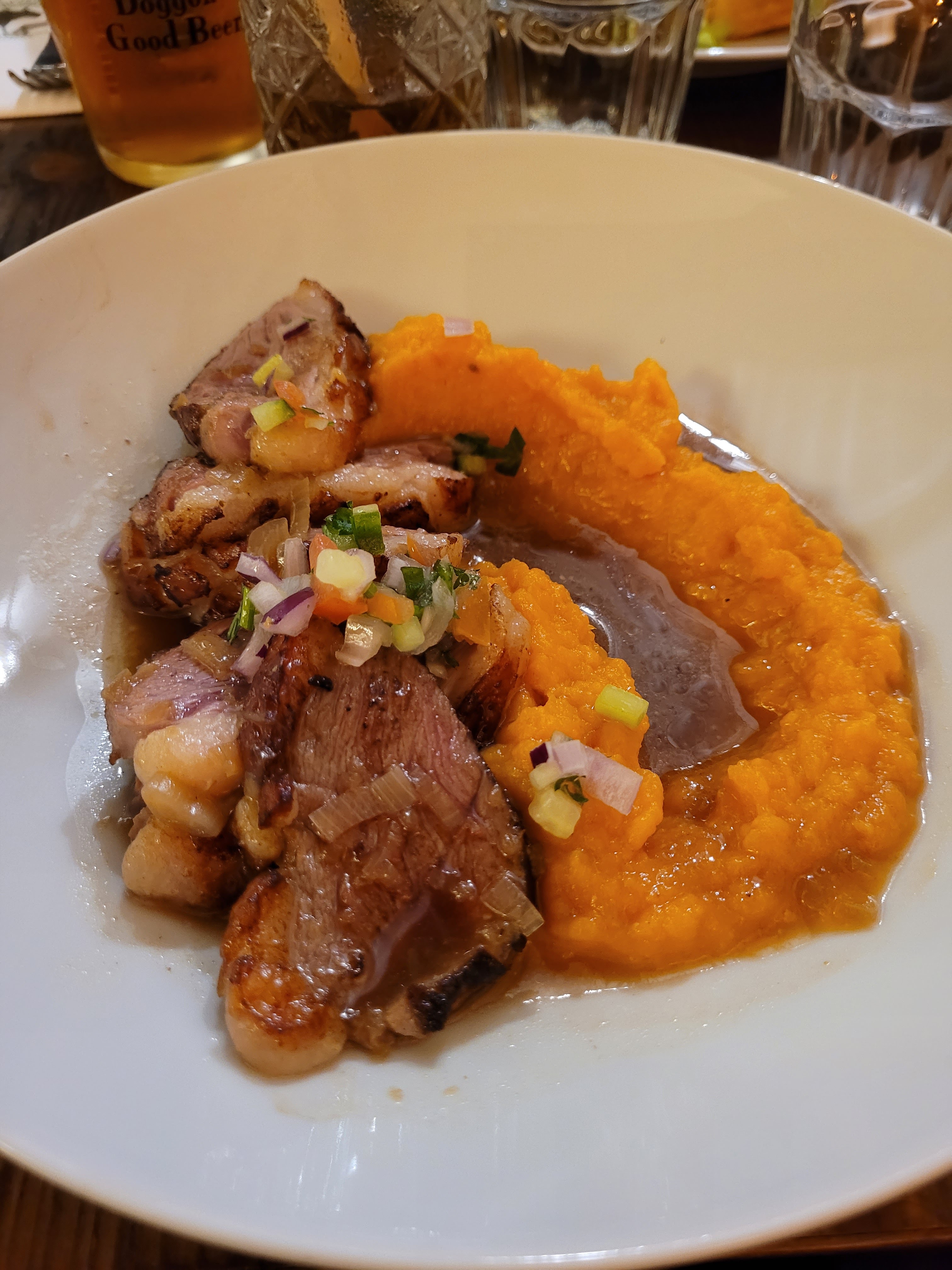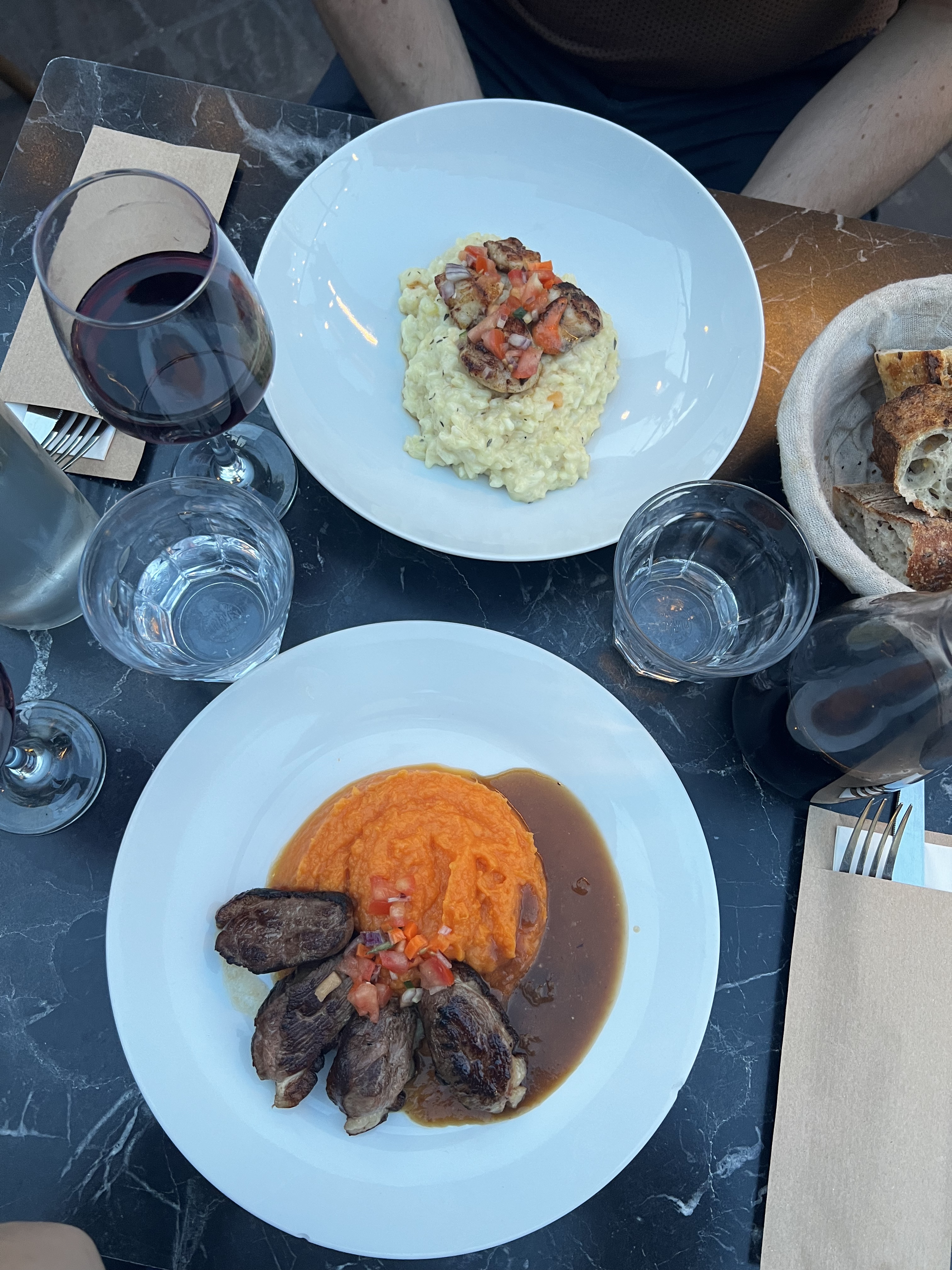 Le lieu est sympathique. Le personal agréable. Le plat servi froid,retour à la cuisine pour être chaufé. Le Gambas avait suivi un régime était de taille de crevette, preparé sur une plaque avec l'odeur de viande ...dans la purée de butternut il y avait des gros morceau de pomme de terre. Tiramissu ,servi dans un verre avec 2 charlottes trempés dans le café rempli de mascarpon et des soupson de poudre de chocolat à la surface.. Les plats sont très loin pour être considéré GASTRONOMIQUE... Je ne recommande pas