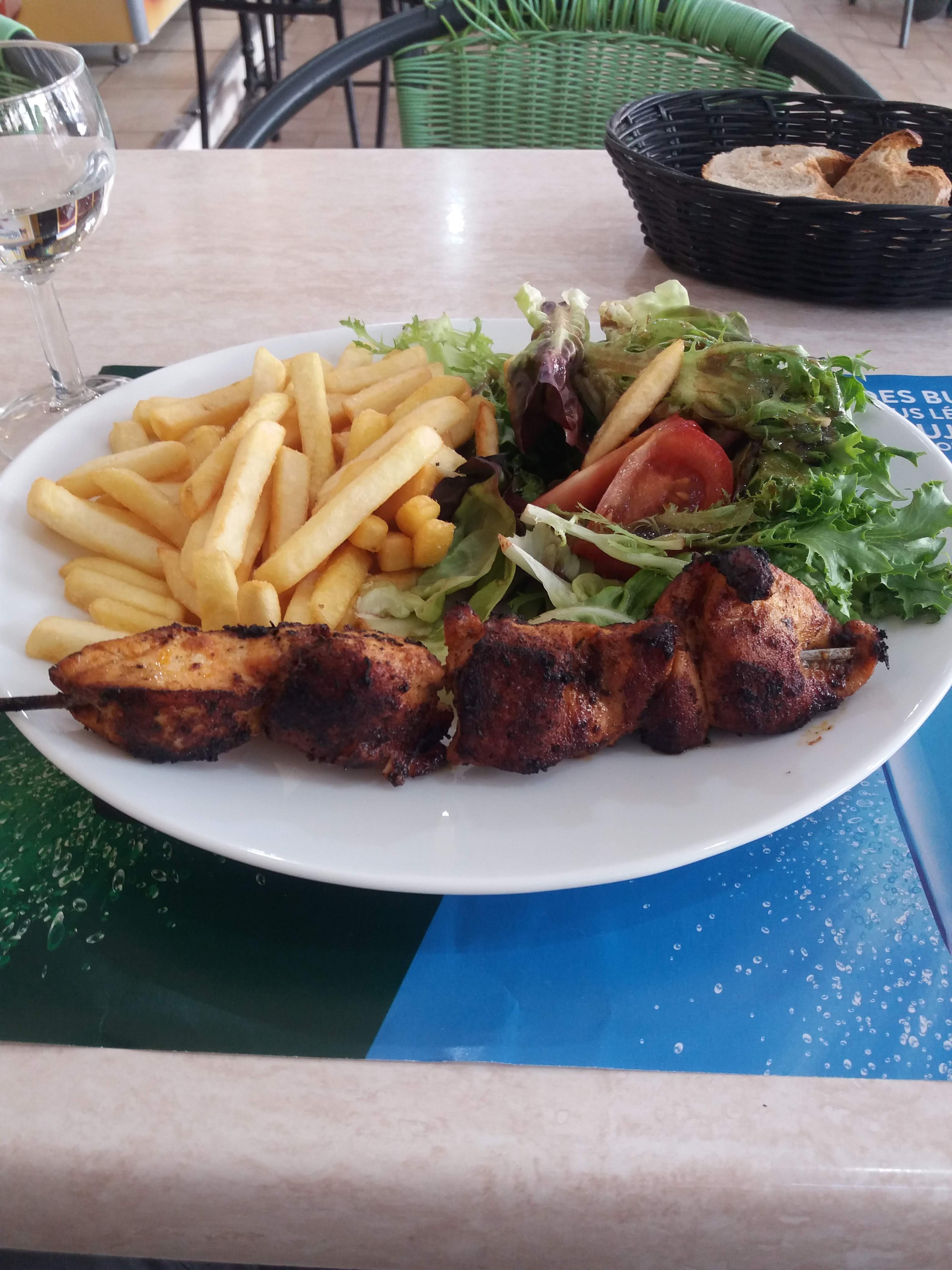Une bonne adresse non loin de la gare routière ( 3mn) . En terrasse, ombragée, un bon accueil. Les gens du quartier si retrouvent .Des prix doux au vu de la qualité et de l emplacement. Gentillesse au menu et une carte alléchante. Je ne regrette pas mes choix: brochette de poulet 🤪 aux abricots confits et prune accompagné d une salade généreuse et de frites. Et un fondant au chocolat suivi d un café pour reprendre des forces.