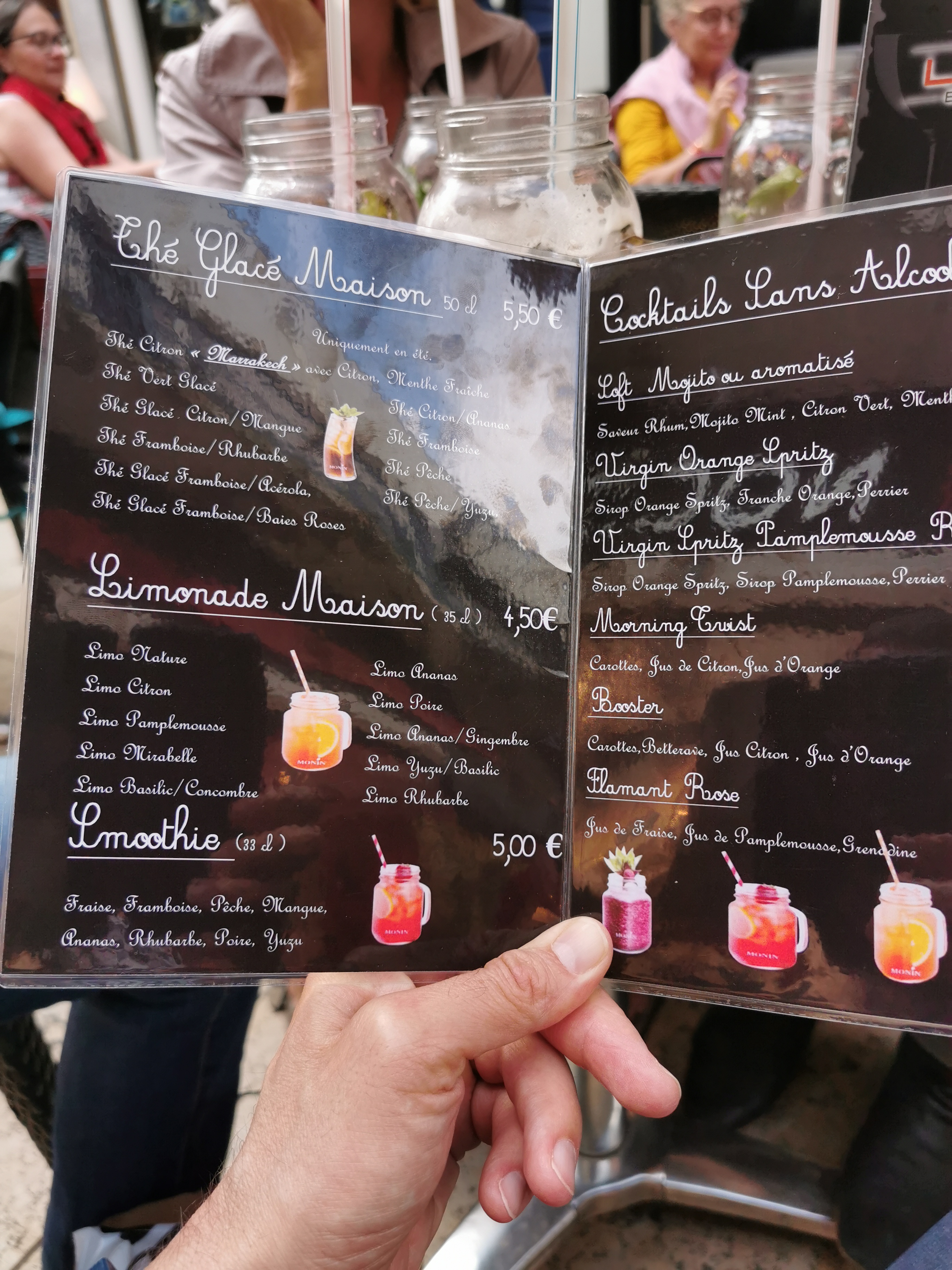 Bar très sympa, les cocktails, thés glacés et smoothies bien frais et à prix très raisonnable, le service très agréable. Je recommande. Rue piétonne c est un plus