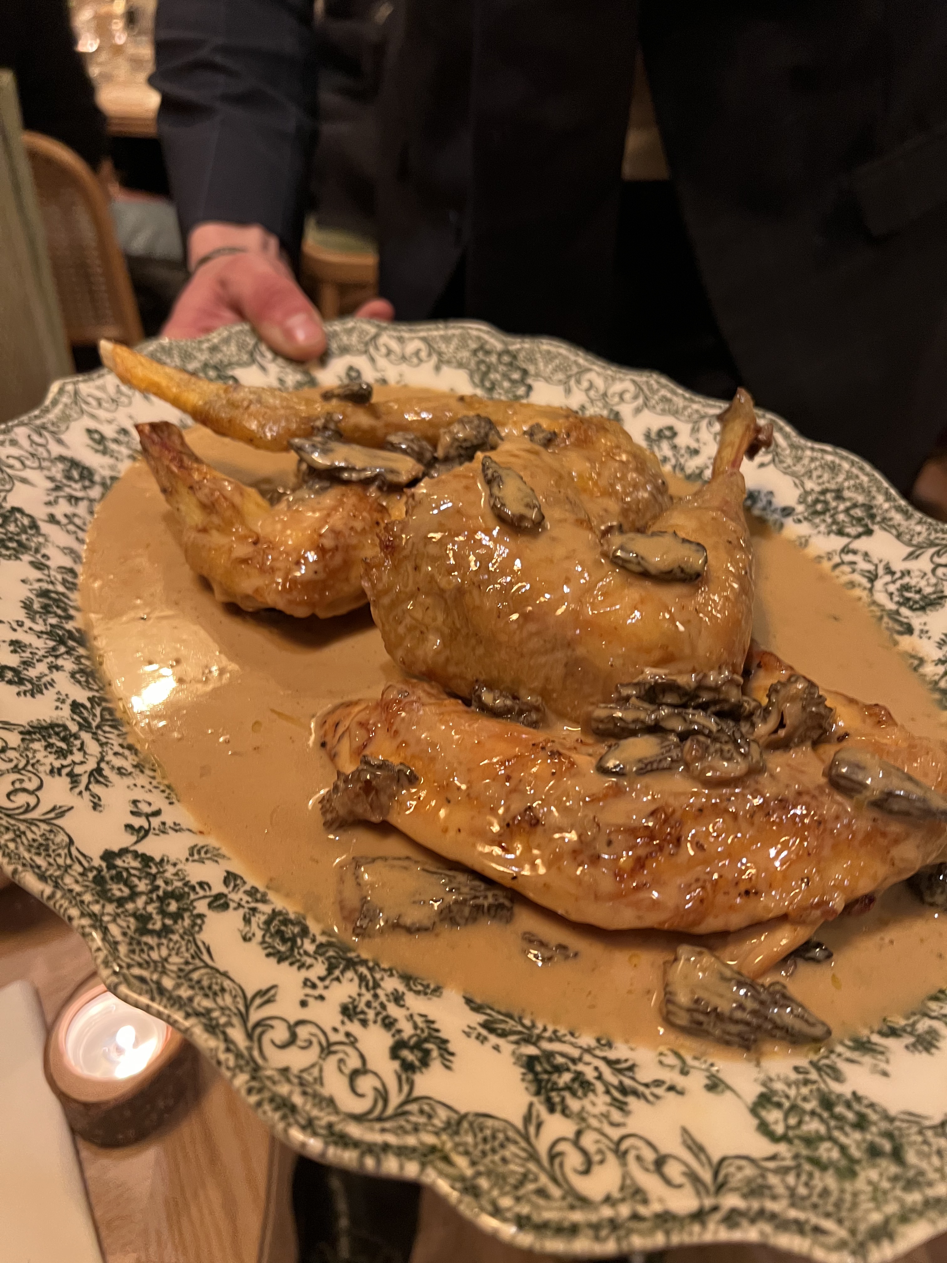 Cet endroit était local à notre hôtel, alors j'ai décidé de l'essayer. L'ambiance et la décoration étaient charmantes mais les tables sont petites. Le menu n'était pas vraiment excitant mais nous avons opté pour le poulet à partager. Pour 45 €, vous obtenez un poulet entier et des frites. C'est ça! La sauce aux morilles coûtait 11 € de plus, ce qui, je comprends, est cher, mais le poulet devrait être accompagné d'une sauce pour ce prix, d'autant plus que le poulet était fade et qu'il était donc nécessaire. Pour aggraver les choses, la cuisse et la cuisse de poulet étaient crues et on leur a ensuite dit que c'était ainsi qu'on les mangeait en France ?!! Nous avons mangé du poulet ailleurs pendant le voyage, qui était cuit comme il se doit. Globalement très décevant