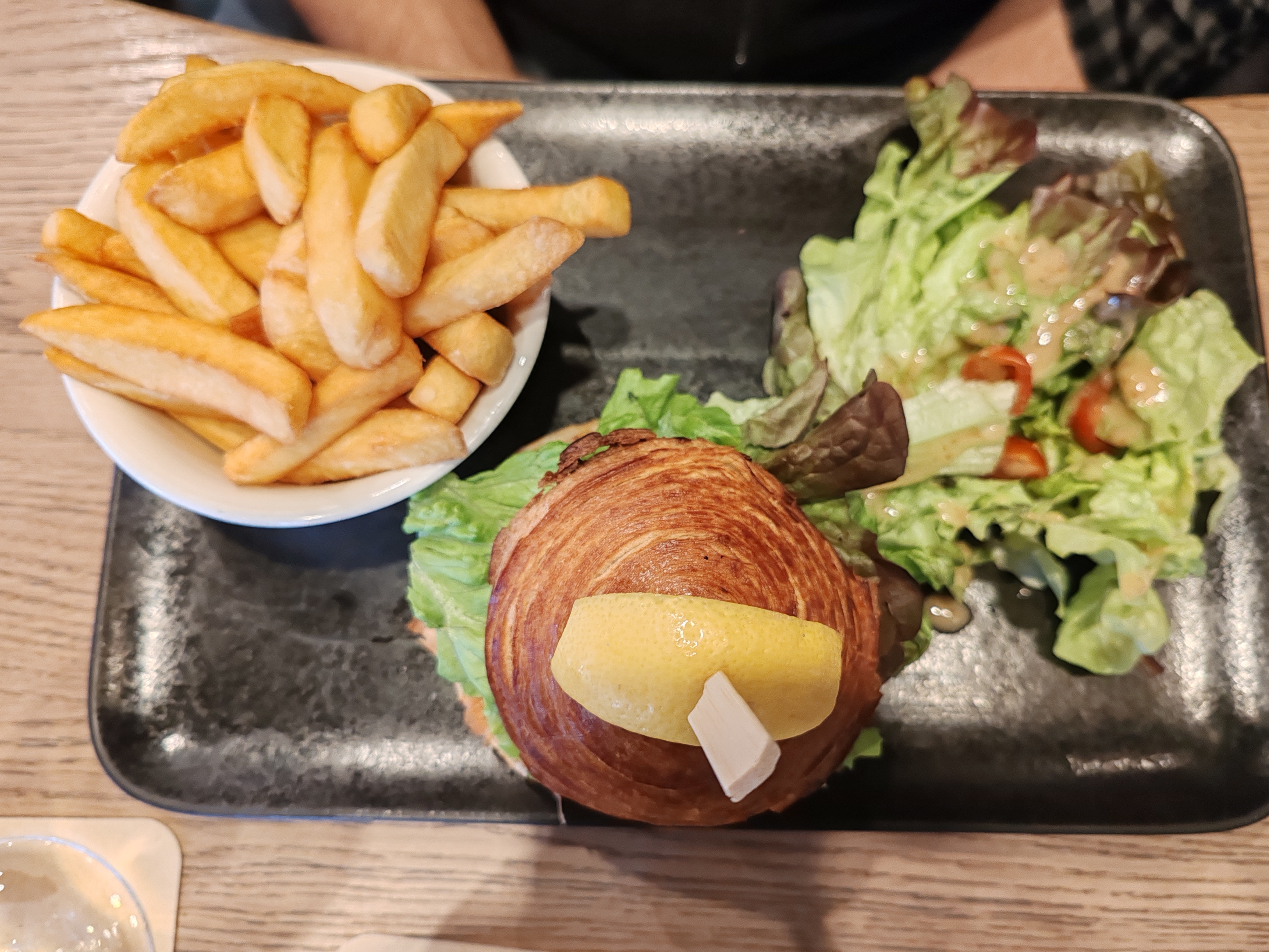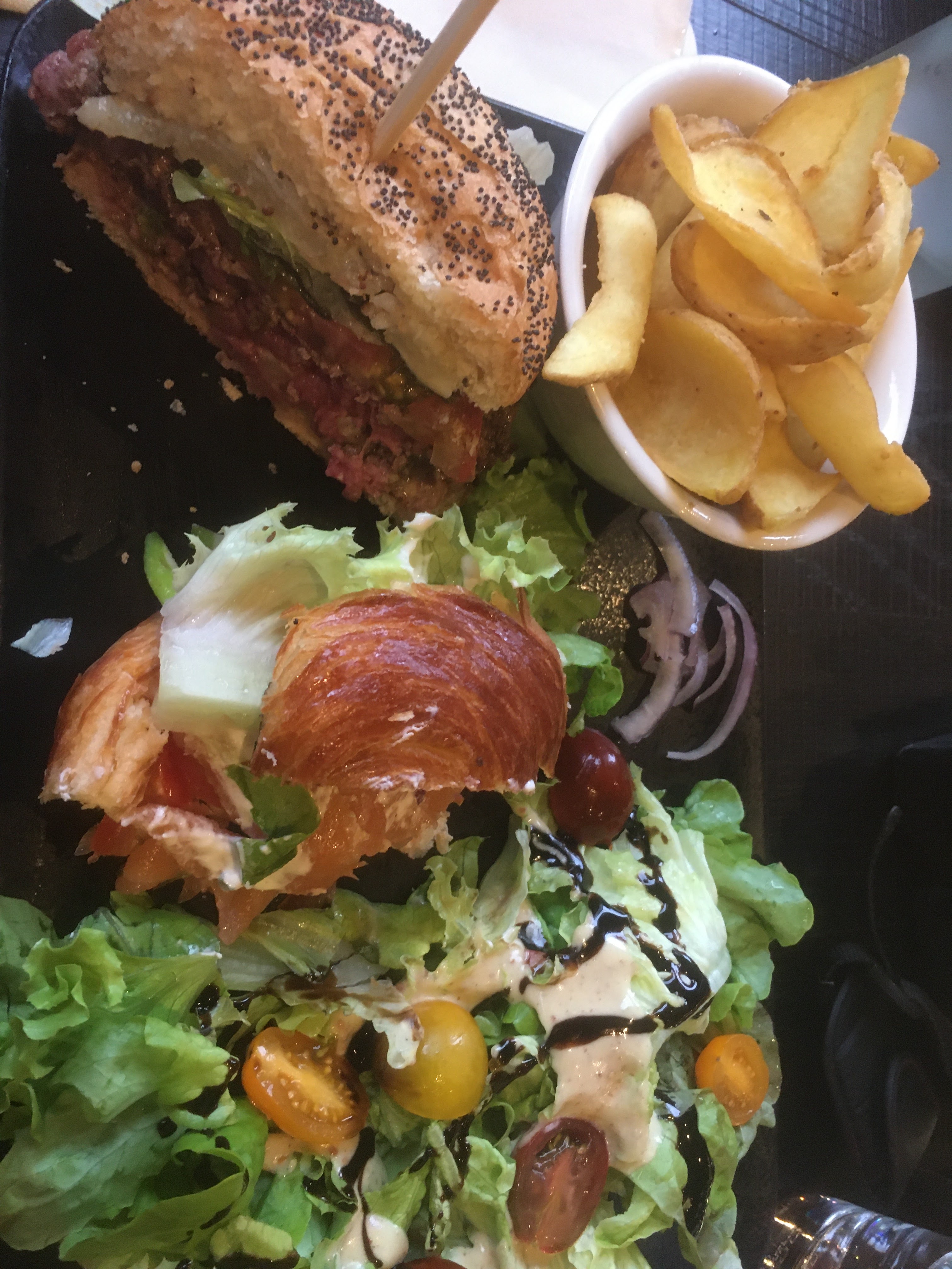 Petit déjeuner correct, sans plus. L’ardoise a l’extérieur est trompeuse : une fois servis, on nous explique que c’est viennoiserie (pain au chocolat ou croissant) OU tartine…