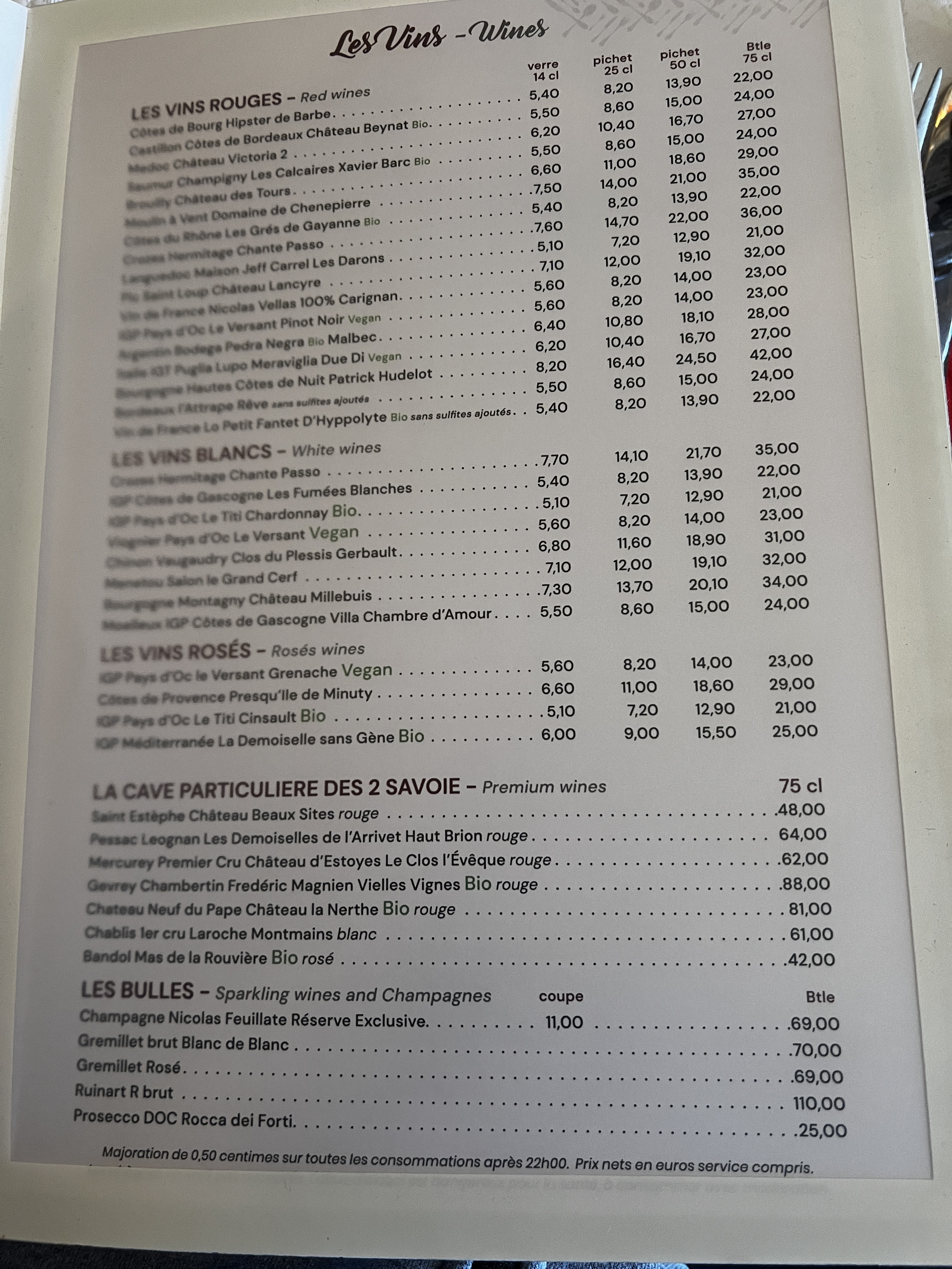 Je confirme les autres avis le serveur est desagreable il déteste son travail . bref pour le vin je ne suis pas oenologue mais on aurait dit quil y avait de l'eau dans mon vin, il etait insipide.mais le service mérite un zéro pointé. Continuez comme ca vous contribuez a la mauvaise reputation du service en France chez les touristes.