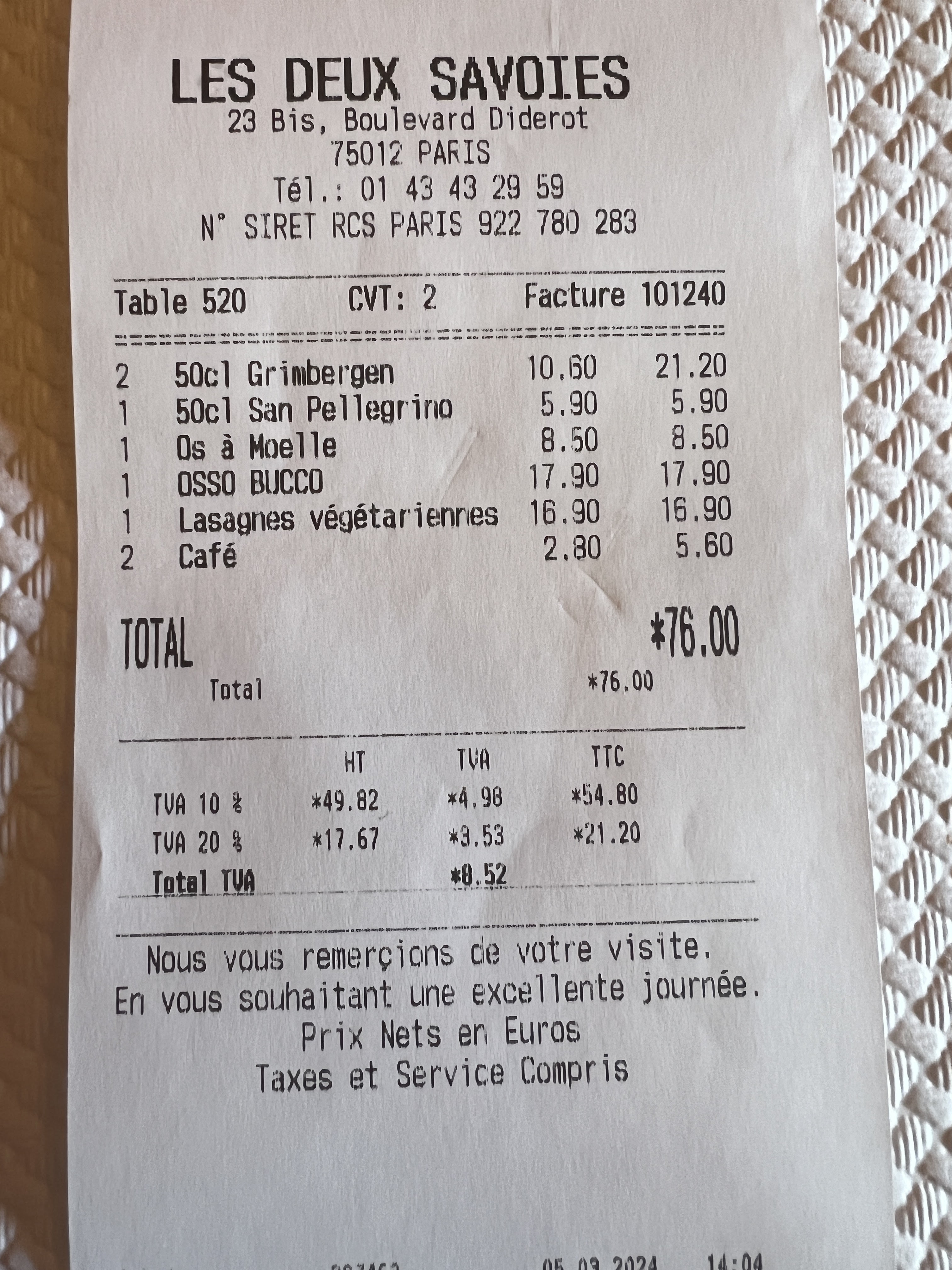 Repas à 3 personnes samedi 19 mars nous sommes deux a avoir choisi des pâtes à la carbonara et quelques heures après nous avons eu des crampes d’estomac terribles . Je ne recommande pas .