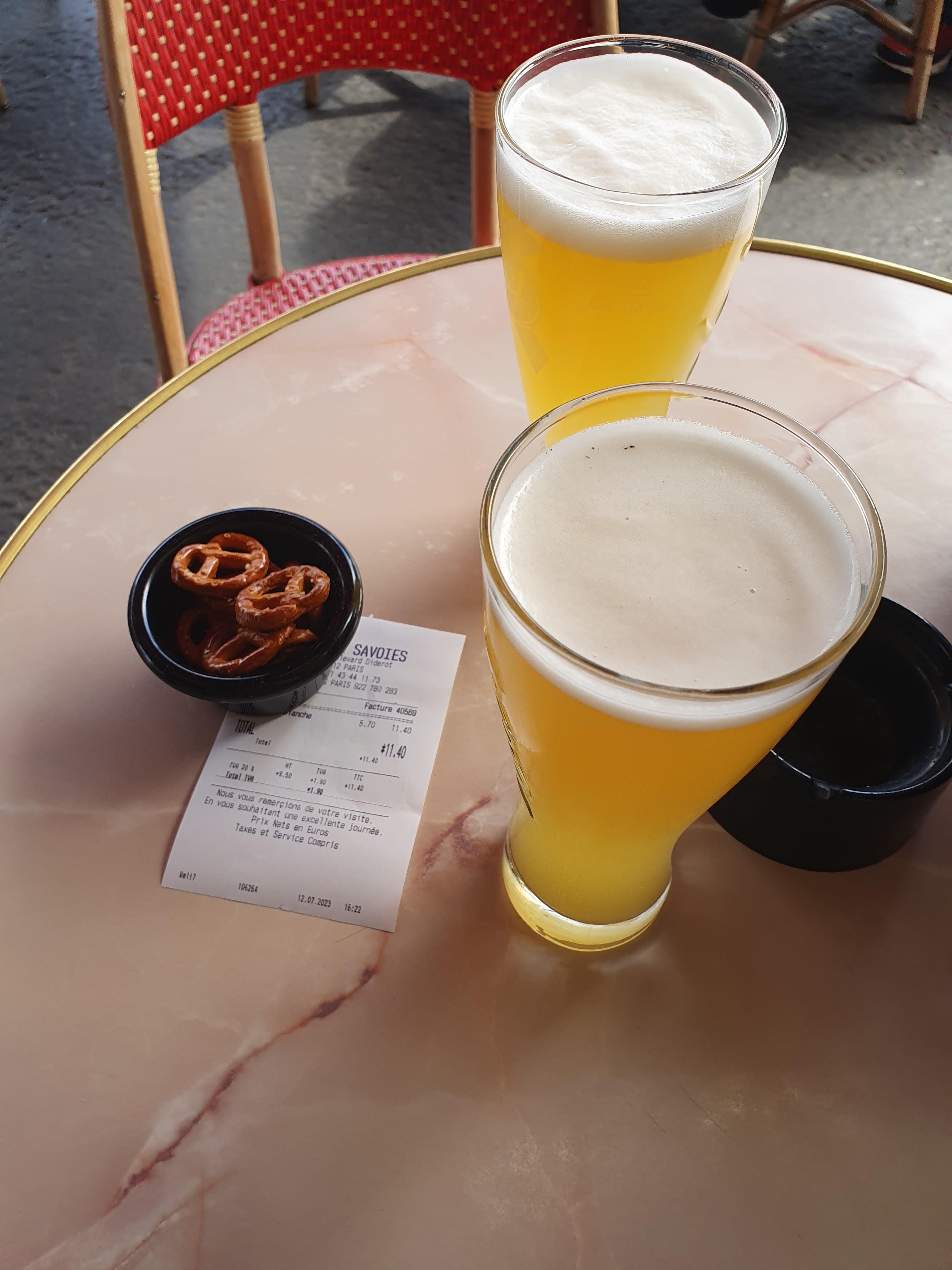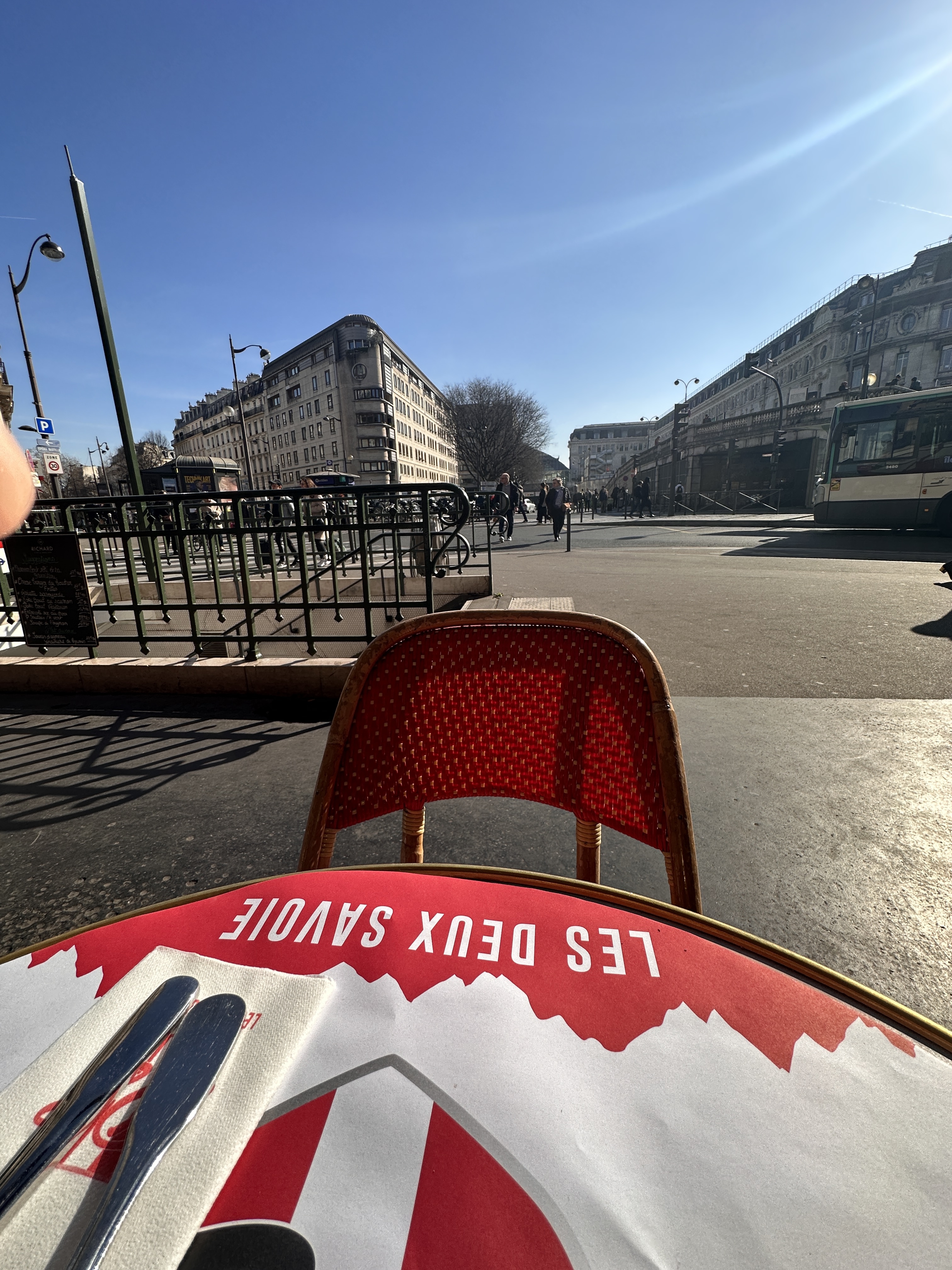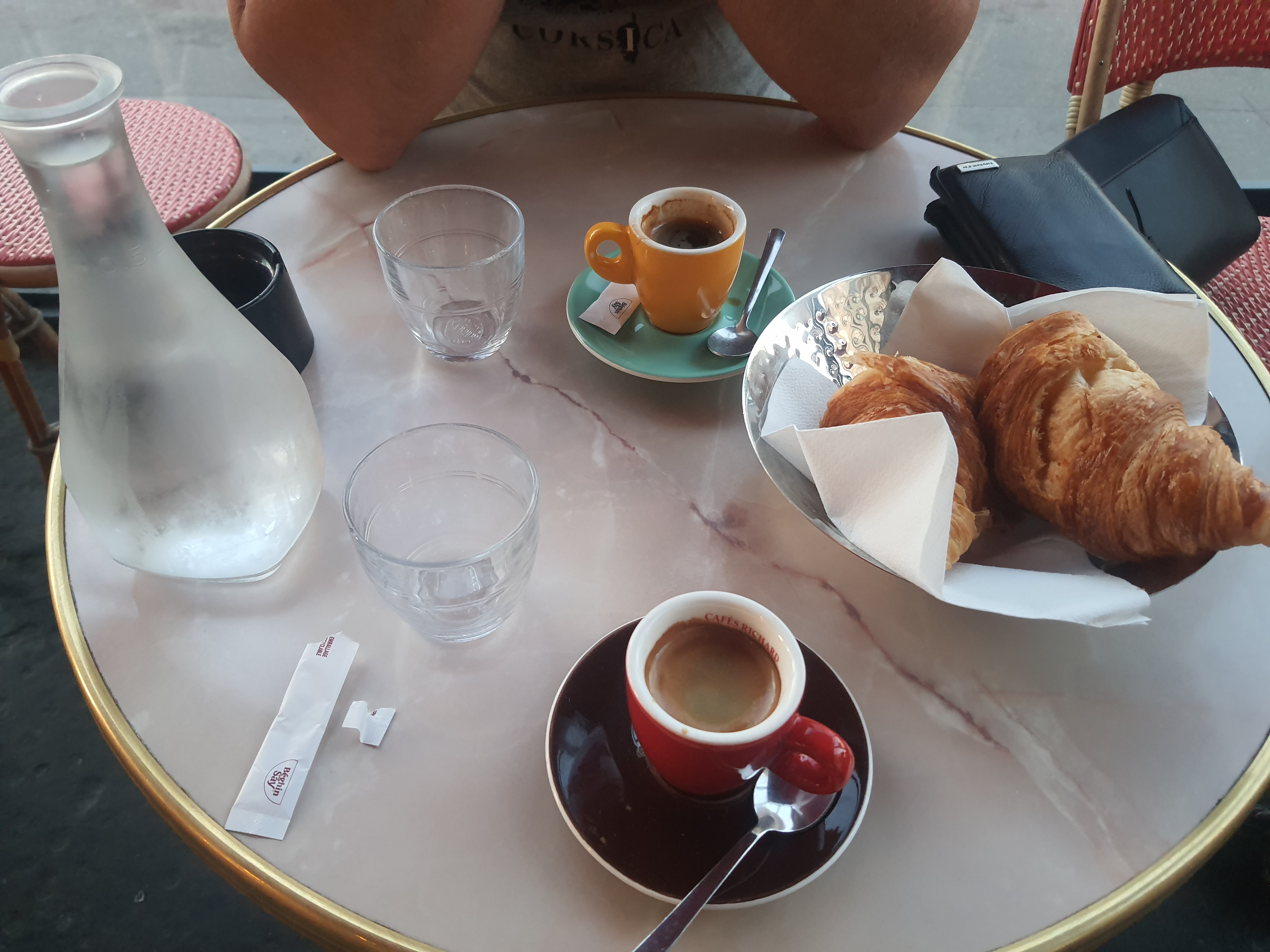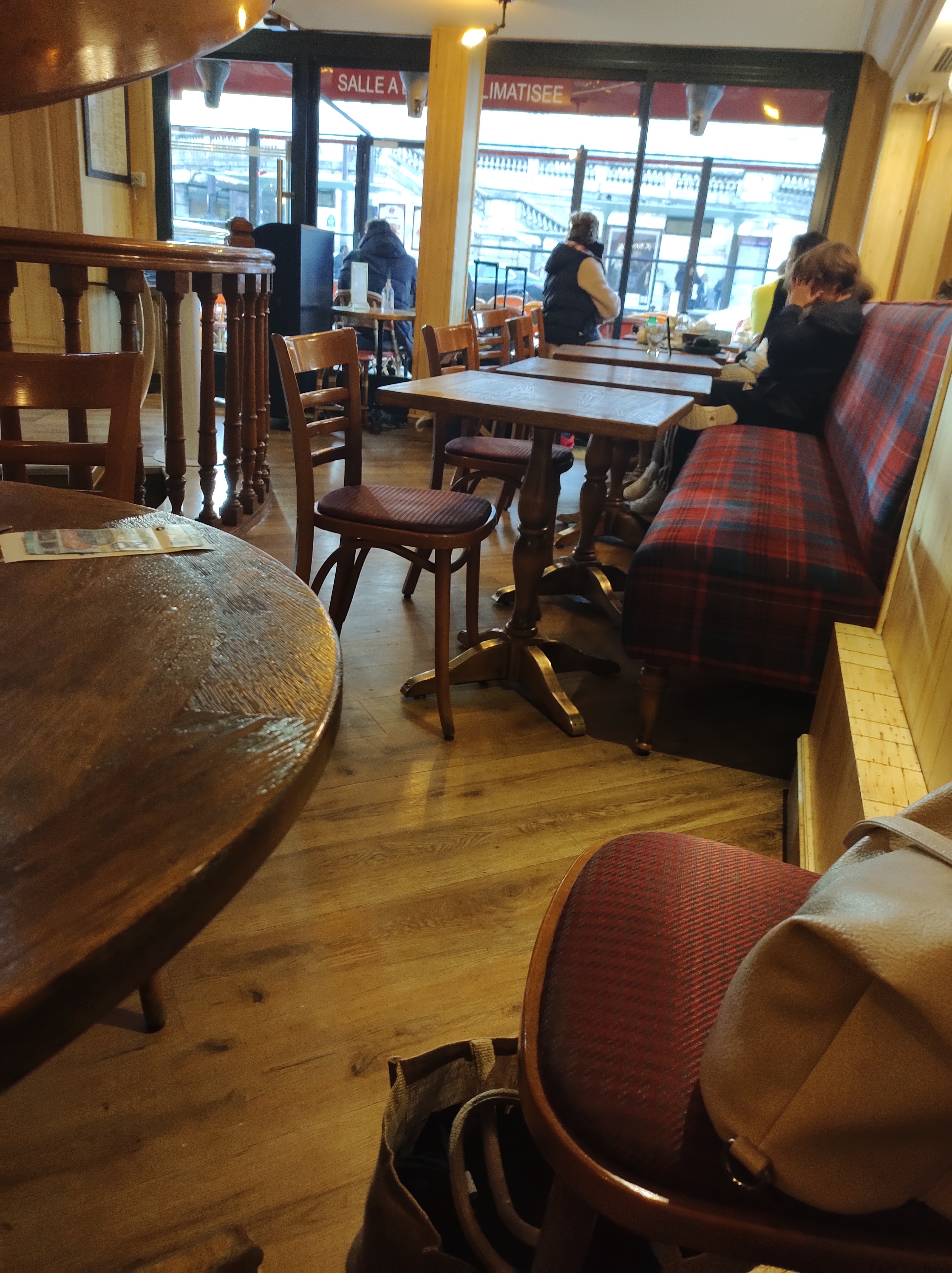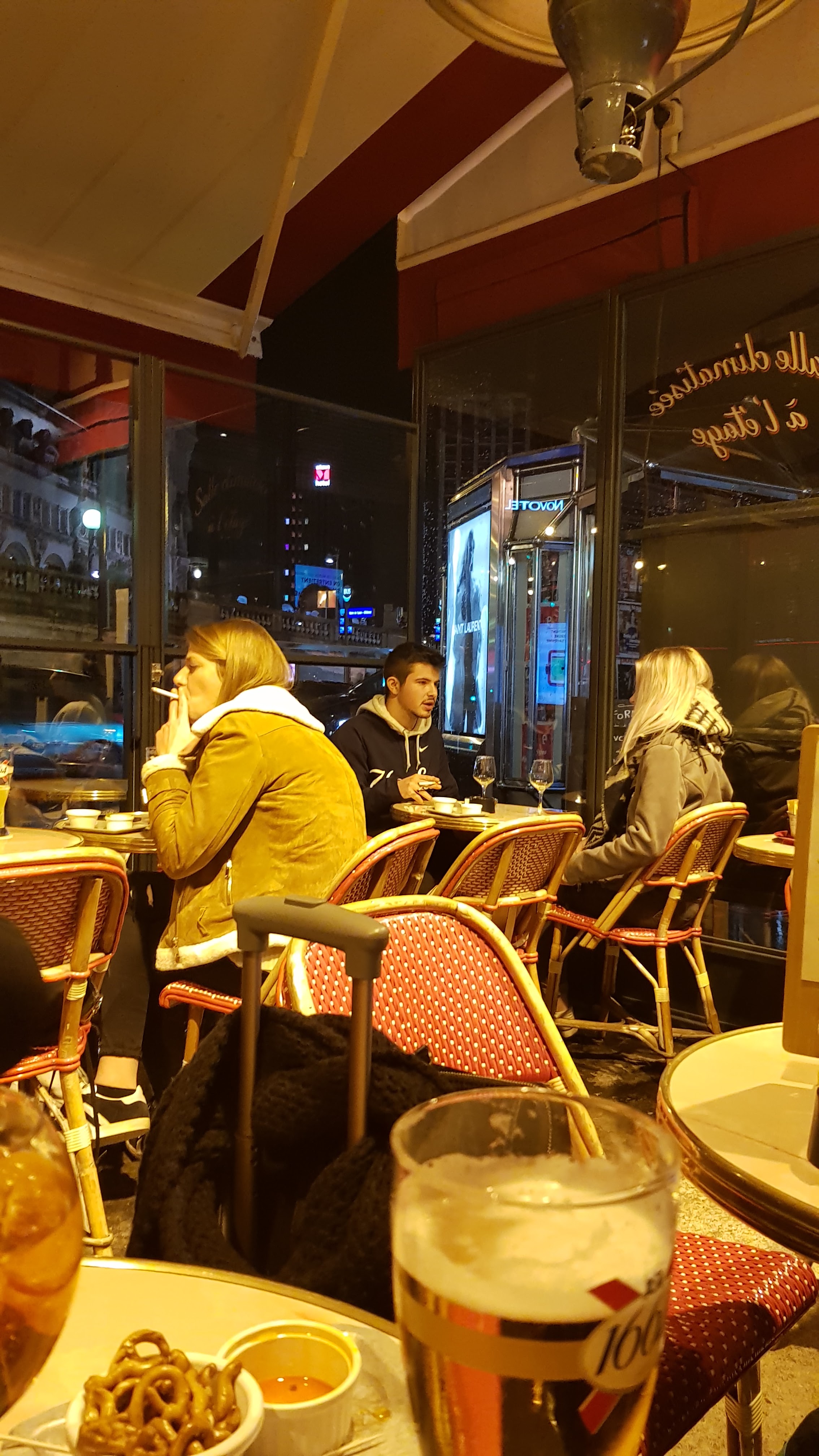 Une brasserie parisienne comme il en existe tant d'autres avec ses tarifs élevés pour un provincial : 12€ pour un grand crème, un croissant et un jus d'orange (pas pressé mais en bouteille) 😱