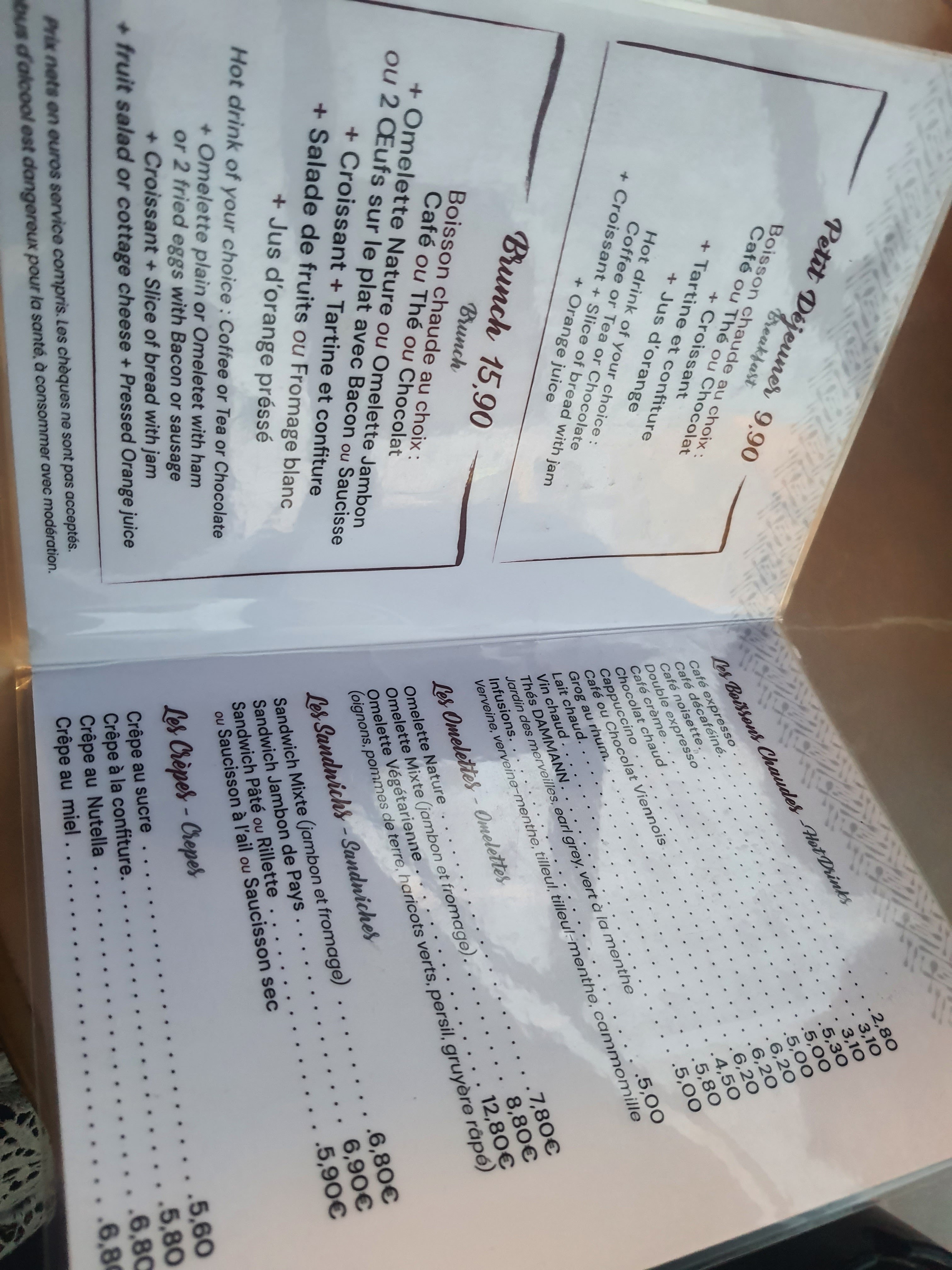 Petit déjeuner brunch pris ce dimanche en terrasse, pour 15 euros : boisson chaude, croissant , tartine beurrée+ confiture, oeufs au plat+ saucisse, fromage blanc et jus de fruit. Le personnel est très sympathique et aux petits soins. Je recommande