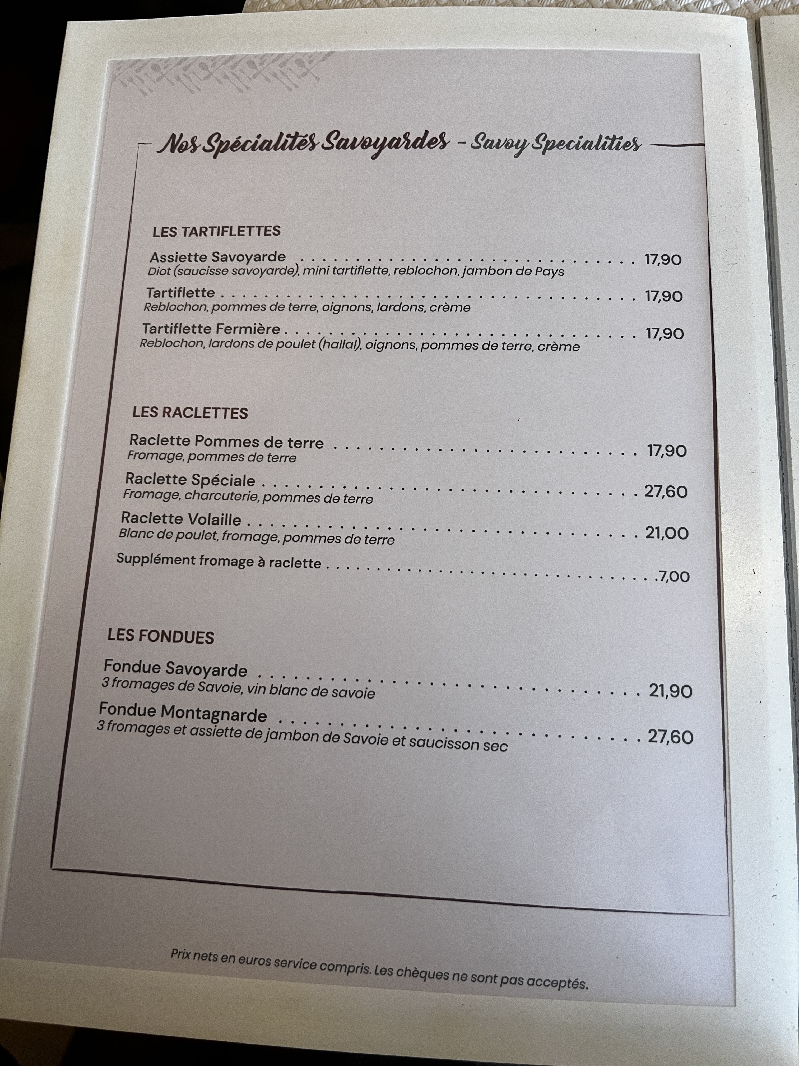 Spécialiste de la fondue ? Une arnaque pour touriste. Une fondue aussi liquide que de la soupe où le fromage était quasi inexistant. Il est précisé fondue faite au vin de Savoie, lorsque j'ai demandé une bouteille de vin de Savoie il n'y en avait plus. Avec quoi était donc faite la fondue ? Passez votre chemin sera le mieux à faire.