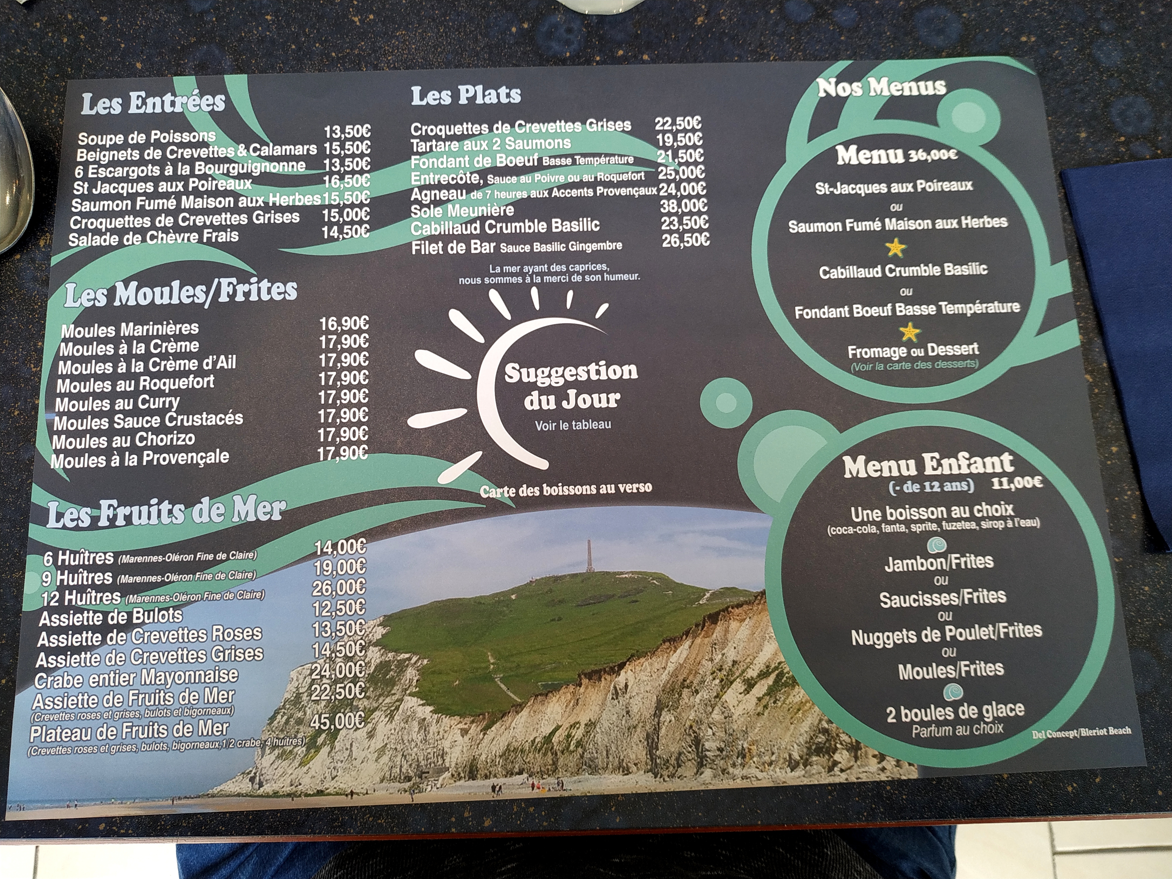 Un très beau cadre près de la plage d'Escalles avec ses , sa belle plage, ses magnifiques rochers, du départ GR 120 vers Wissant, avec vue sur le Cap Blanc Nez. Des plats variés à prix démocratique. J'a pris le menu qui était très bien présenté et bon. La terrasse est très recherchée , il vaut mieux réserver. Beaucoup de personnes mangeaient des moules. J'y ai passé un bon moment