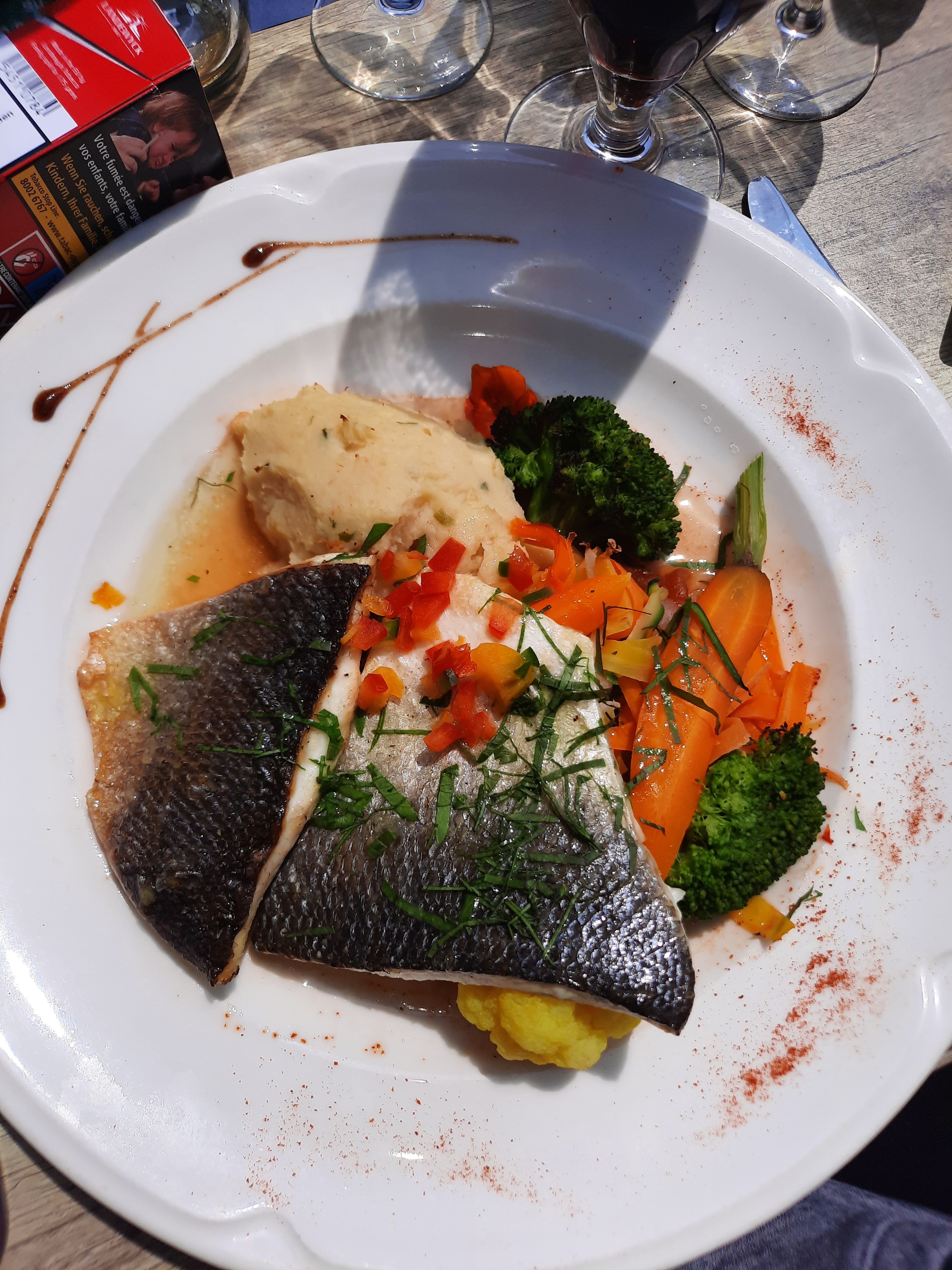 Das Hauptgericht war lecker. Die Garnelen waren ok. Leider nicht entdarmt. Die Crepes kamen leider aus der Mikrowelle, klebten am Teller und waren nicht gut. Schade, gerade Crepe sollte man hier in Frankreich doch können. Service nett, aber etwas gestresst. Die Kellnerin sprach gut Englisch. Le plat principal était délicieux. Les crevettes étaient correctes. Malheureusement pas vidé. Malheureusement, les crêpes sont sorties du micro-ondes, collées à l'assiette et n'étaient pas bonnes. Dommage, vous devriez pouvoir faire des crêpes ici en France. Service sympa mais un peu stressé. La serveuse parlait bien anglais.