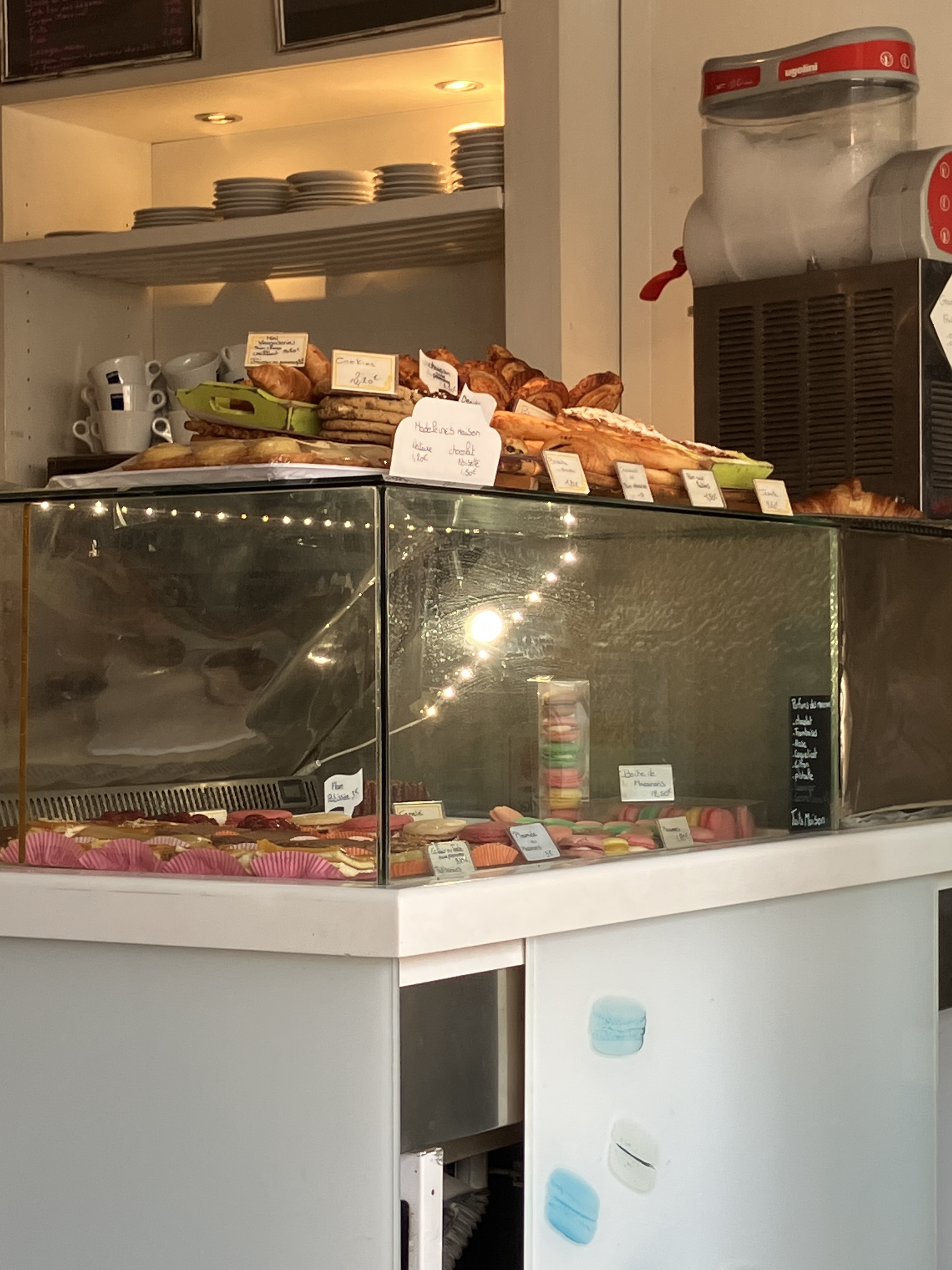 Nous sommes allés prendre une collation, pour essayer des friandises typiquement françaises. La vendeuse nous a expliqué le dessert éclair en espagnol et nous avons décidé de l'essayer ainsi que les macarons. Les macarons n'avaient pas beaucoup de saveur sauf le caramel salé. Le café Lavazza était plutôt bon aussi, il semble que ce soit le café typique de la région. 3 macarons 1 éclair 1 jus 1 café ————————— 12 €