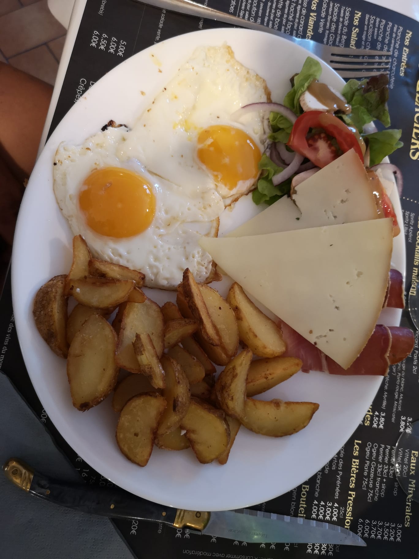Une assiette du randonneur faite de jambon et de fromage du pays accompagnée d'un jurançon, le tout face au panorama grandiose du cirque de Gavarnie... What else ?? Le bonheur...