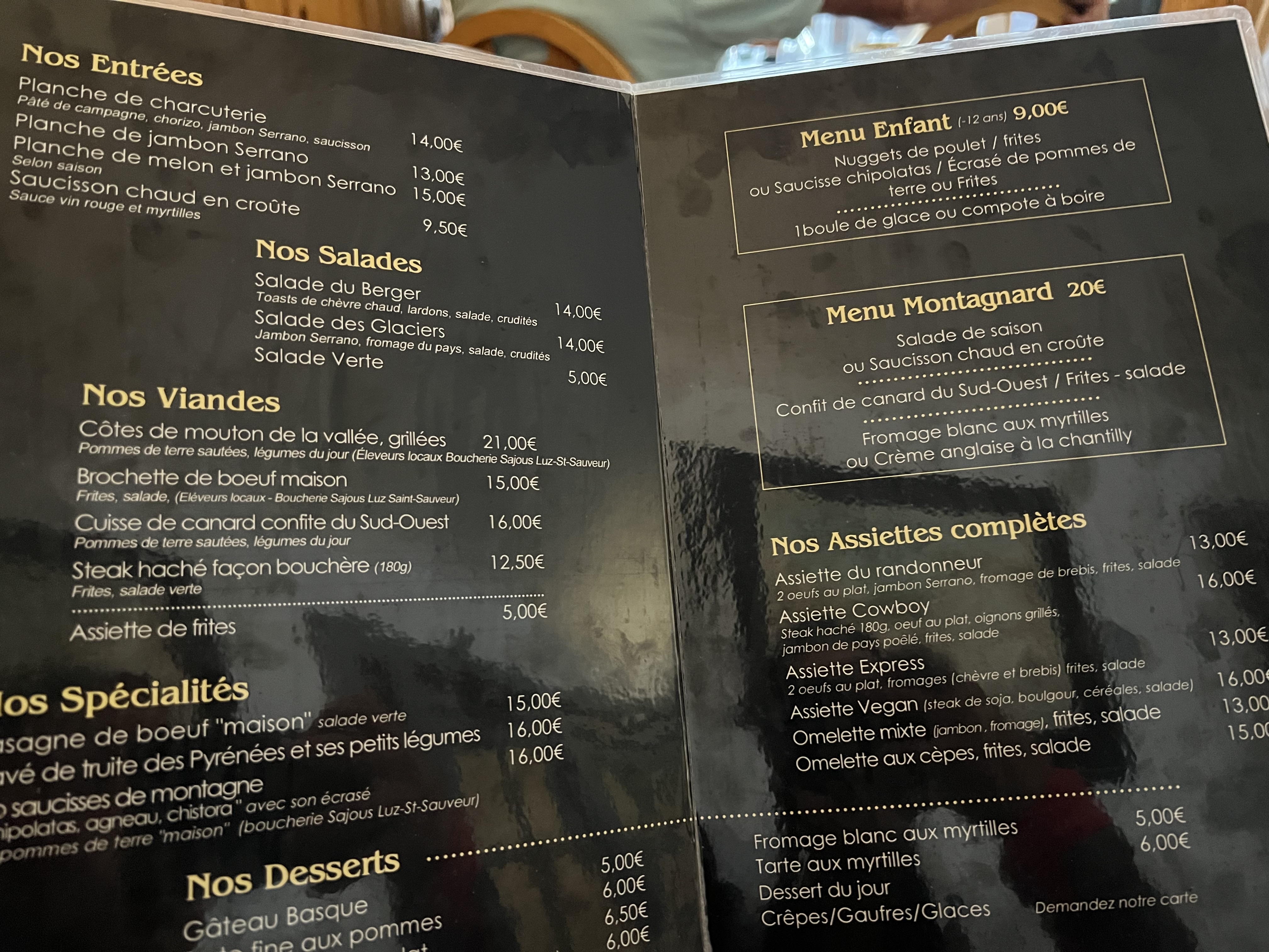 Nous avons pris 2 menus montagnards, entrée(salade composée ) plat (cuisse de canard) et dessert (fromage blanc). Nous demandons de changer le dessert en prenant une part de gâteau basque annoncée à 5€ sur la carte, moins cher donc que le fromage blanc à 6€. Économie donc d'1€ pour le restau. Nous avons été étonnés de payer un supplément pour un dessert annoncé moins cher que celui du menu ...