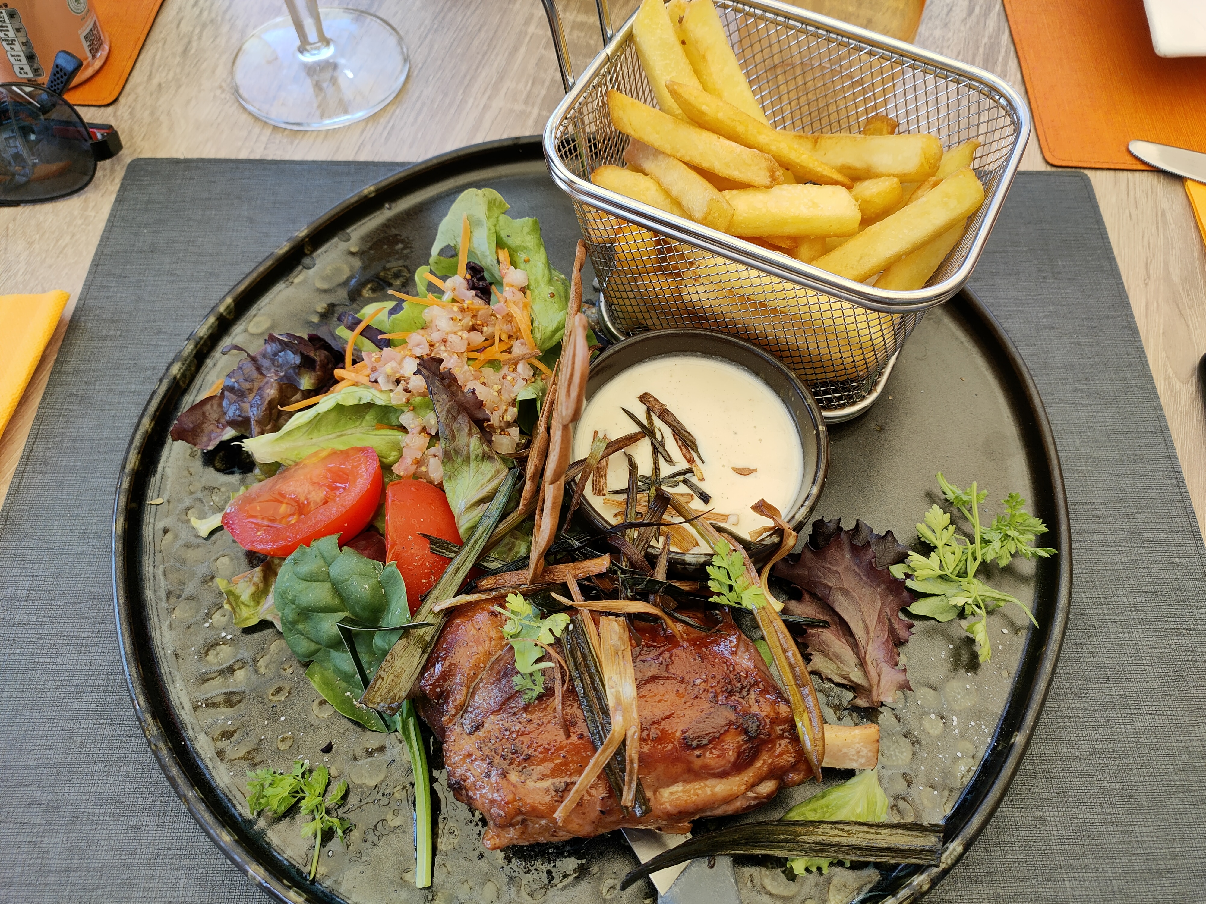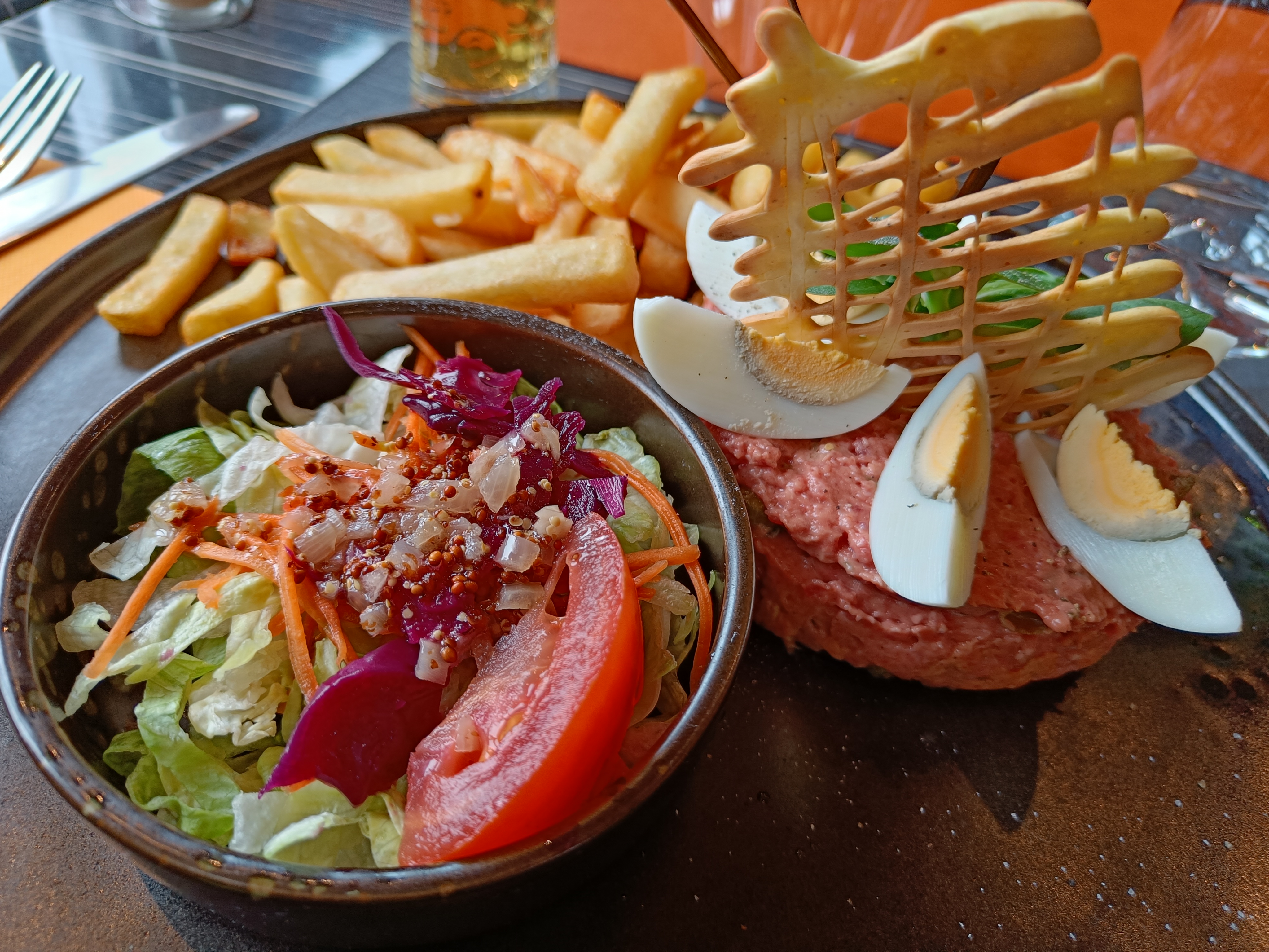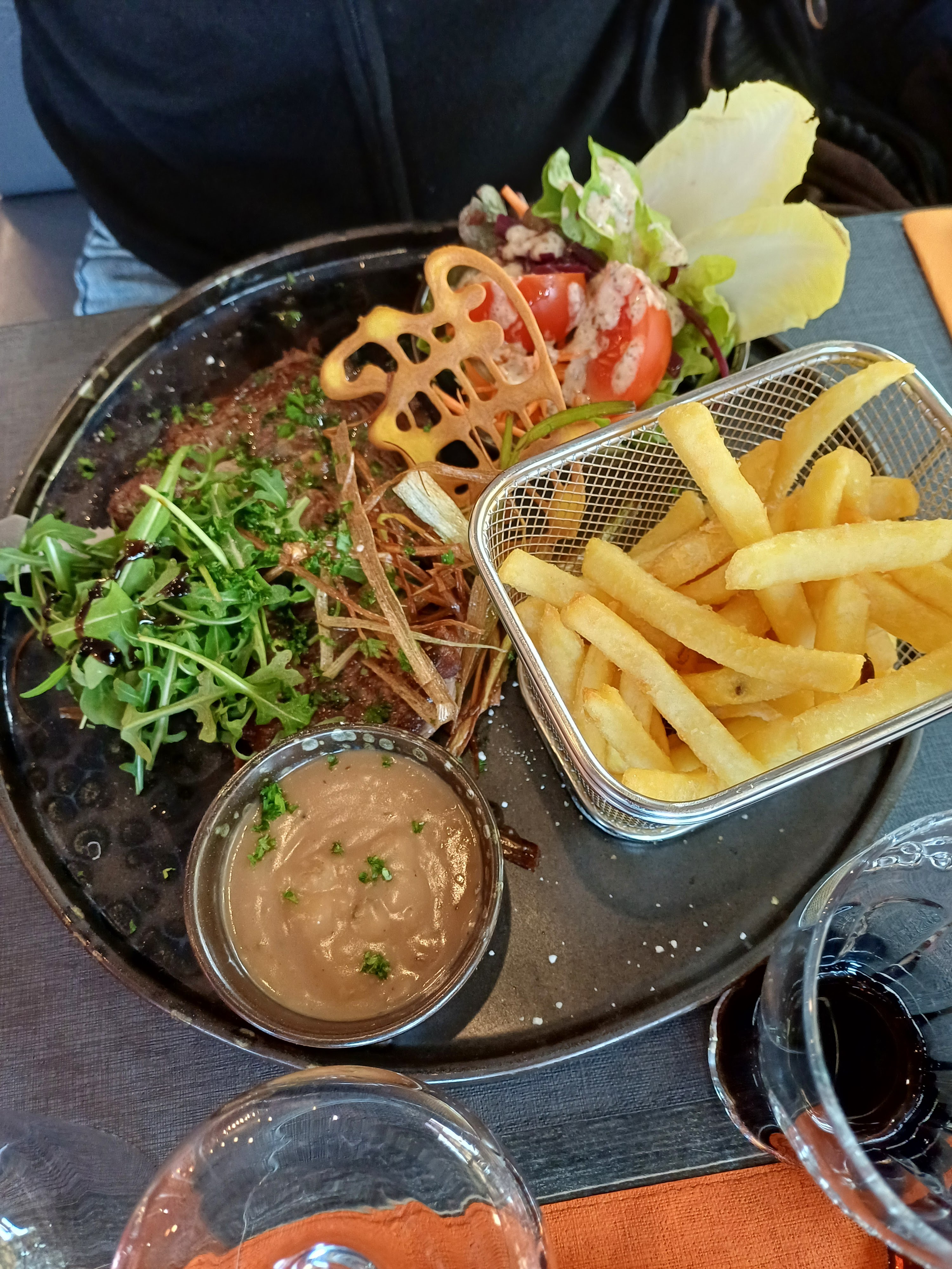 Qualité moyenne, viande saignante trop cuite et frites surgelées, c est dommage, belle présentation de l assiette, service avant 14h...