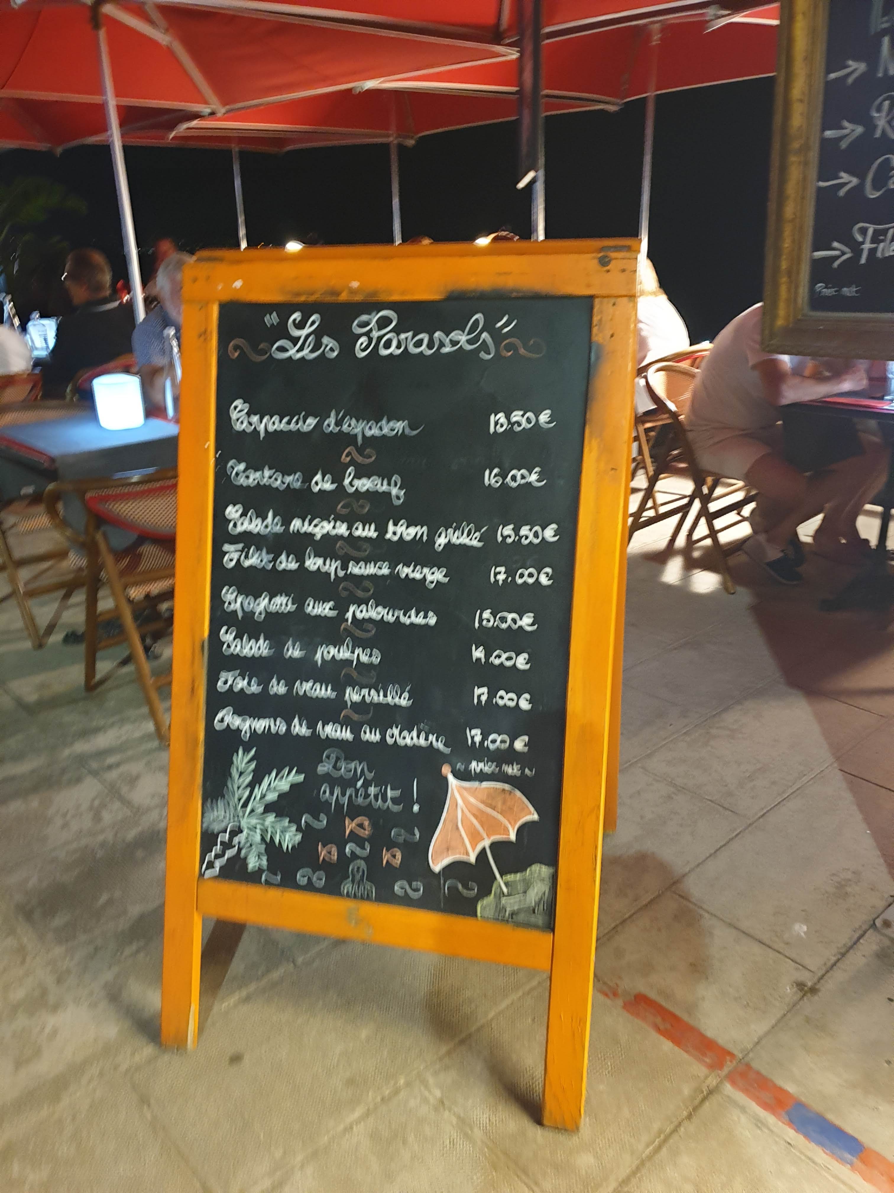 De passage a Menton, nous sommes venus ici par hasard, et nous avons été accueillis comme des rois pour manger une crêpe et boire un coup par Philipe. Nous avons du coup décidé de manger là le soir, nous avons donc réservé une table en bord de mer. Nous étions 4 et nous avons pris mes amis et moi des entrées à partager, c'est pour ça que je peux vous recommander la salade de poulpe et le carpaccio d'espadon. J'ai ensuite mangé en plat, mix de LOUP et de DORADE, un véritable délice. Sans doute un des meilleurs restaurants de toutes nos vacances 👌🏻👌🏻 Le rapport qualité prix est top. malgré que nous ne soyons que des visiteurs, j'applaudis pour la fibre commerçante, c'est aussi pour ça que j'ai pris le temps de vous mettre un bel avi !! Merci Philippe, pour ton accueil, merci au cuistot pour ses délicieux entremets et merci à toute l'équipe Des Parasols