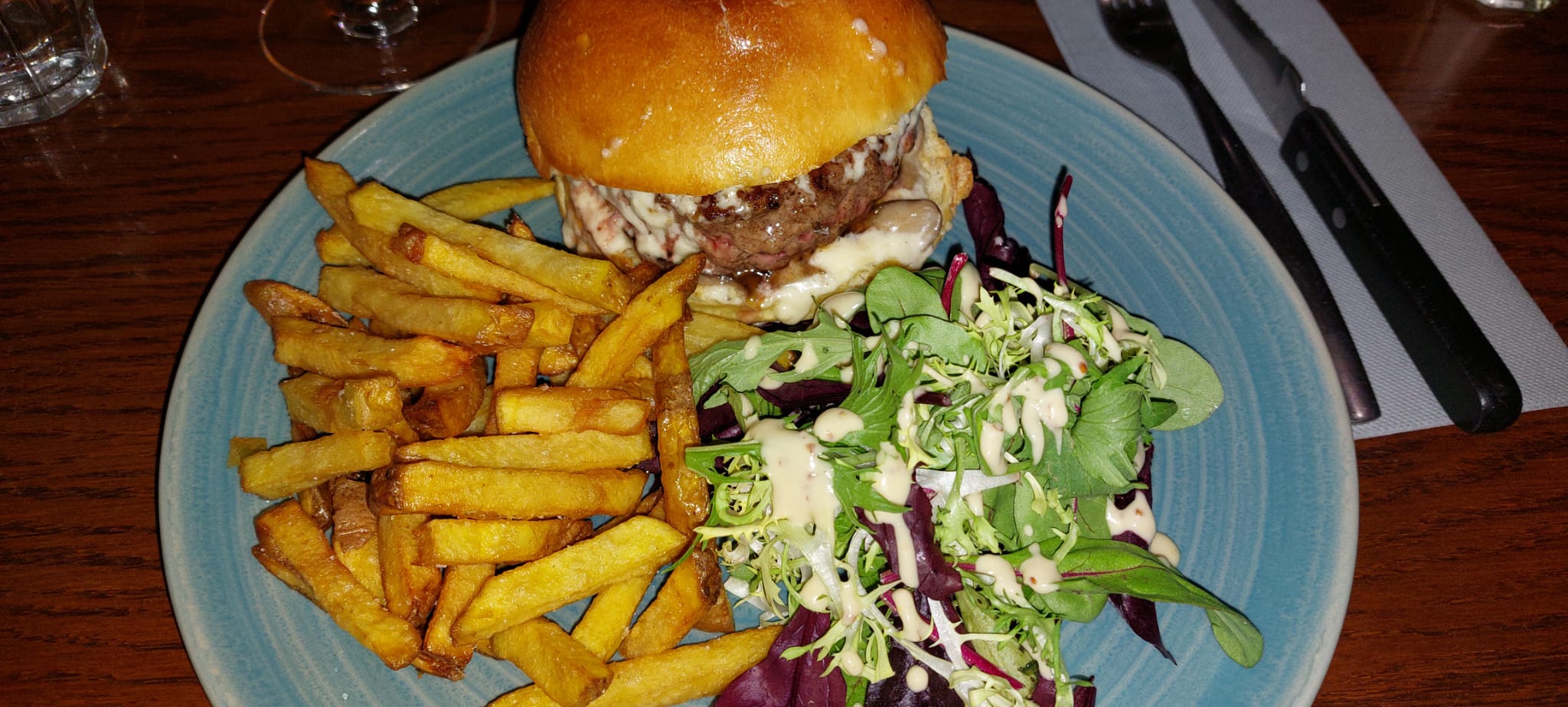 La cuisine est bonne avec des Burgers originaux, l'andouillette est une bobosse. Pensez à réserver car il y a souvent du monde midi et soir.