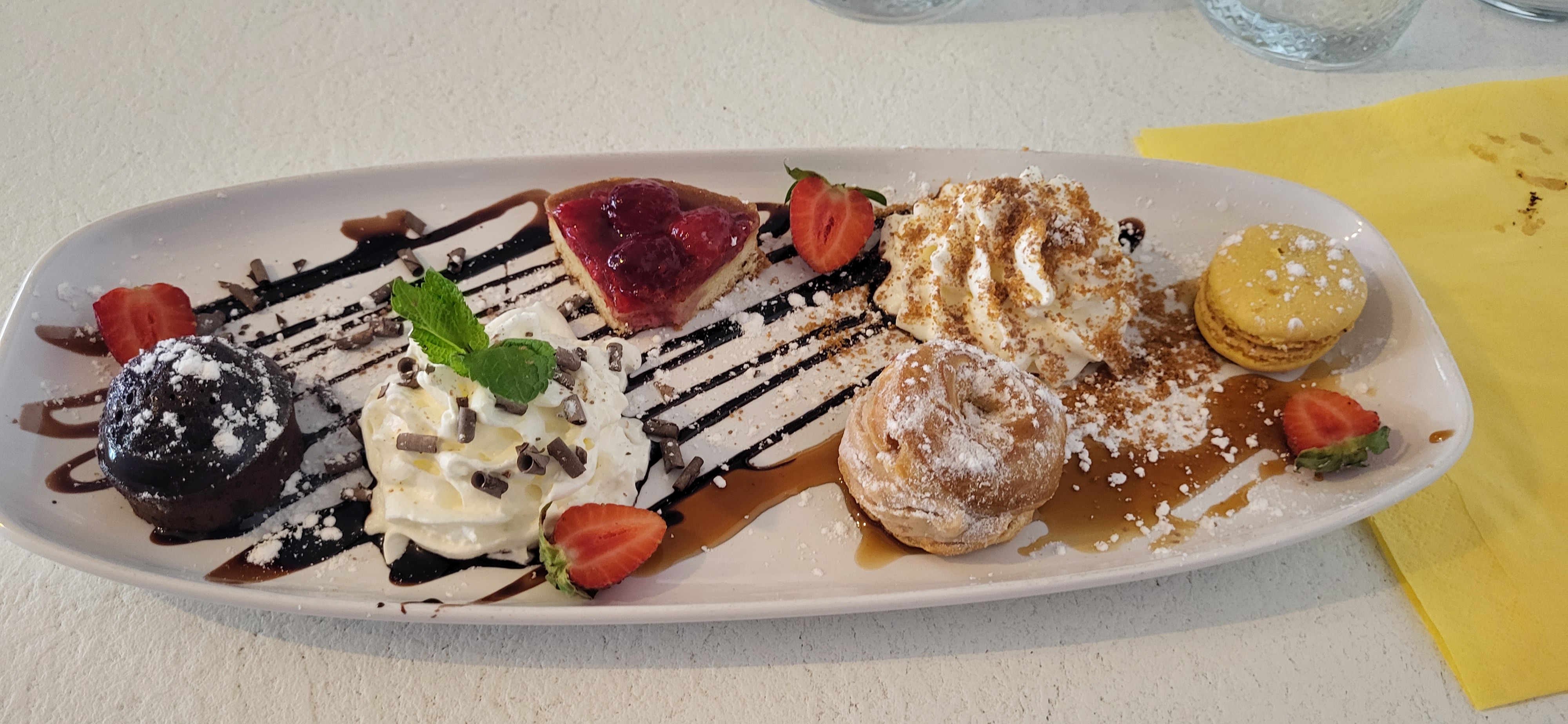 Restaurant qui peut paraître simple de premier abord mais très bon choix de produits. Il y a de la cuisine. Une pizza végétarienne avec de vrais légumes et une très bonne pâte. Un café gourmand simple mais très bon. Un service de qualité. Nous avons fortement après notre passage imprévu dans ce restaurant. Une bonne surprise .