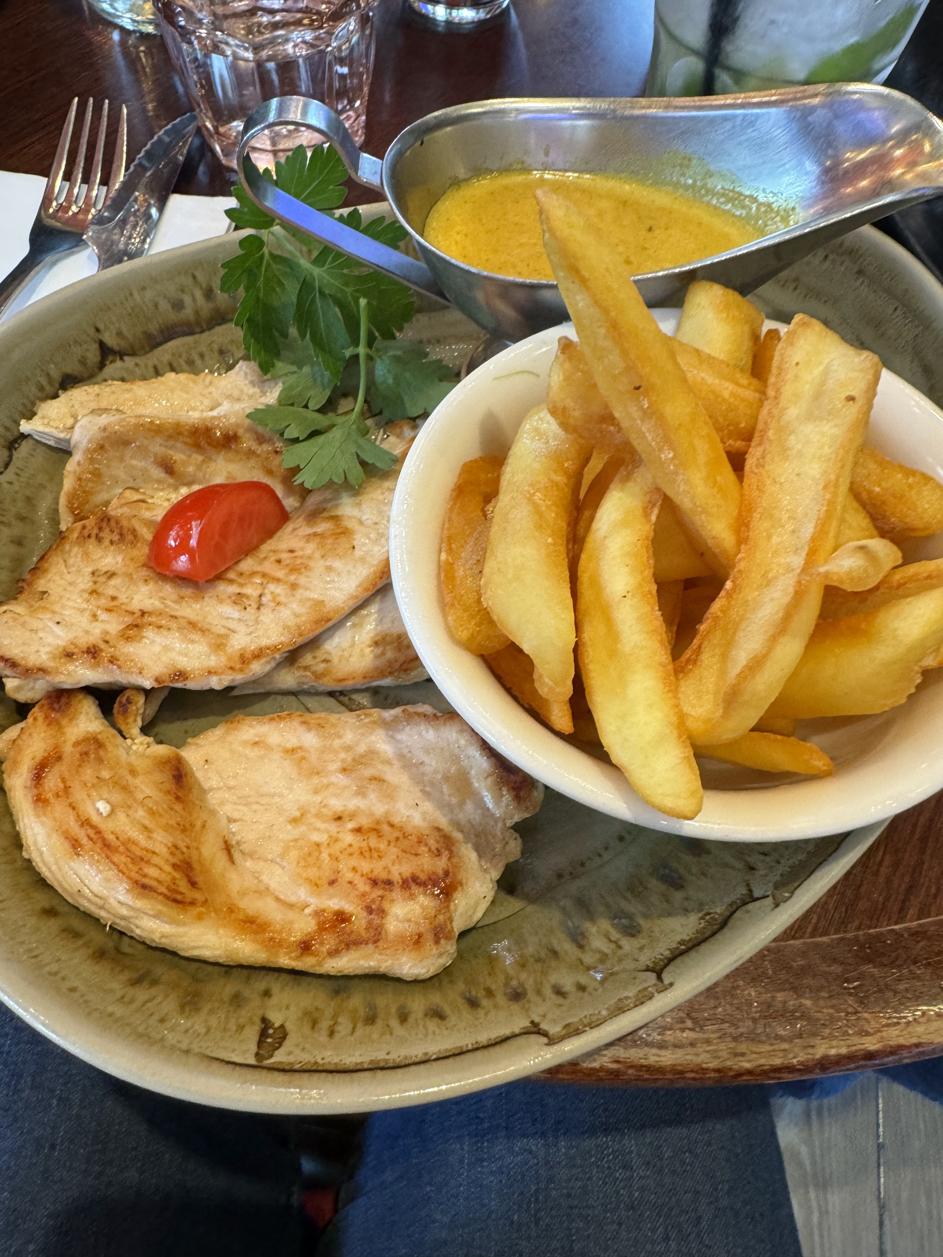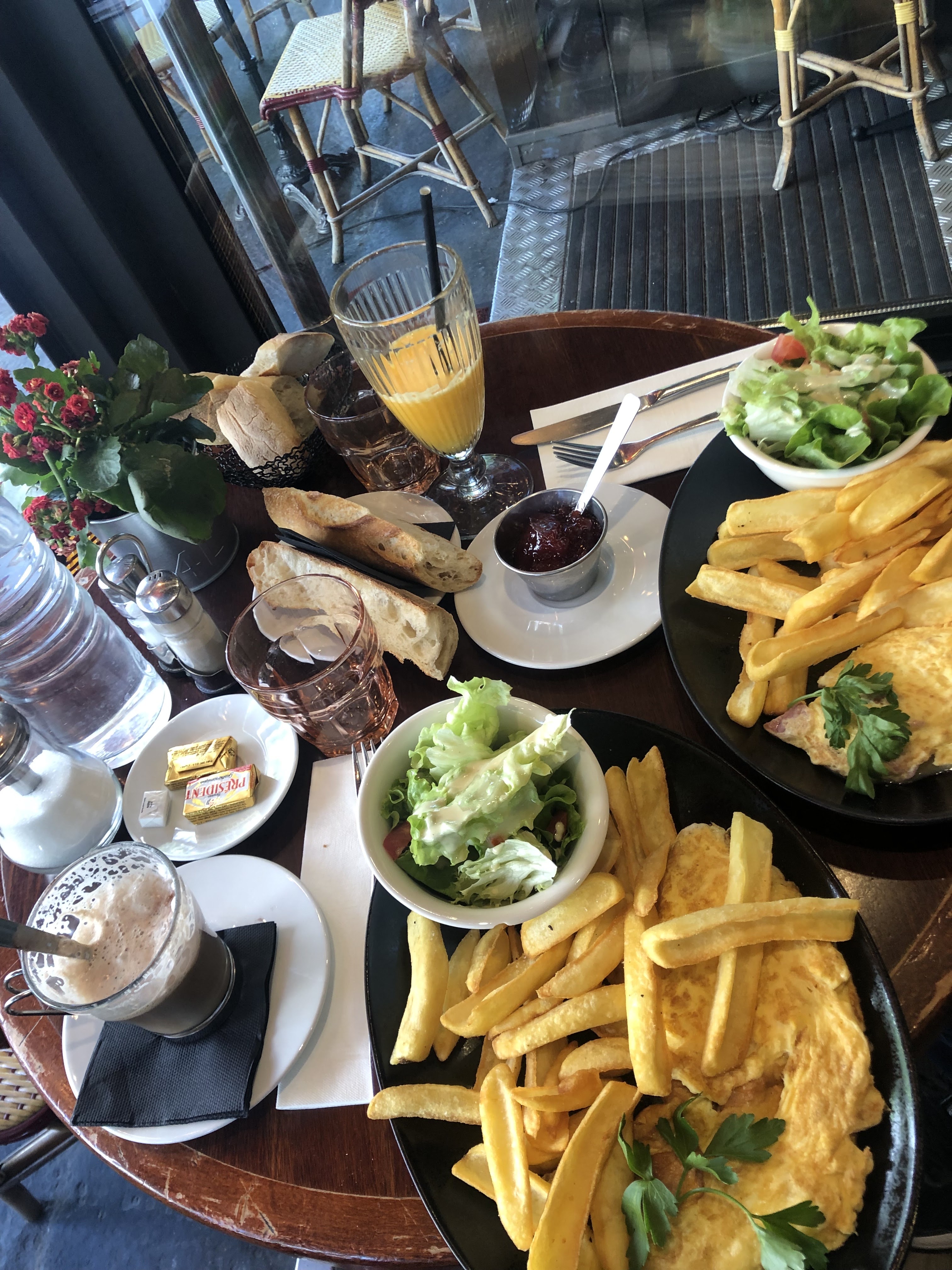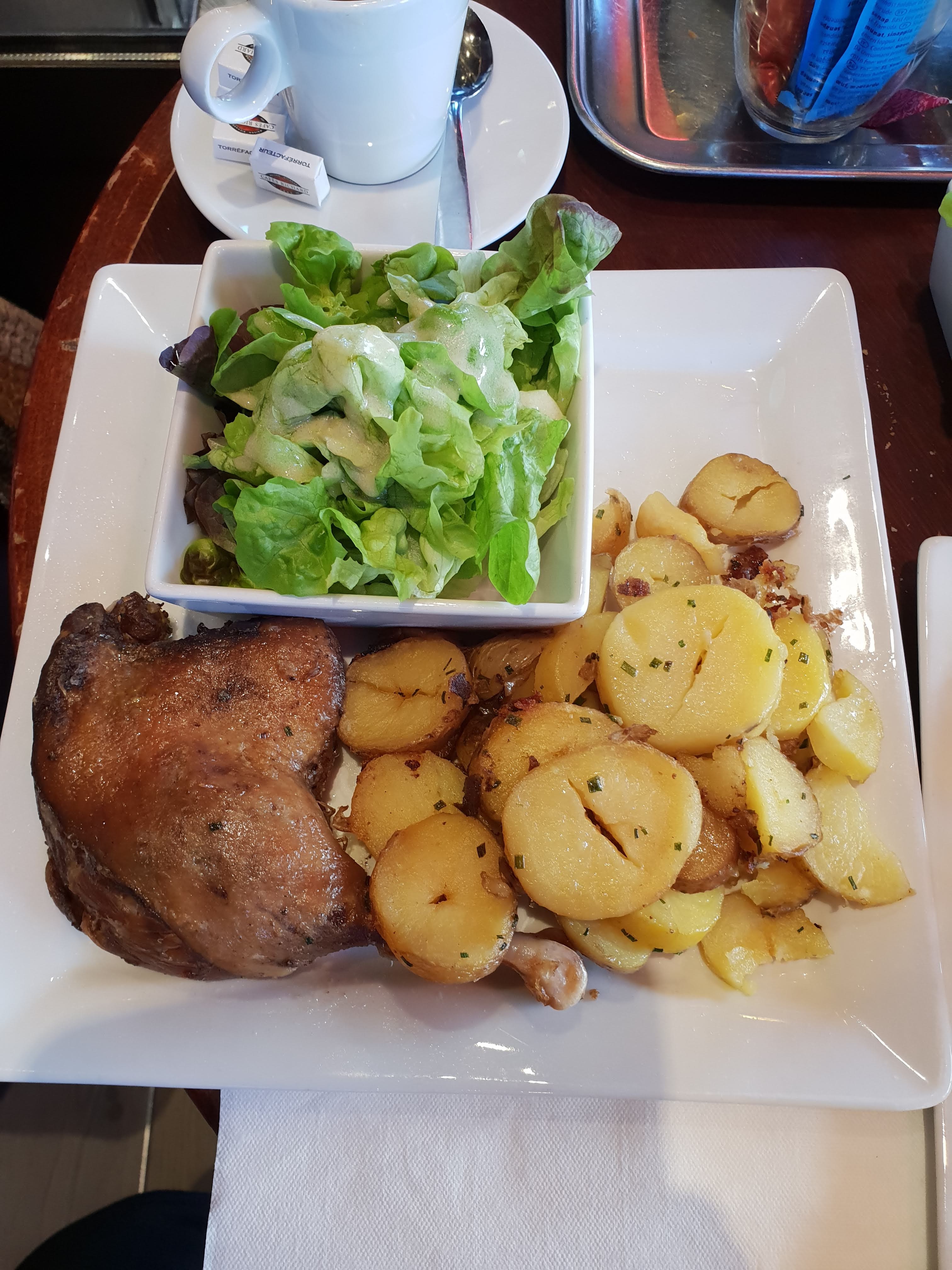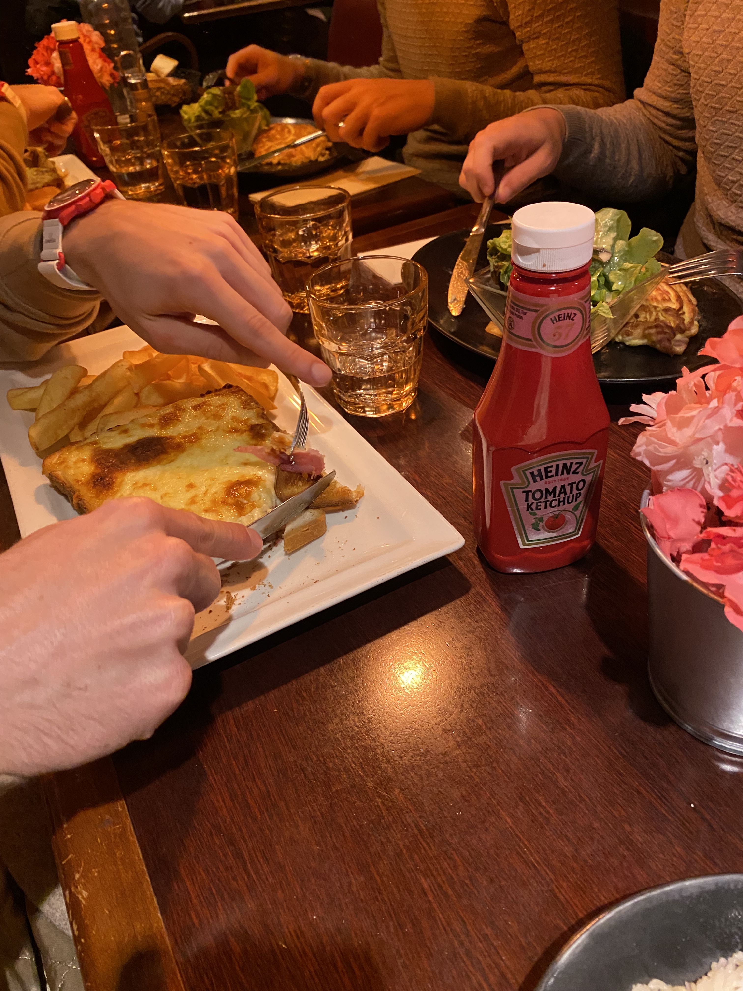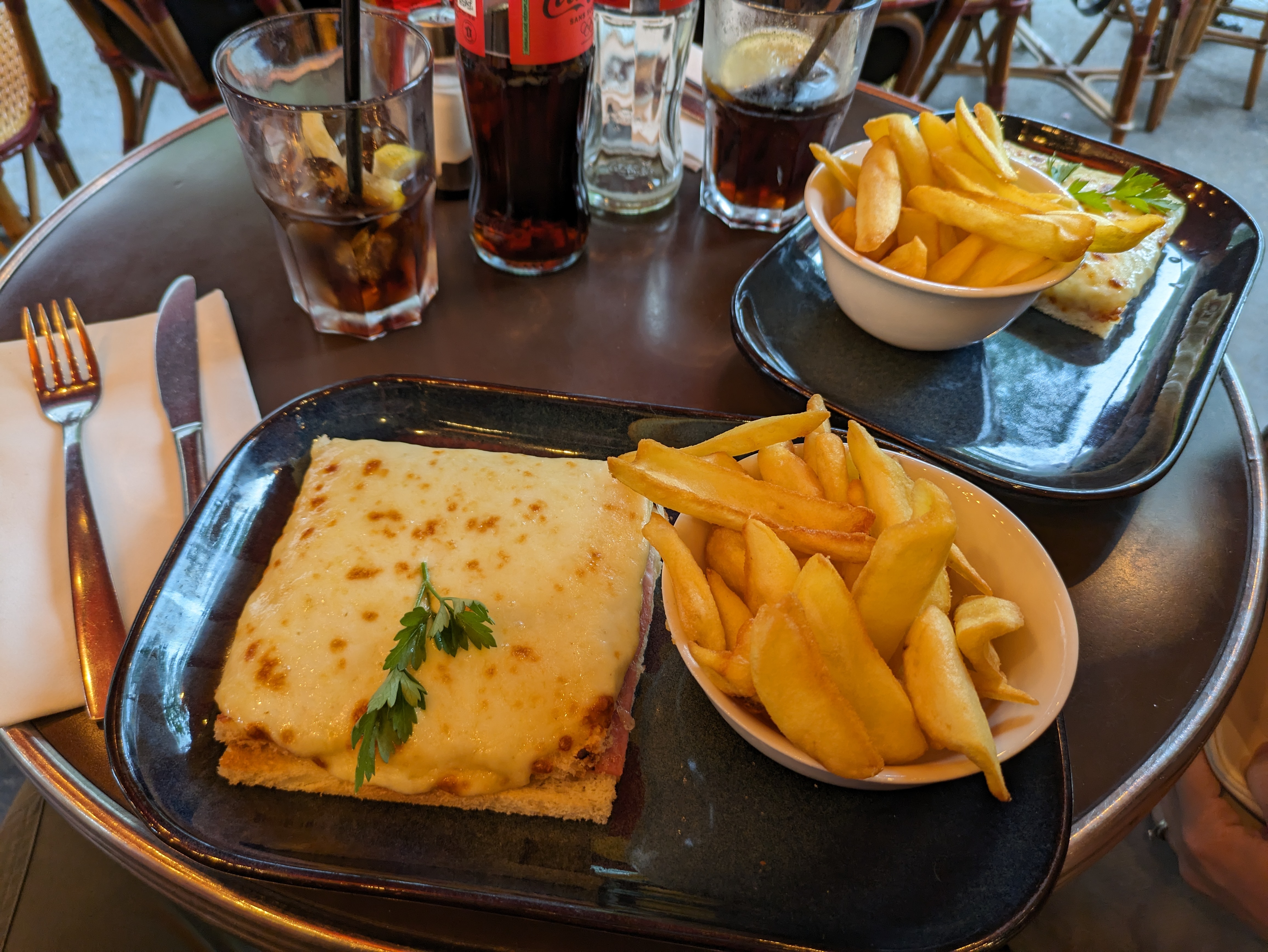 Escalope de veau moyenne, Poulet au carry médiocre Croque monsieur médiocre. Bonne atmosphère. C'est dommage que cela se présente comme une brasserie typiquement française au lieu de cela, vous finissez par manger une nourriture médiocre de niveau touristique.