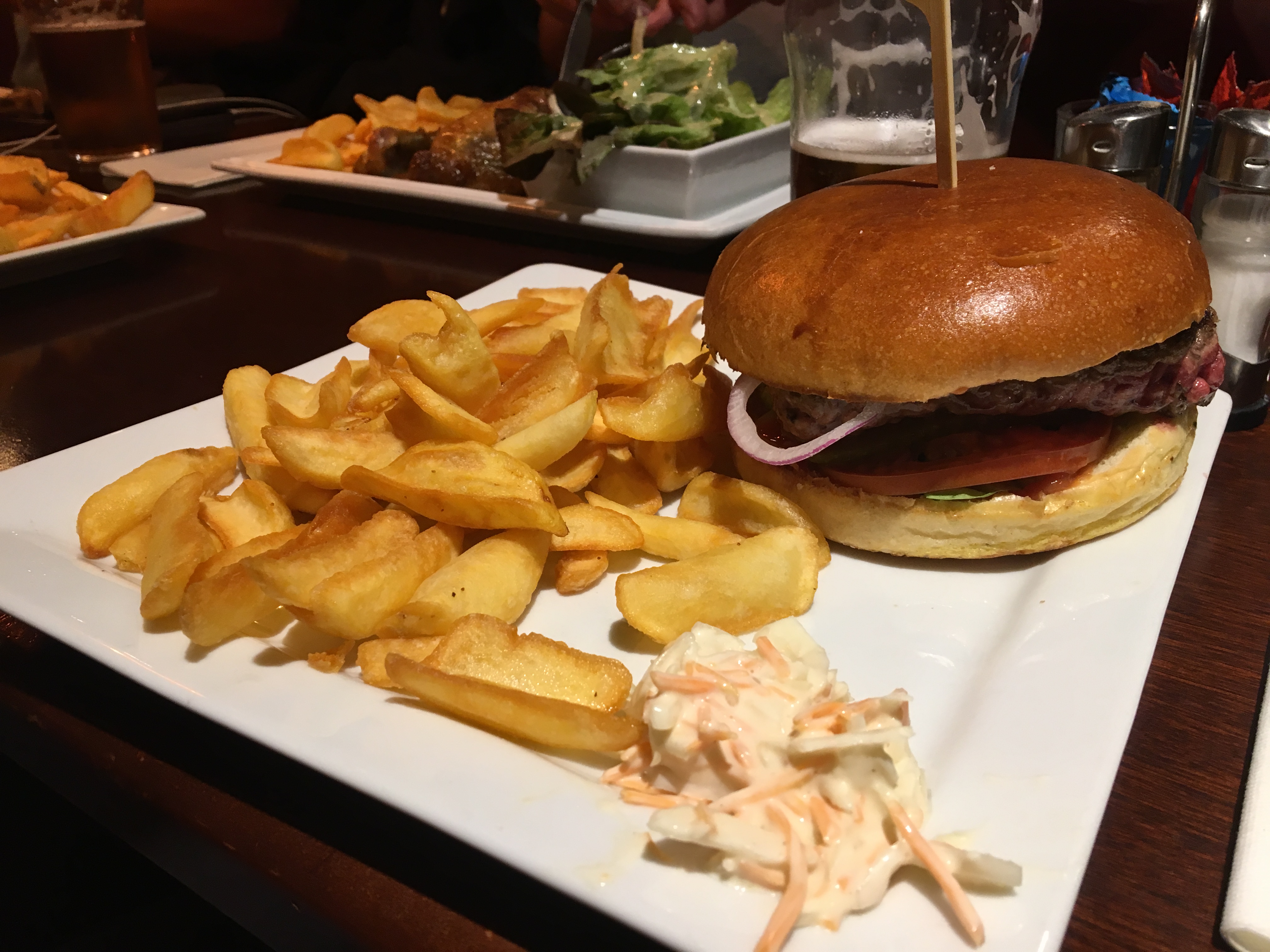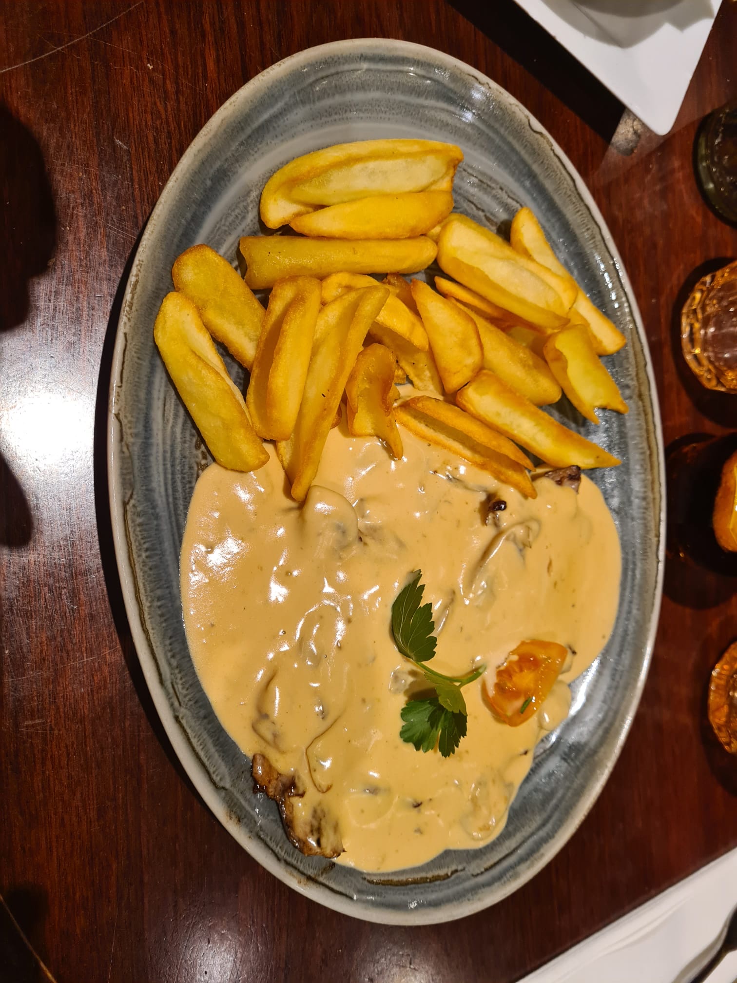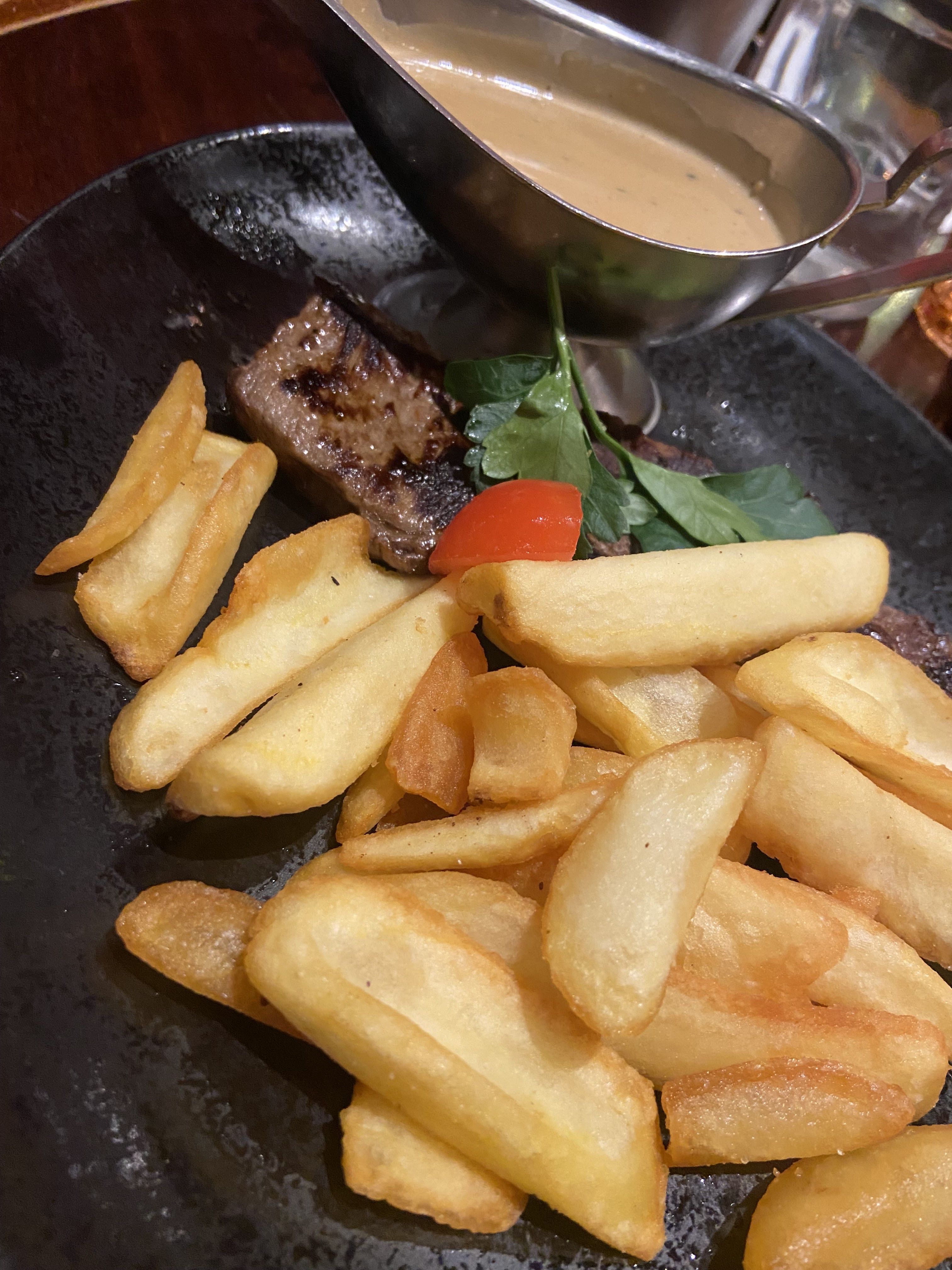 Le service était très bon, le jeune homme qui s'occupait de notre table a fait un excellent travail !! Il était très attentif à notre table. La nourriture était correcte, le steak et les frites - le steak n'était pas très tendre, un peu moelleux. La salade Royal Cesar avec du poulet était ok. La vinaigrette César était fade. Et la cocotte de bœuf bourguignon était ok. POV - endroit agréable pour prendre une bière ou un verre et la nourriture est bonne.