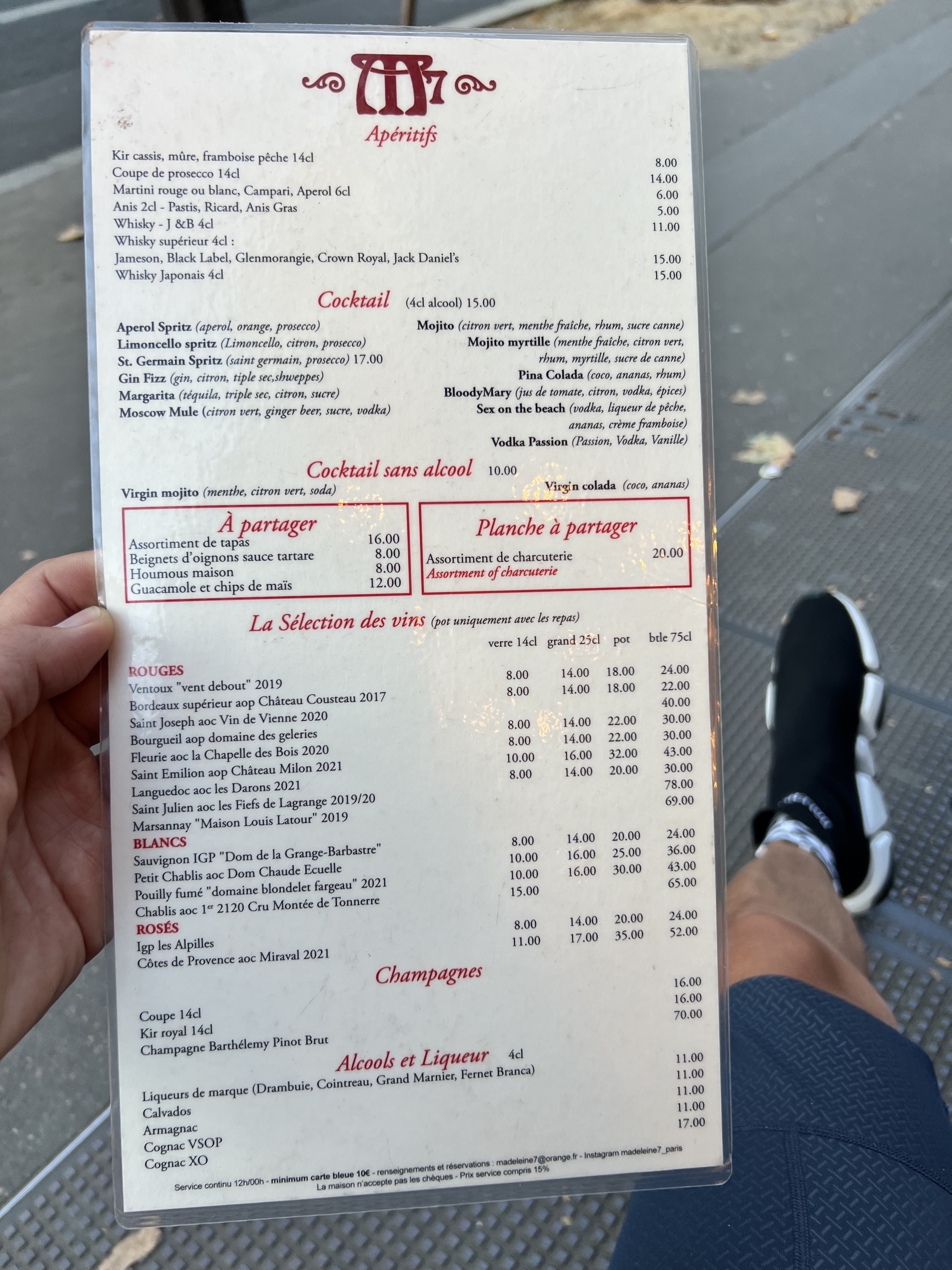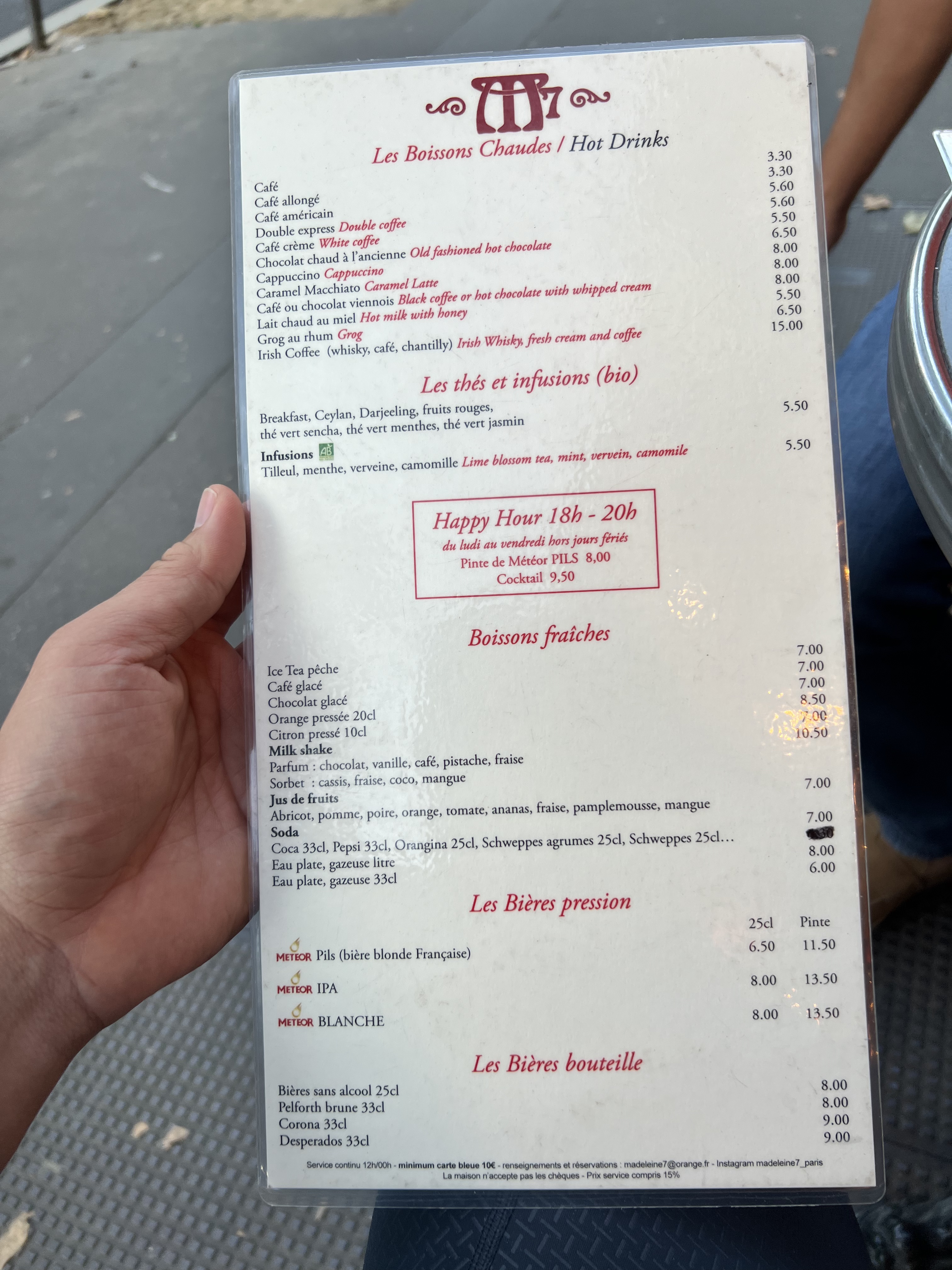 C'est le premier endroit où nous sommes allés en arrivant à Paris. Nous nous sommes vite rendu compte que notre connaissance de la langue française était inexistante. Nous ne pouvions pas traduire Google assez rapidement. Haha. Nous avons fait de notre mieux et notre serveur a immédiatement reconnu et parlait suffisamment anglais pour nous aider. Il était sympathique et patient et m'a permis de pratiquer mon français. Nous avons entendu des histoires cauchemardesques sur la façon dont les Américains sont traités en France, surtout si nous ne parlons pas la langue. Notre expérience ici nous a montré tout autre chose et a donné le ton pour le reste de notre voyage. Nous avons continué à essayer de parler la langue et tout le monde a continué à nous aider. Nous prévoyons d'y retourner dans quelques années et ramènerons certainement nos amis à Madeline 7. Notre français sera également bien meilleur d'ici là. Merci!