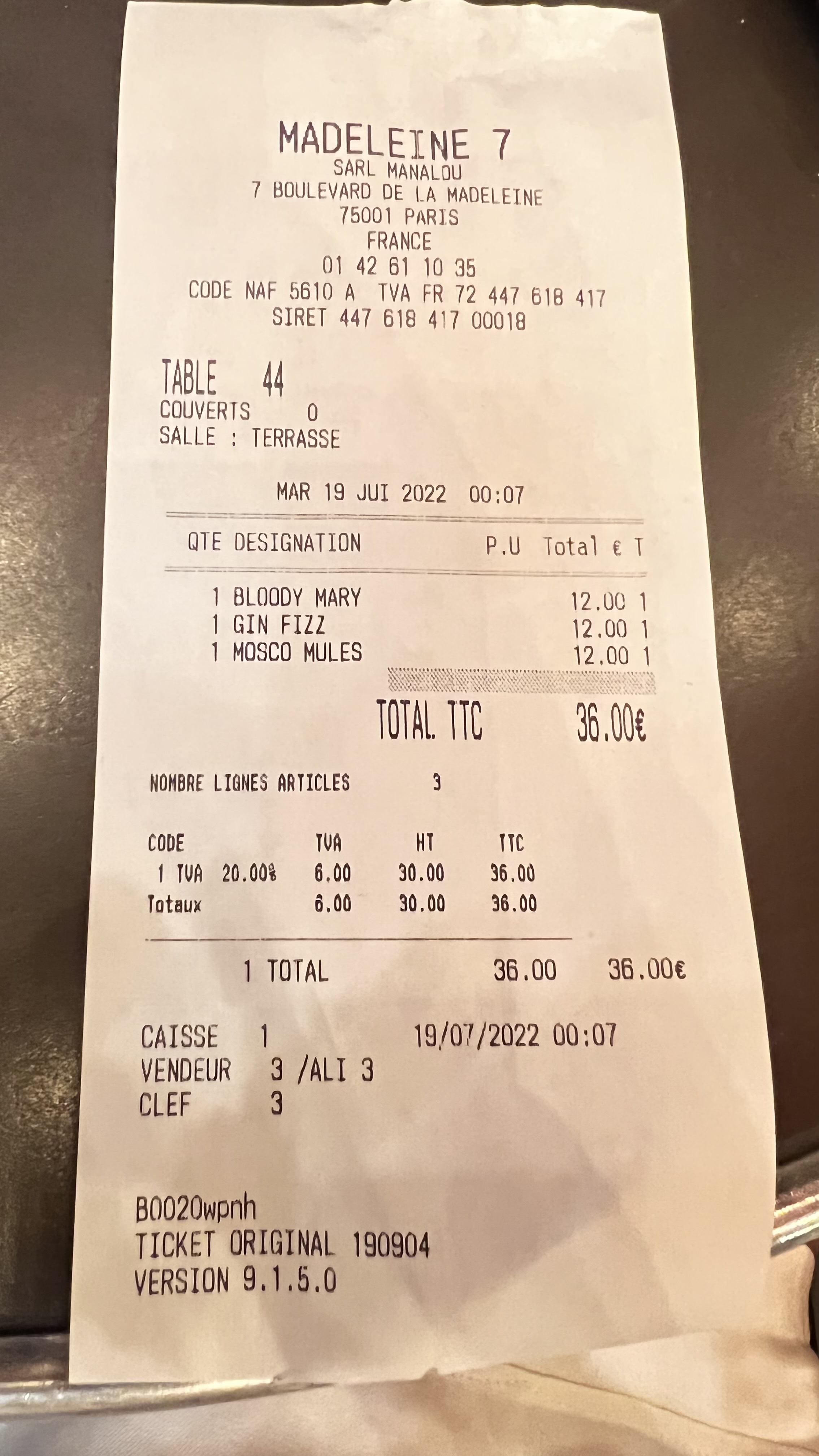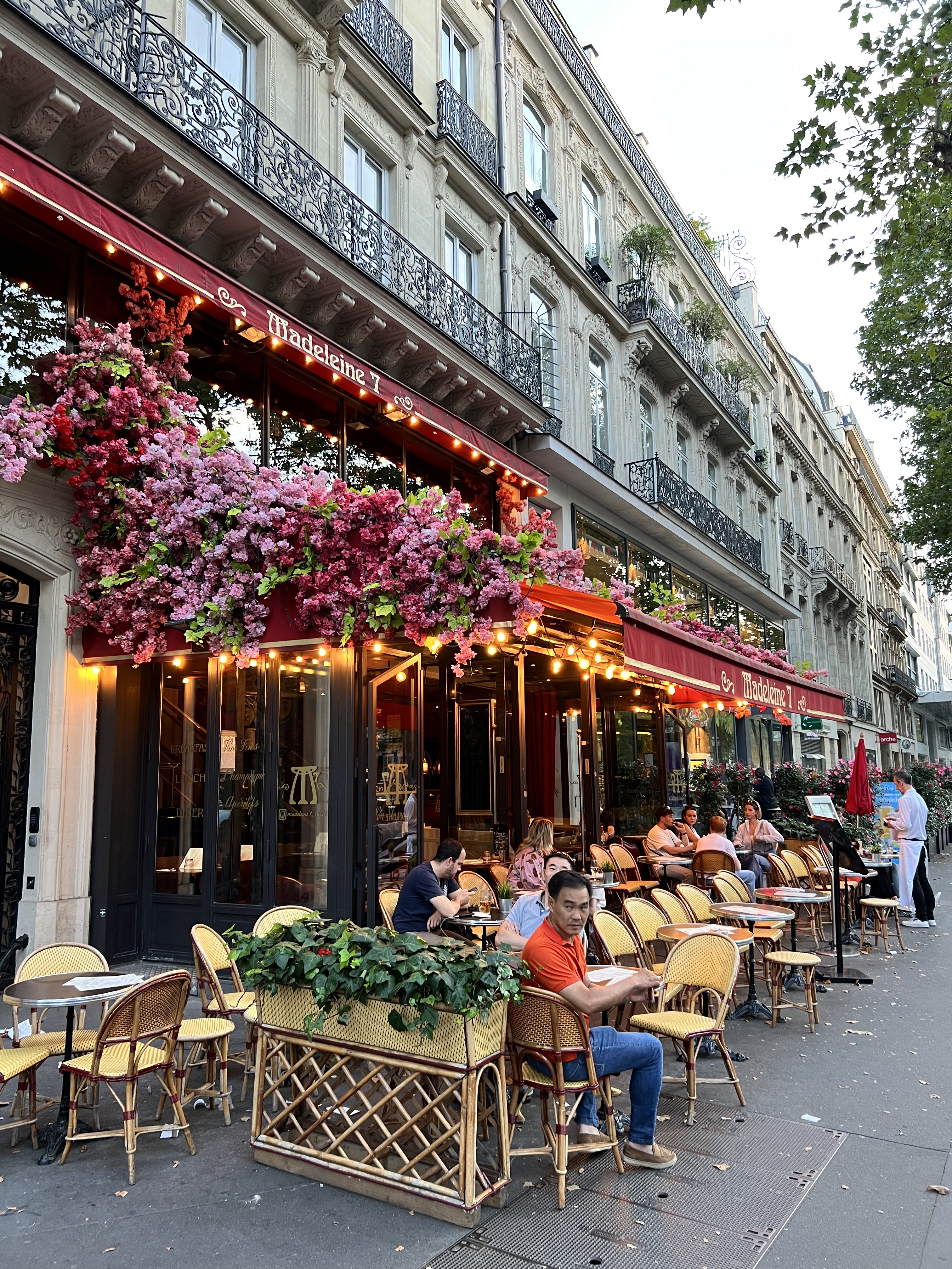 Madeleine 7 est une brasserie parisienne typique du boulevard de la Madeleine servant une cuisine française traditionnelle avec une terrasse décorée de fleurs roses et un mobilier emblématique en bois « Belle Époque » conçu aux étages supérieurs et inférieurs. J'y suis allé avec des amis français vivant à Paris le 1er janvier. Nous avons pris un Croque monsieur avec Salade et Frites (16€), Filet de poulet grillé avec Riz (22€), Omelette Jambon, gruyère, herbes, cantal garni de frites, salade verte (16€) et deux cafés expresso (3h30). € chacun). J'ai aimé l'ambiance d'un déjeuner décontracté autour de la place Madeleine dans le 8ème arrondissement de Paris.