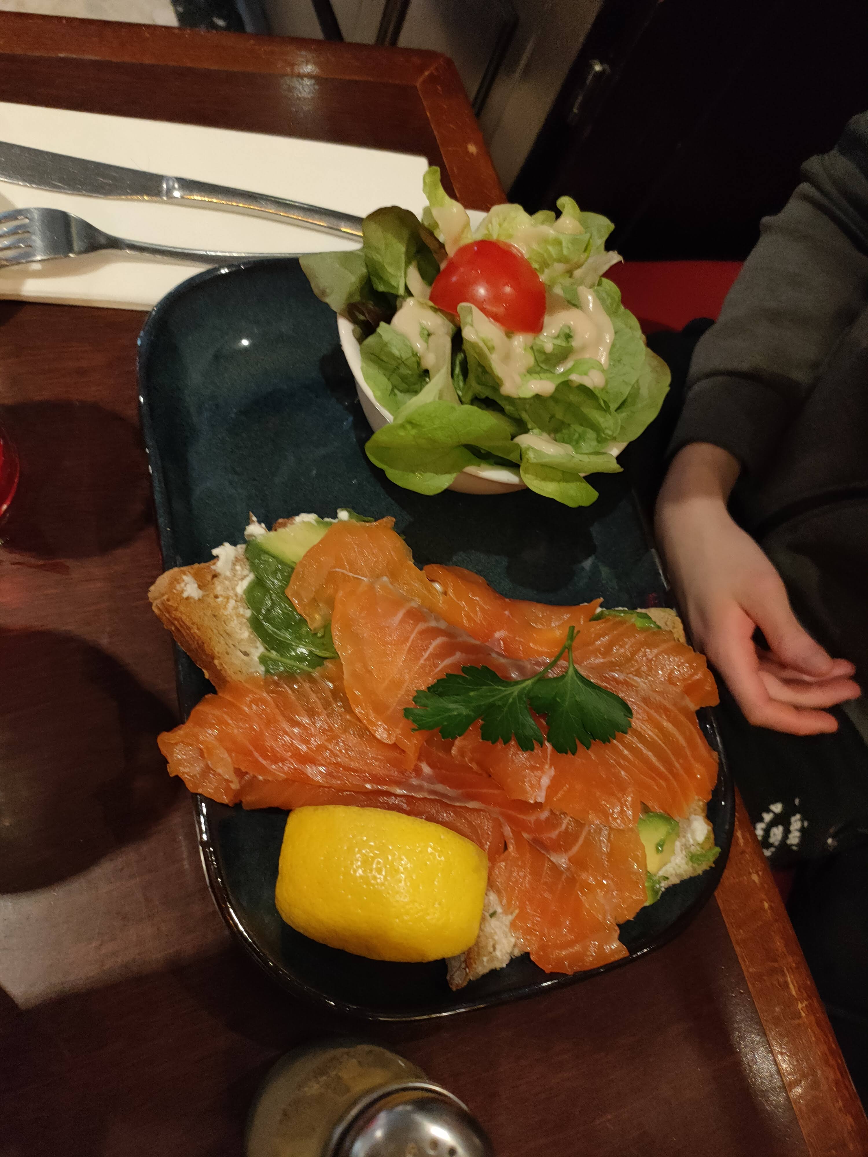 Déjeuner lors de notre passage à Paris Personnel très aimable J’avais une salade grecque Mon mari et ma fille melon jambon du pays Tout était excellent La salade était fraîche , la vinaigrette faite maison Très appréciable Rapport qualité prix très bien