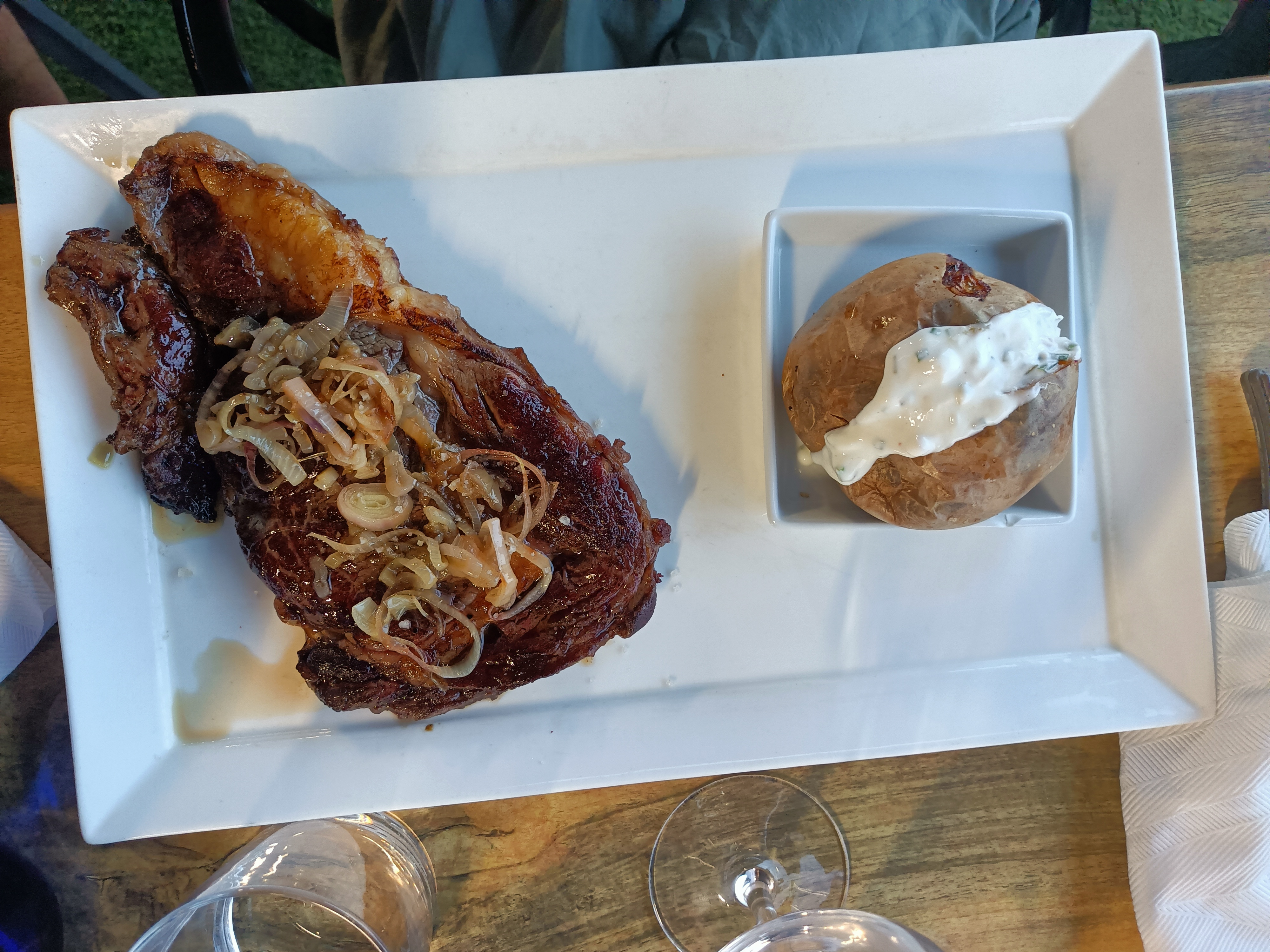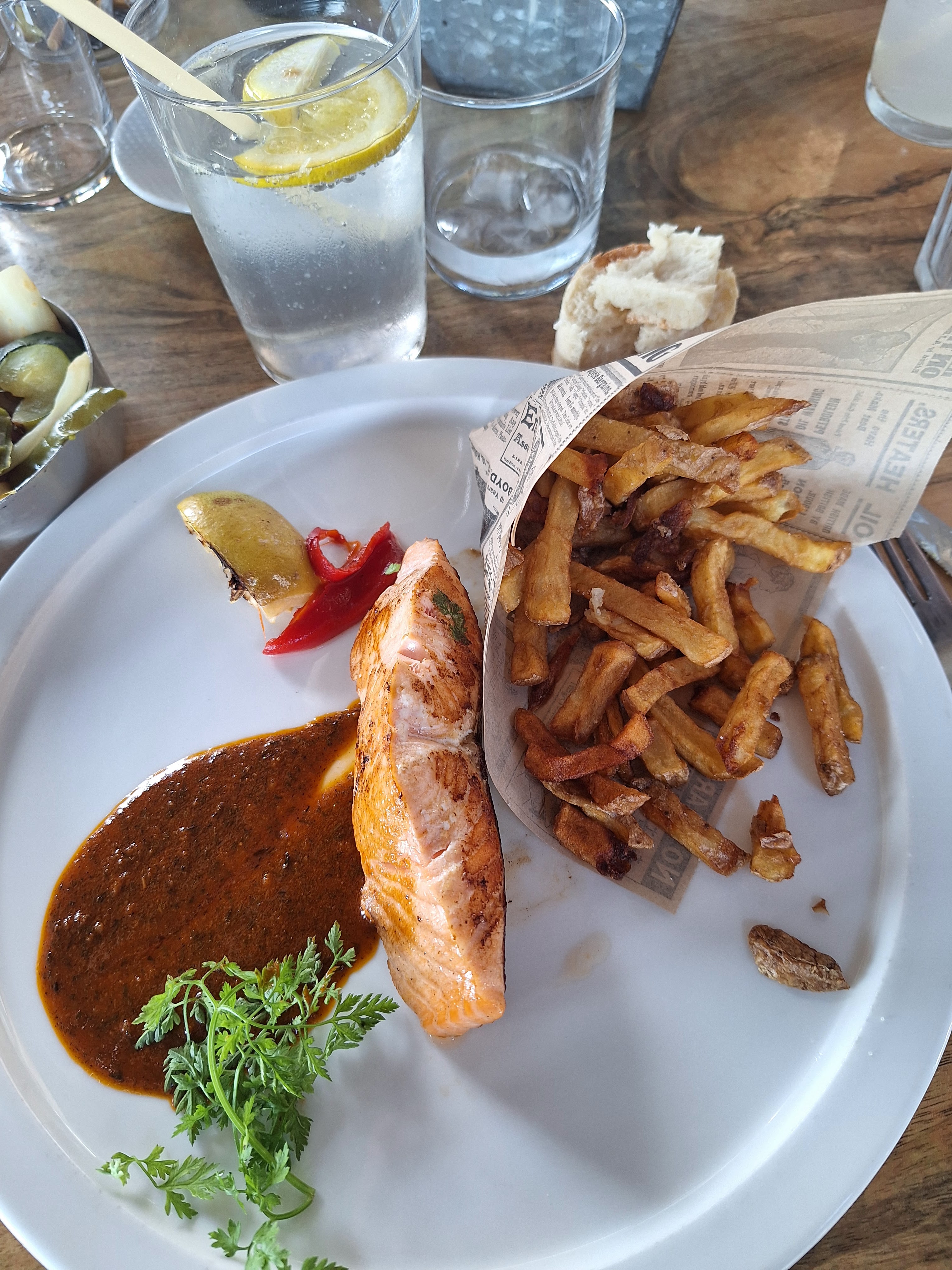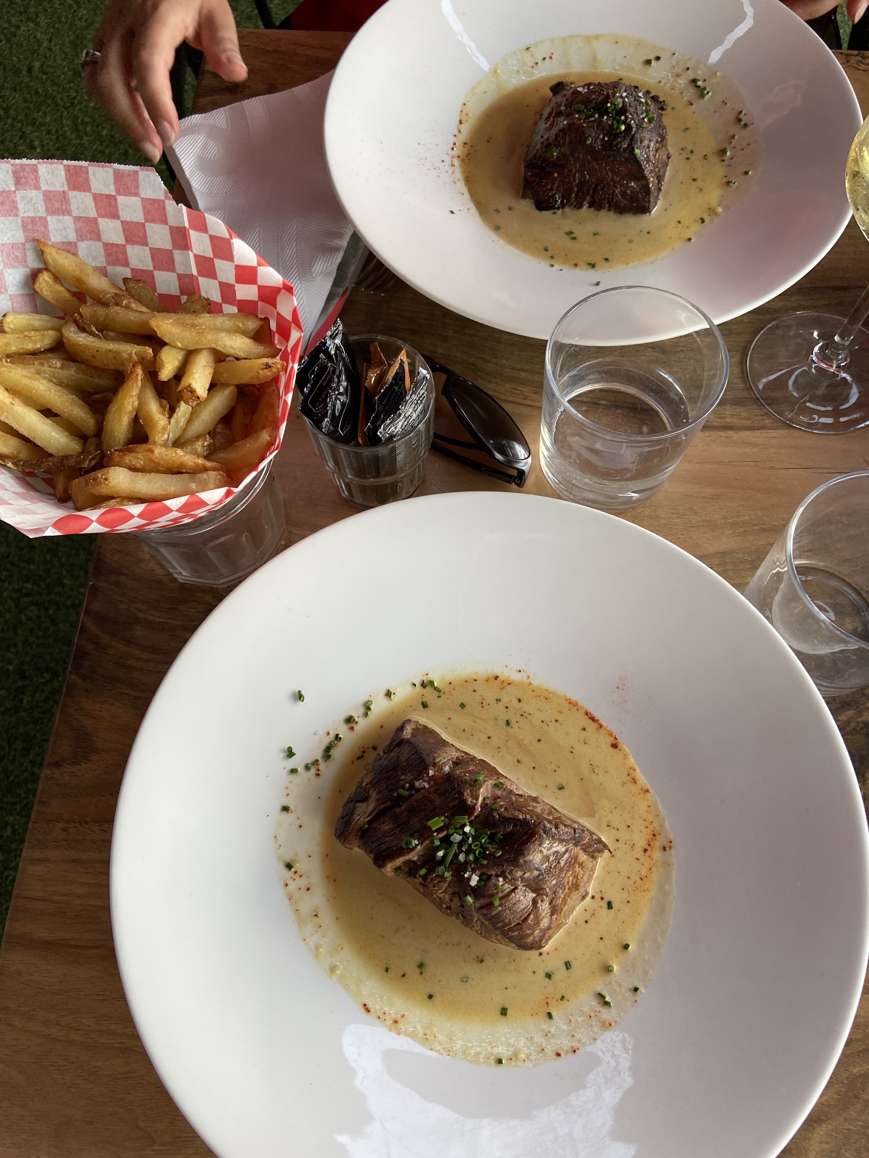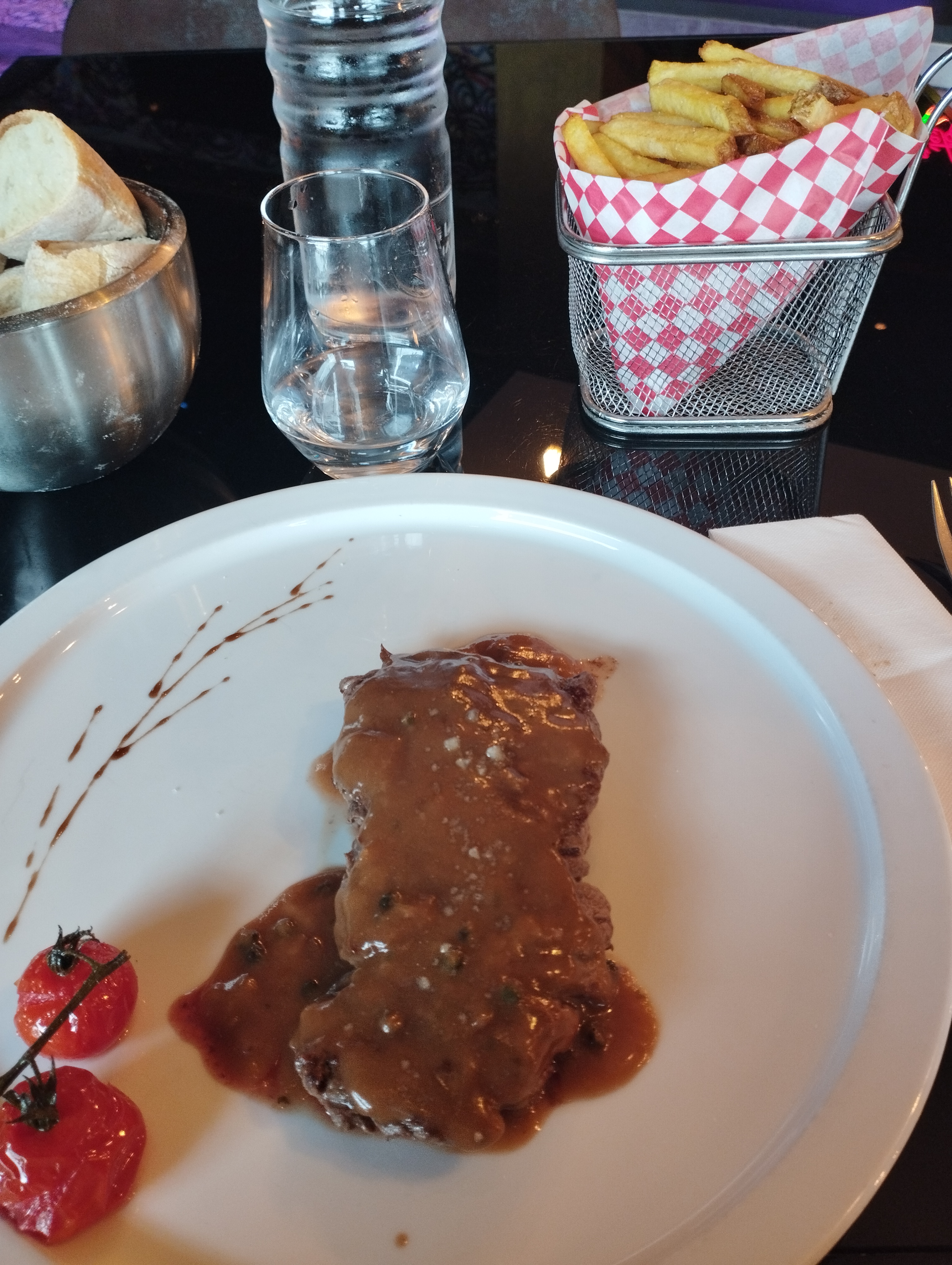 Jolie cadre cependant la viande était pleine de gras. La serveuse nous propose des sauces, ce que nous acceptons et également de l’eau. Lors du paiement nous sommes facturés 3 euros le mini pot de sauce (donc 6€ 2 sauces) et l’eau nous est facturé 5 euros. Grosse déception. Nous ne reviendrons plus
