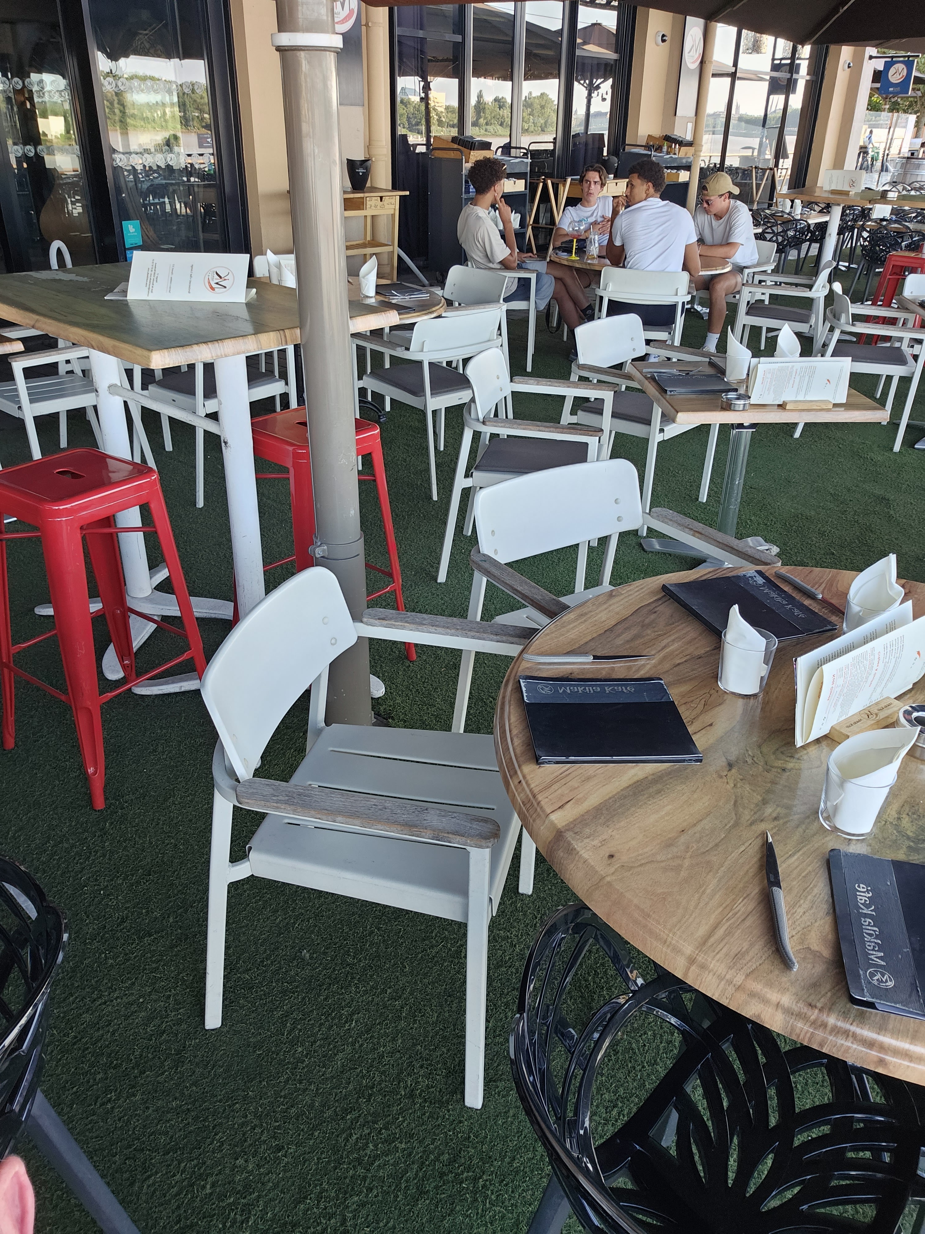 Accueil plutôt sympa sans réservation on nous laisse choisir l'emplacement que l'on veut. Pas de carte en ce moment il faut flasher le QR code sur la table pour voir le menu. Point de vue sur la Garonne agréable. Service rapide par contre les plats sont plutôt banale. L'entrecôte servit avec un véritable os à moelle et des échalottes est bonne mais sans plus (beaucoup de gras). Légumes du moment et frites très bonnes. Les desserts fait maison sont beau a voir mais sans beaucoup de saveur. Le tout servit par une serveuse peu agréable. Pour moi un peu chère par rapport à la qualité des produits. On paye surtout le cadre