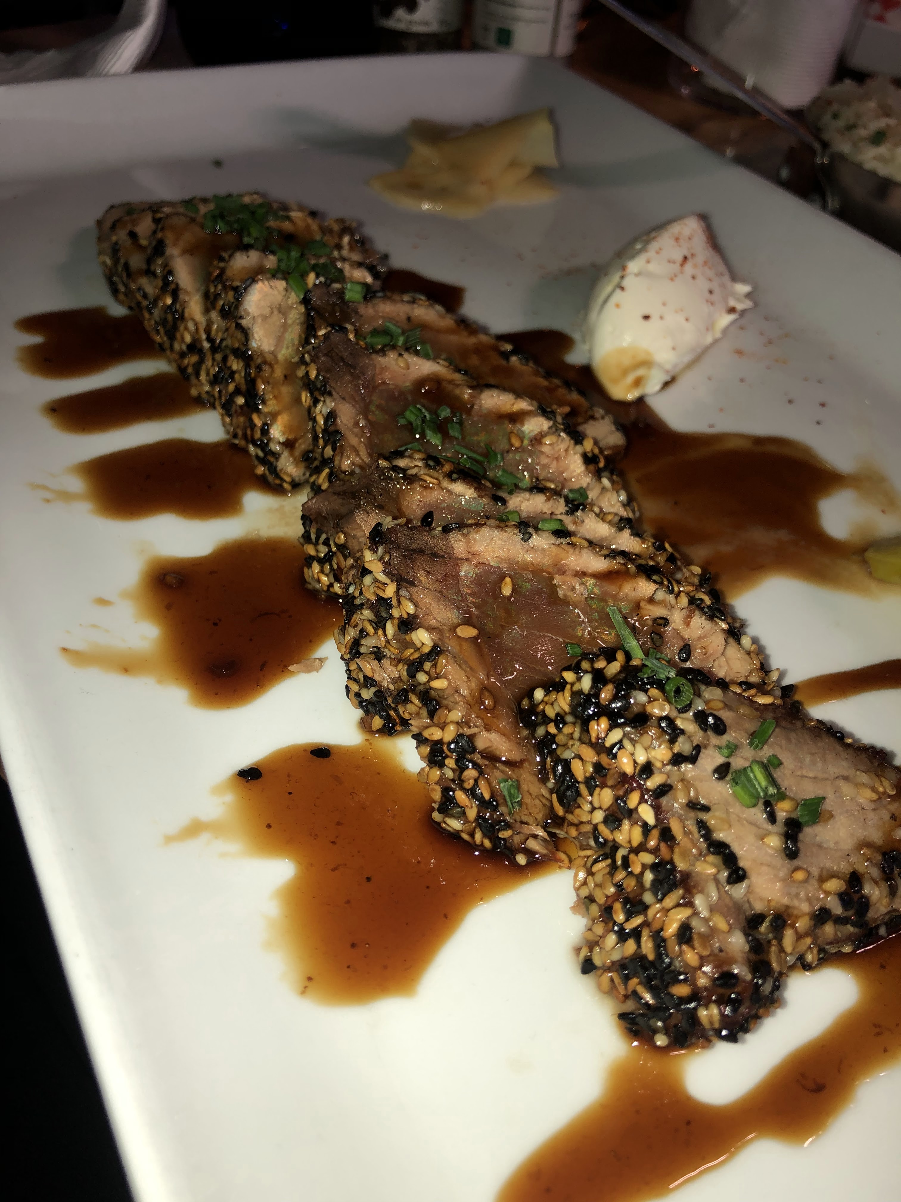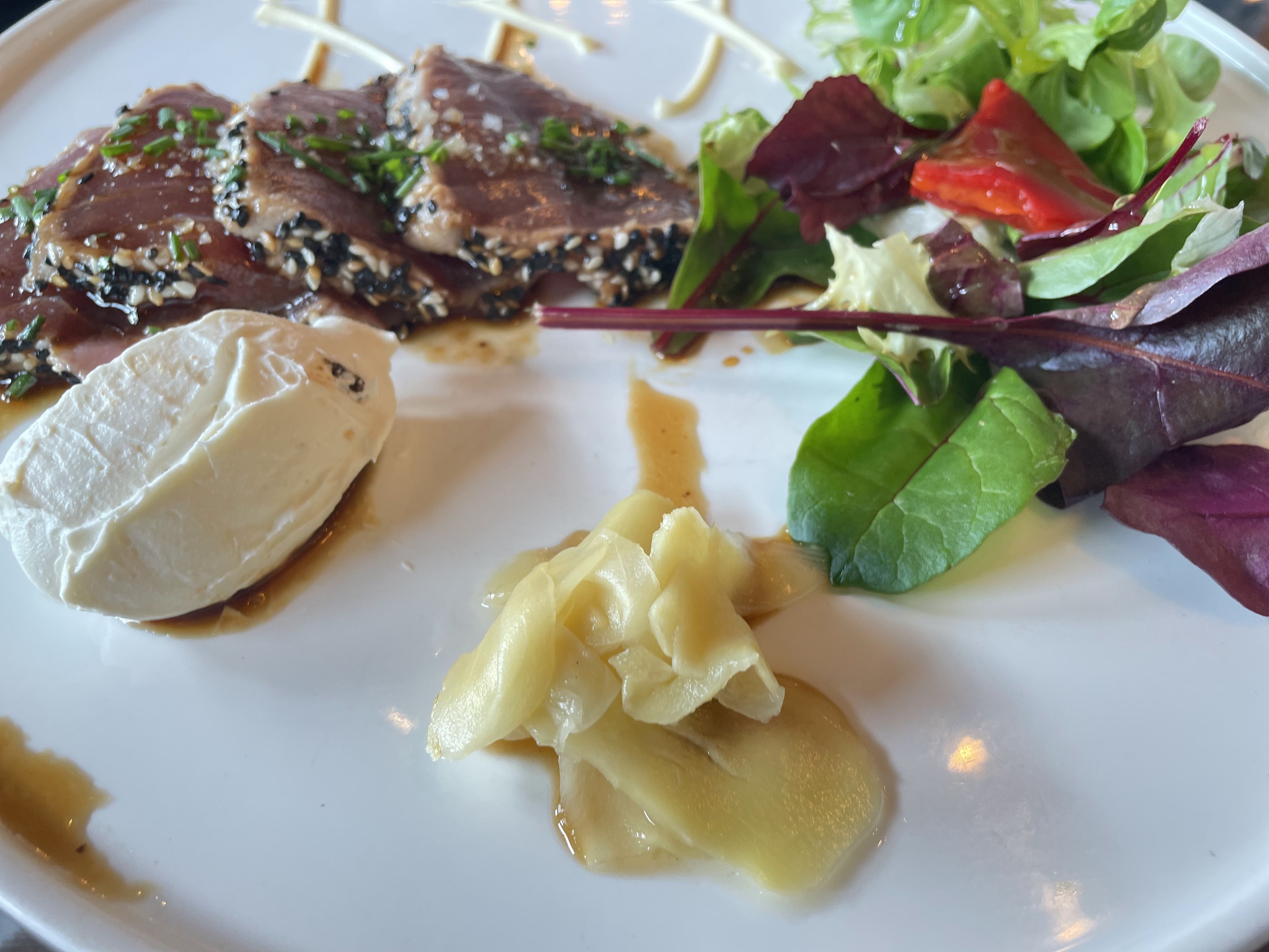 Tataki au thon accompagné d’un risotto. Ce Tataki était tendre et délicieux. Cependant, le risotto restait à desirer (manque d’assaisonnement) mais cela convenait. Le cadre est sympa et offre une vue sur la Garonne. Il y a énormément de places à l’intérieur comme à l’extérieur. Le service est très cordial, les prix sont un peu élevés mais la qualité des produits en justifie.