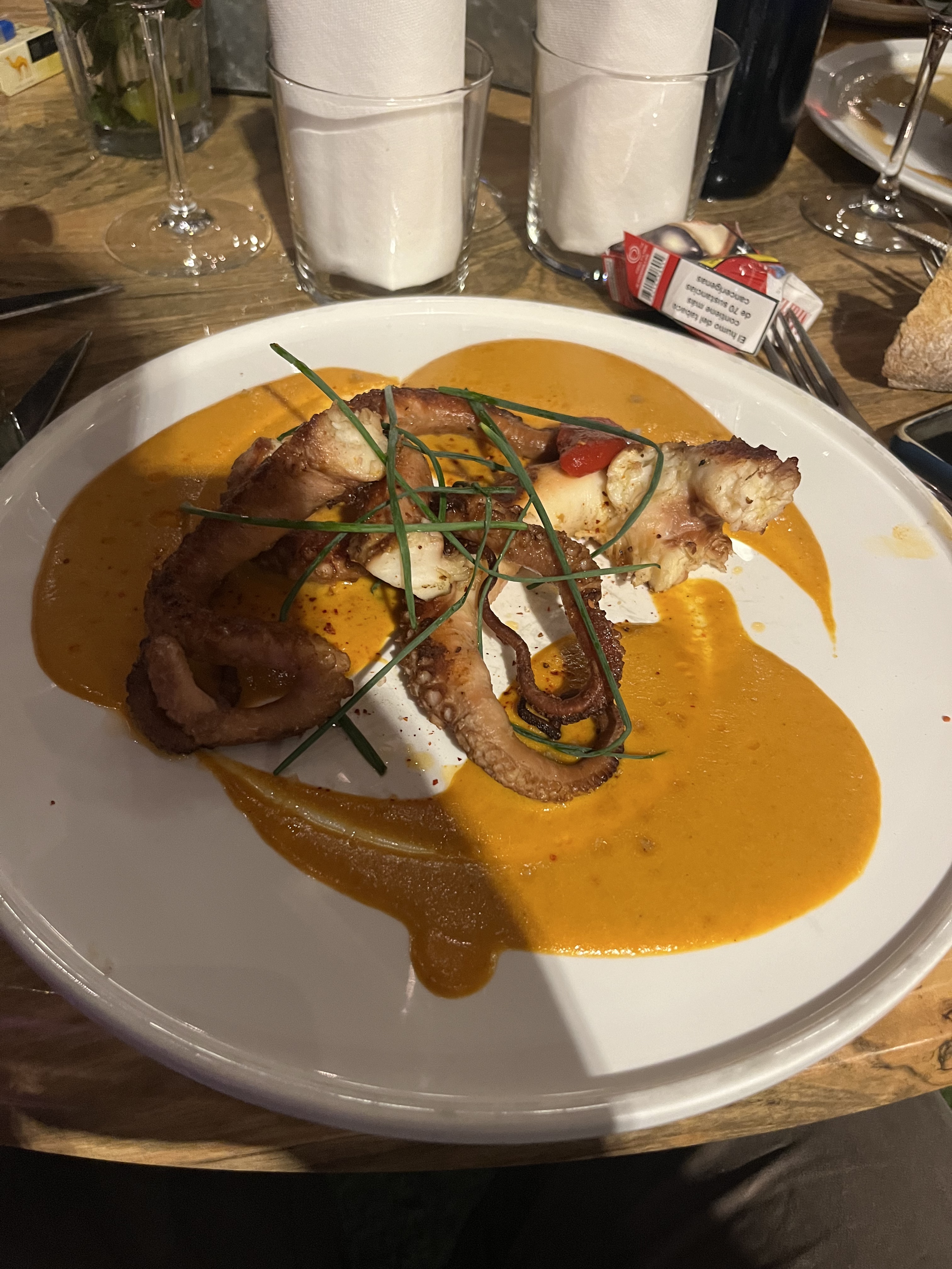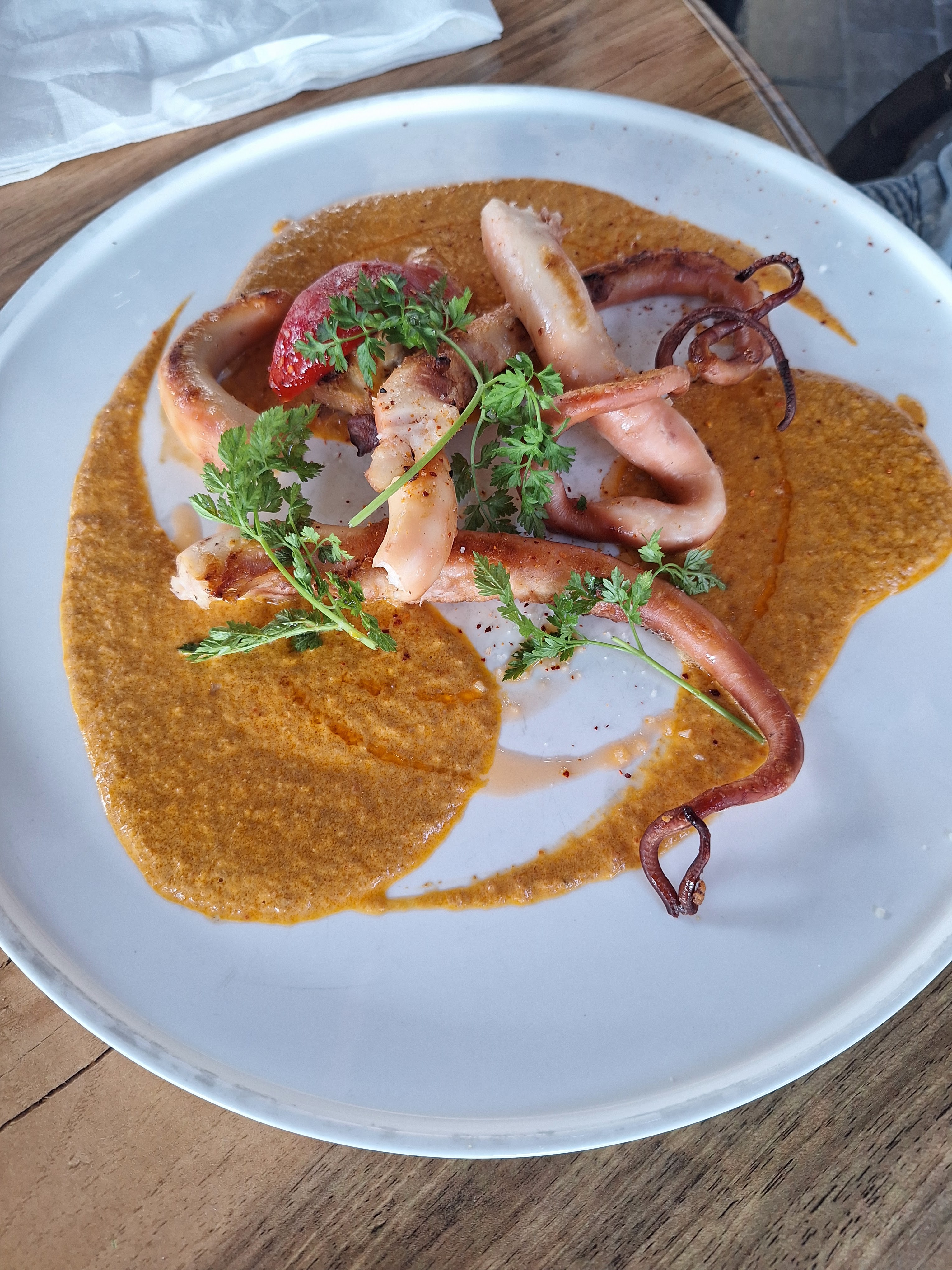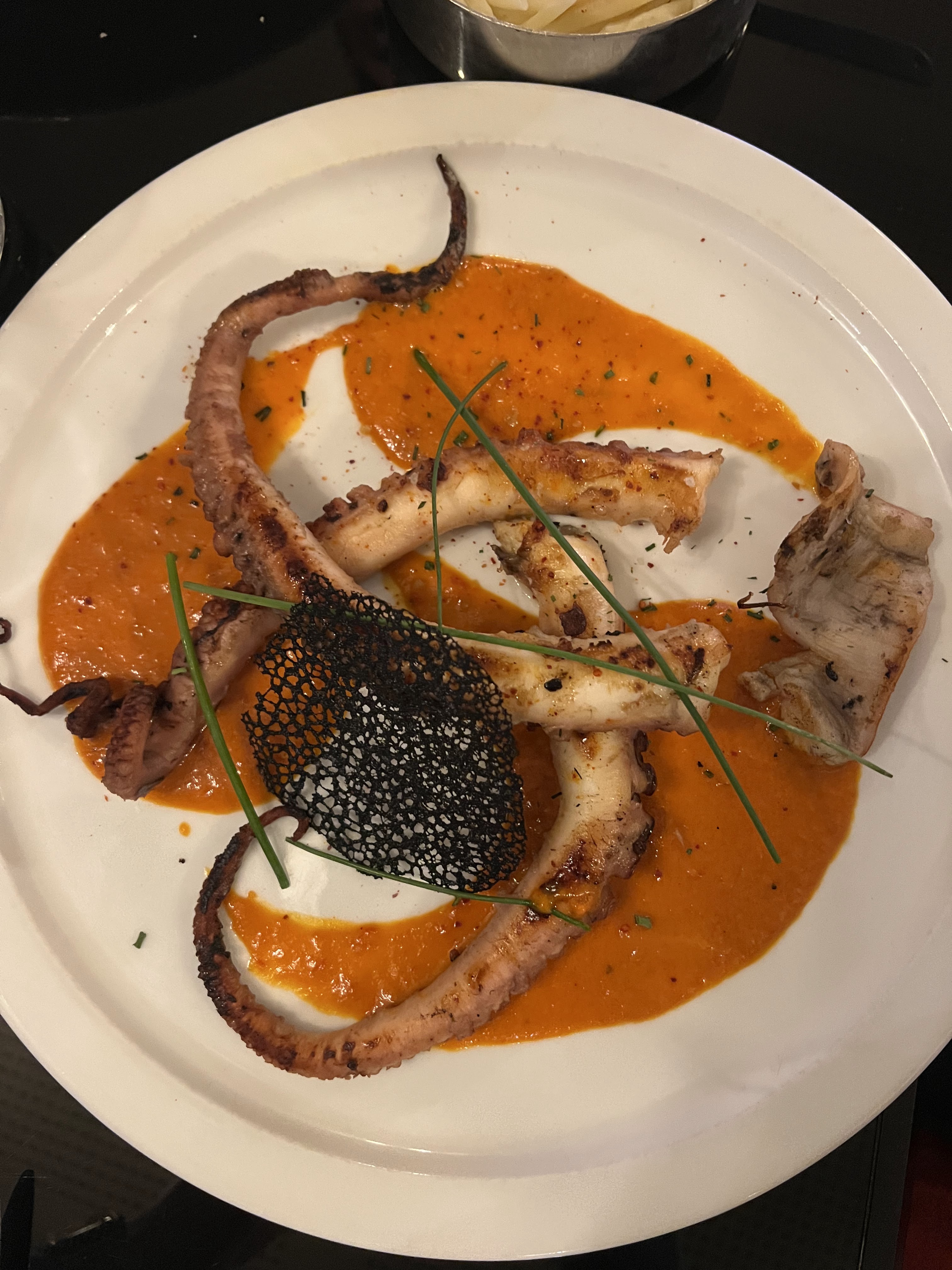 Souris d'agneau cuite mais pas confite comme écrit sur le menu. Bonne sauce à l'orange. Le poulpe était bon. Mais les 2 assiettes ont été servies dans des plats froids ce qui fait que ça a refroidi très vite. Personnel agréable. Le prix pourrait être un peu moins élevé.