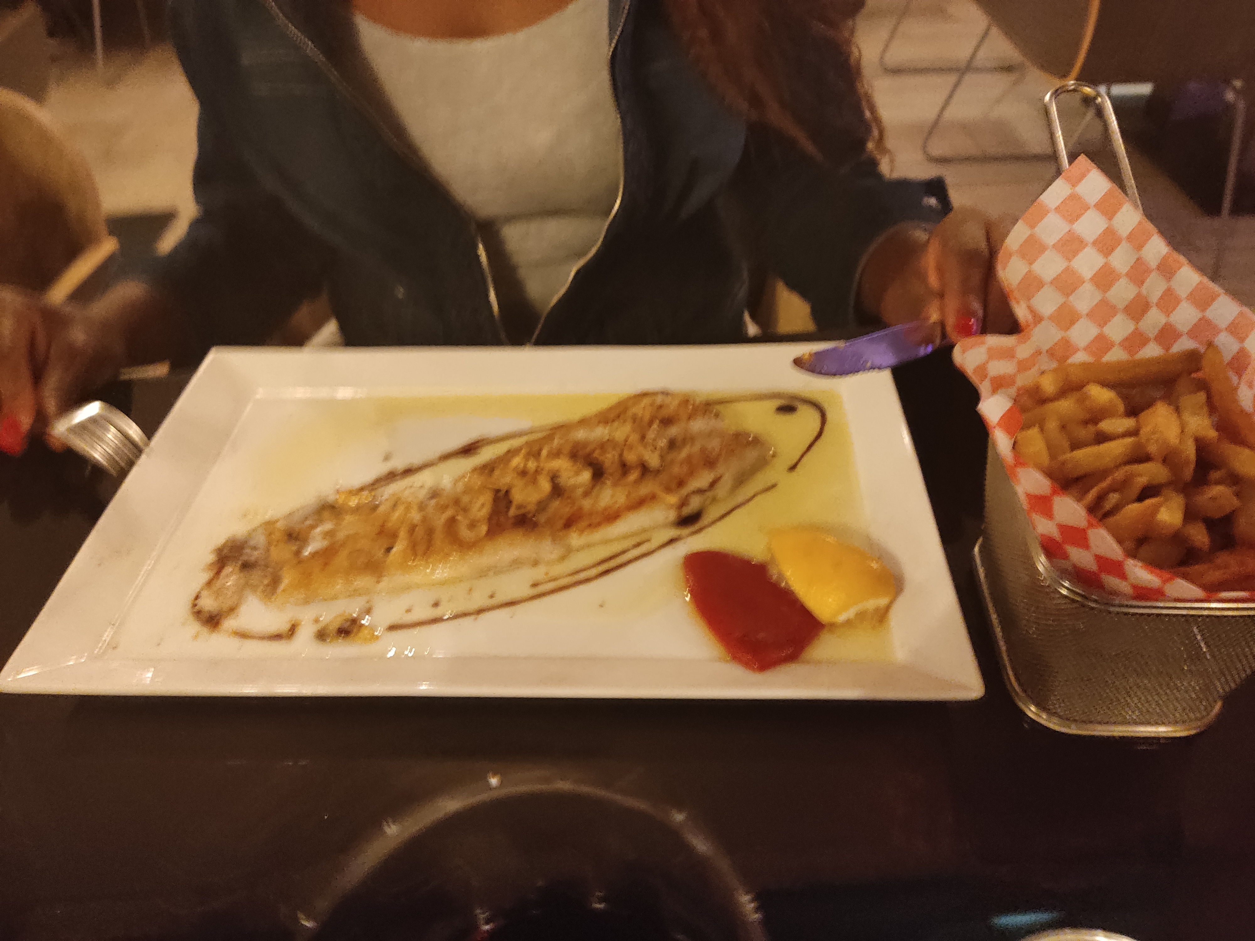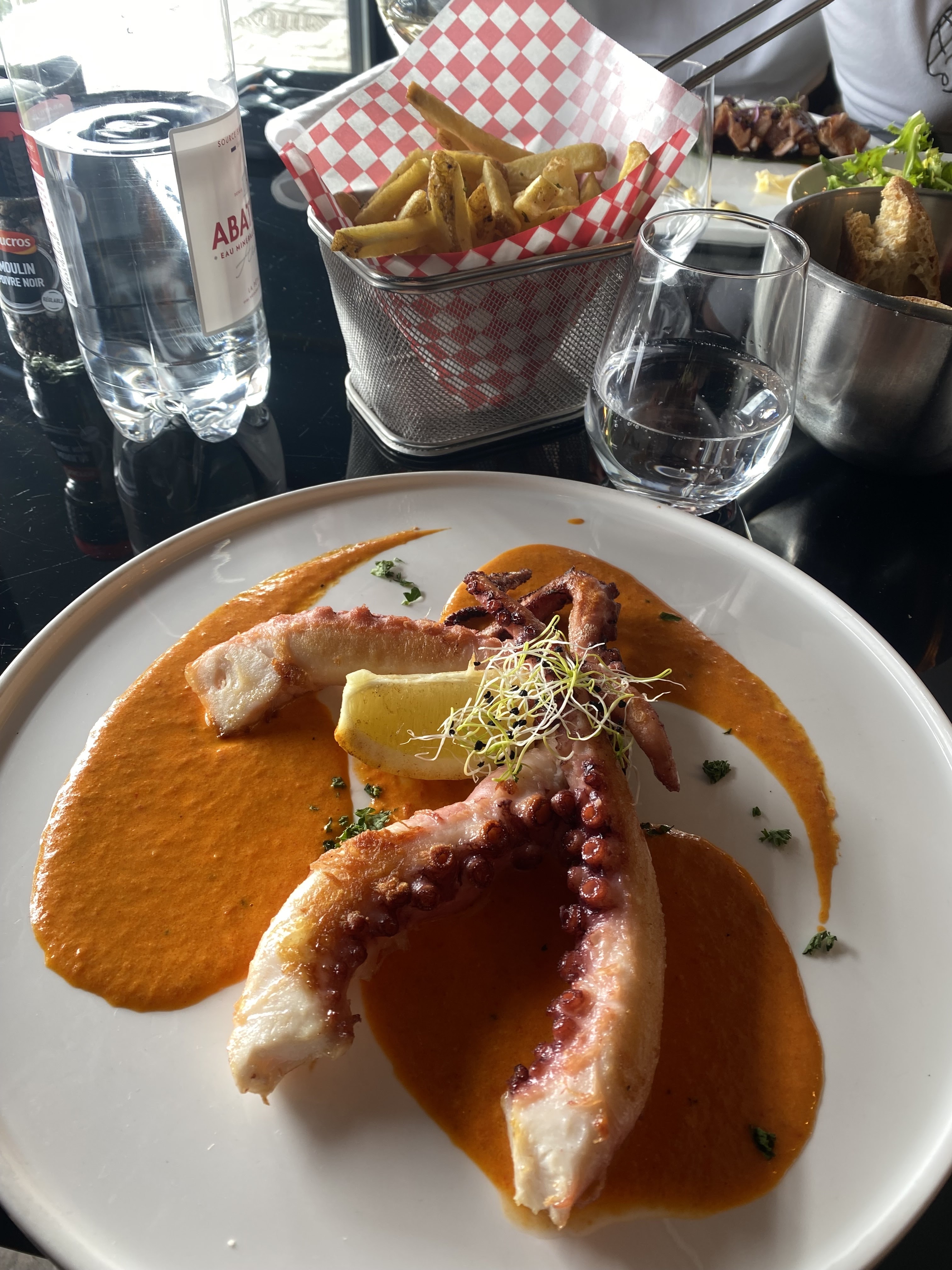 Un bon moment. Les plats sont vraiment très bons. Nous avons dégusté un camembert frit au miel et un os à moelle en entrée, puis un tataki de thon et du poulpe grillé en plat. Nous en avons eu pour 90 eur avec un verre de vin et 1L d’eau pétillante. Un peu cher. Service très sympathique et assez rapide. Gros bémols pour nous: les frites vraiment pas bonnes (certainement cuite puis re réchauffées avant d’être servies) et toilettes vraiment sales. Quel dommage !!!! Ça ne doit pas être compliqué d’améliorer ces deux points.