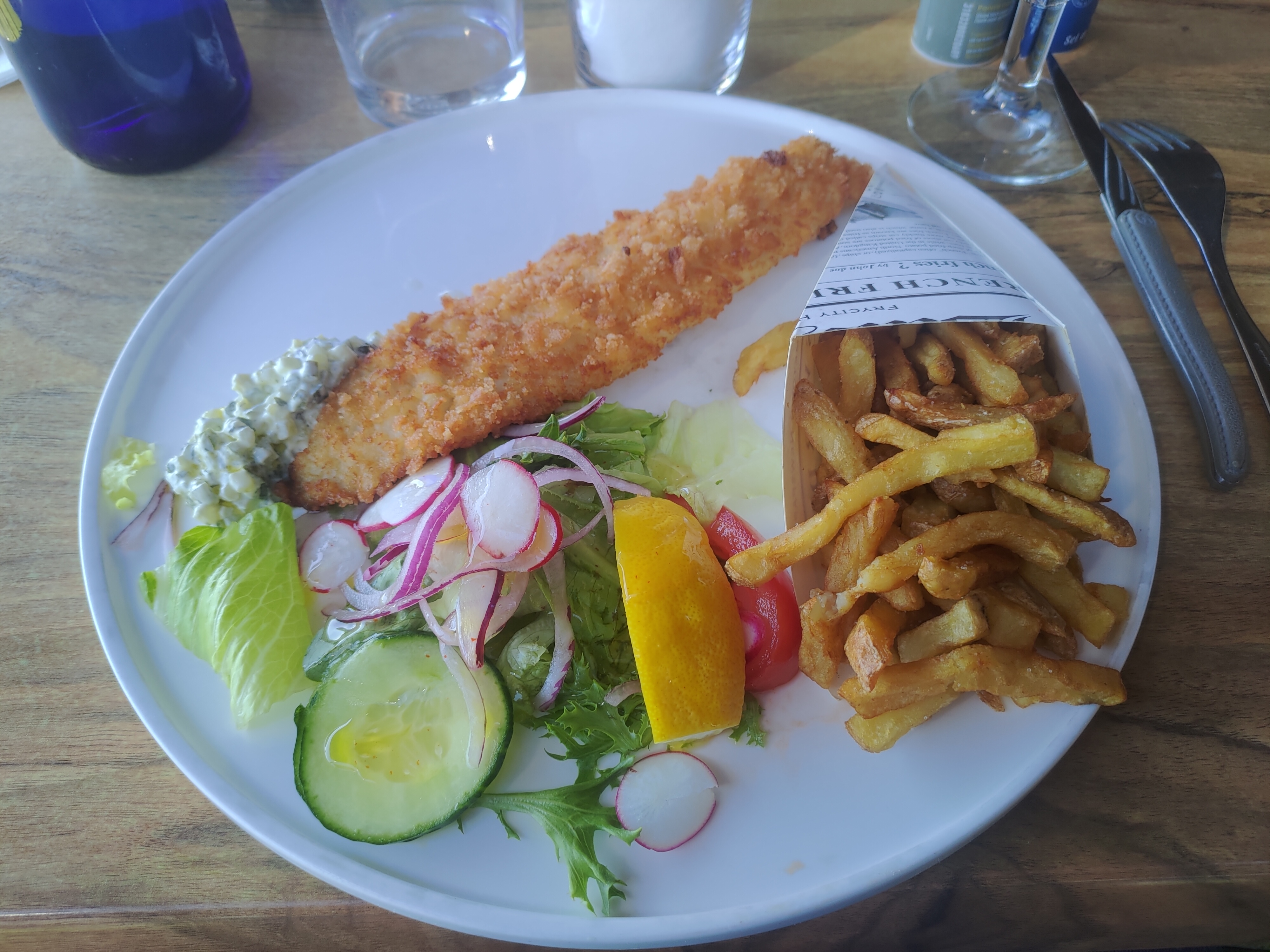 Nous avons commandées 2 salades très bonnes, rien à redire sur la qualité du repas. Par contre, je me suis rendue compte au bout d'une heure que j'étais assise sur une chaise pleine de colle.. autant vous dire que je me retrouve avec une belle marque de colle noire au niveau des fesses ! Peut être revoir l'entretien de l'extérieure..